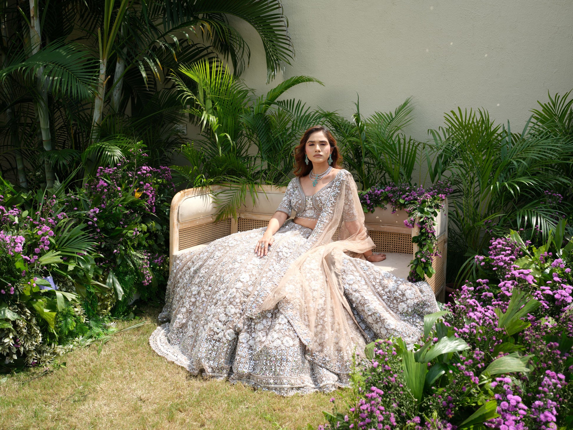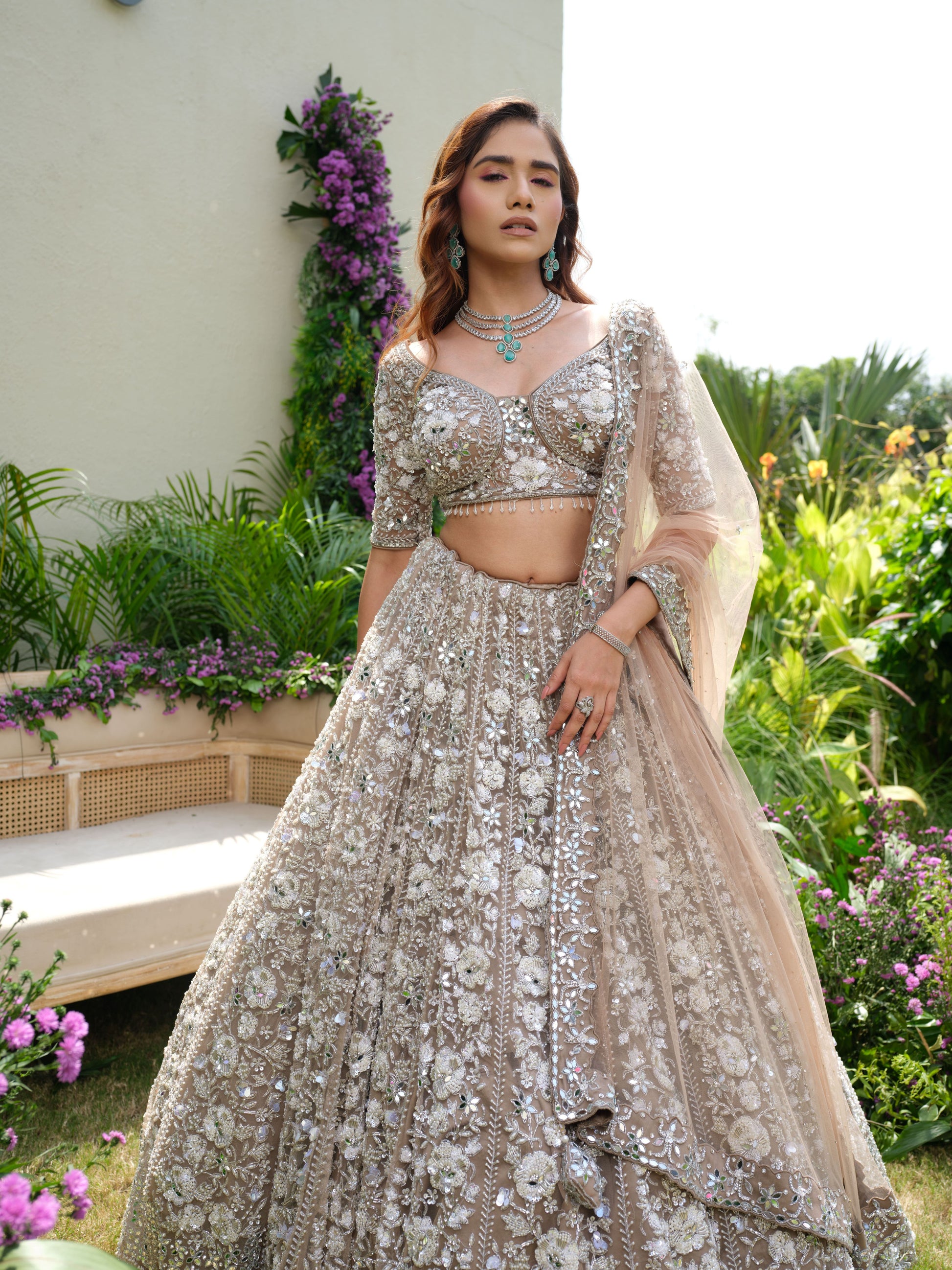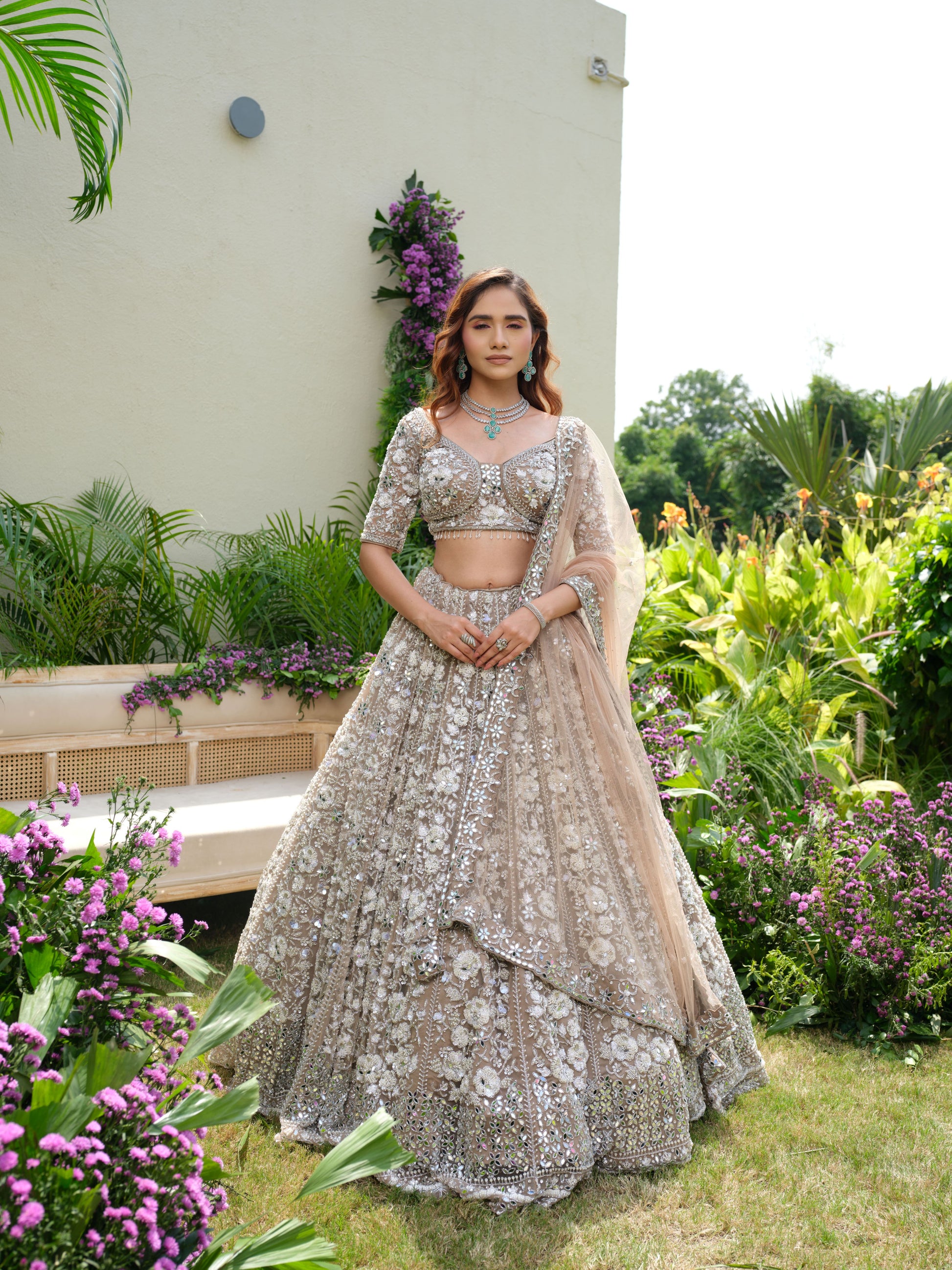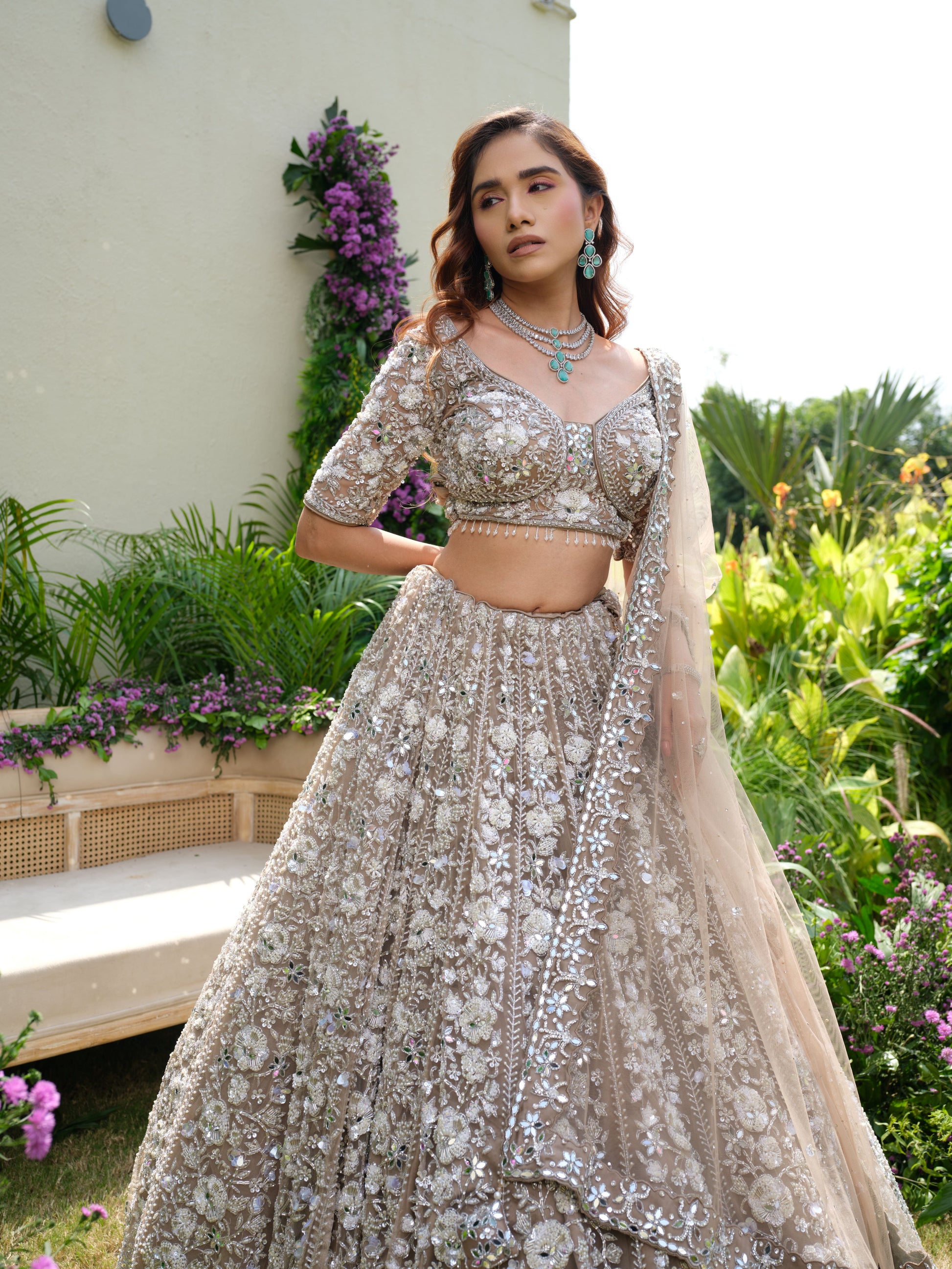 A dazzling silver grey lehenga set richly adorned with sequins, mirror work, and intricate thread embroidery. The blouse features a contemporary cut with a sweetheart neckline and elegant short sleeves, perfectly balanced with a voluminous skirt that shimmers in the light. Styled with a sheer dupatta edged with delicate embellishments, this ensemble radiates modern luxury with timeless elegance.