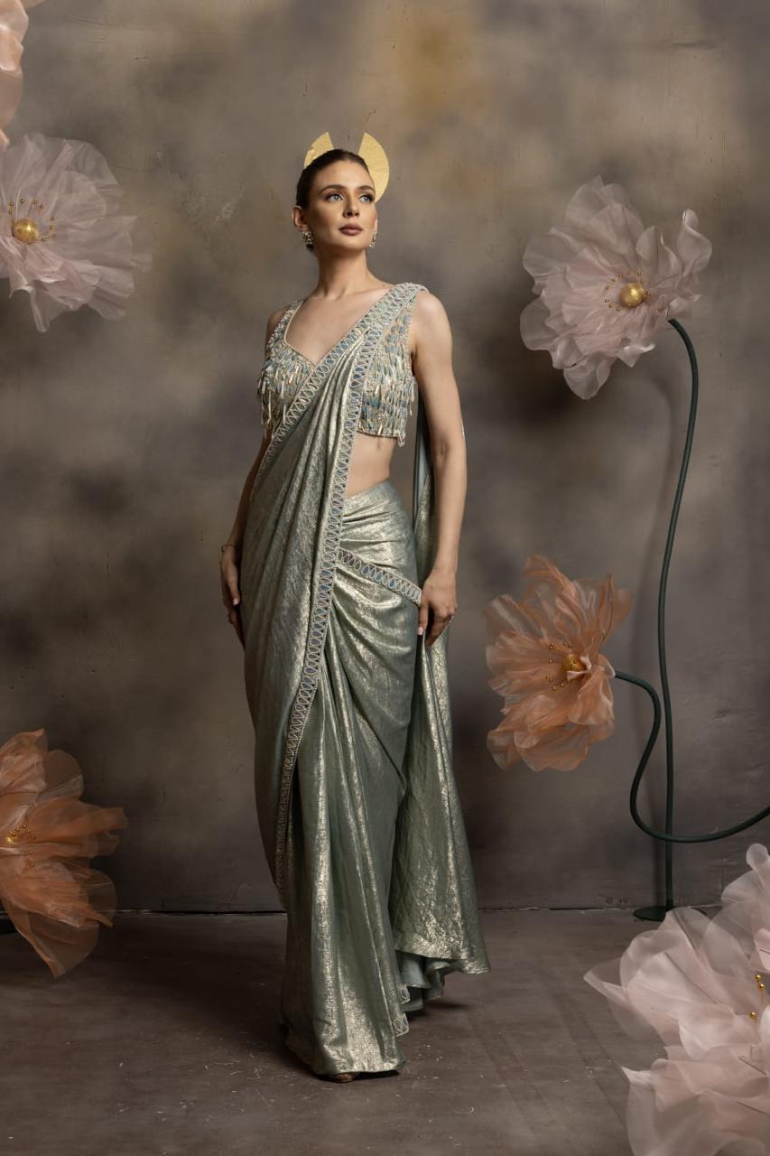 Graceful and luminous, this pre-draped saree in a unique mint-silver hue is a modern reinterpretation of timeless elegance. The metallic sheen fabric flows effortlessly, while the drape is highlighted with intricate borders that add subtle definition. The blouse, adorned with delicate beadwork and fringe detailing, brings a playful yet sophisticated touch, balancing glamour with fluidity. Its soft pastel tone, combined with the shimmer, makes this ensemble perfect for day-to-night transitions, radiating understated luxury.