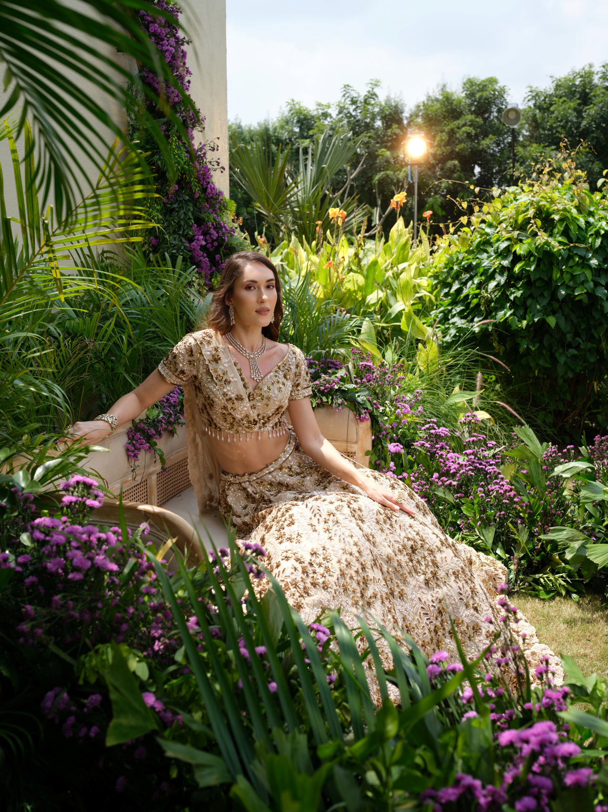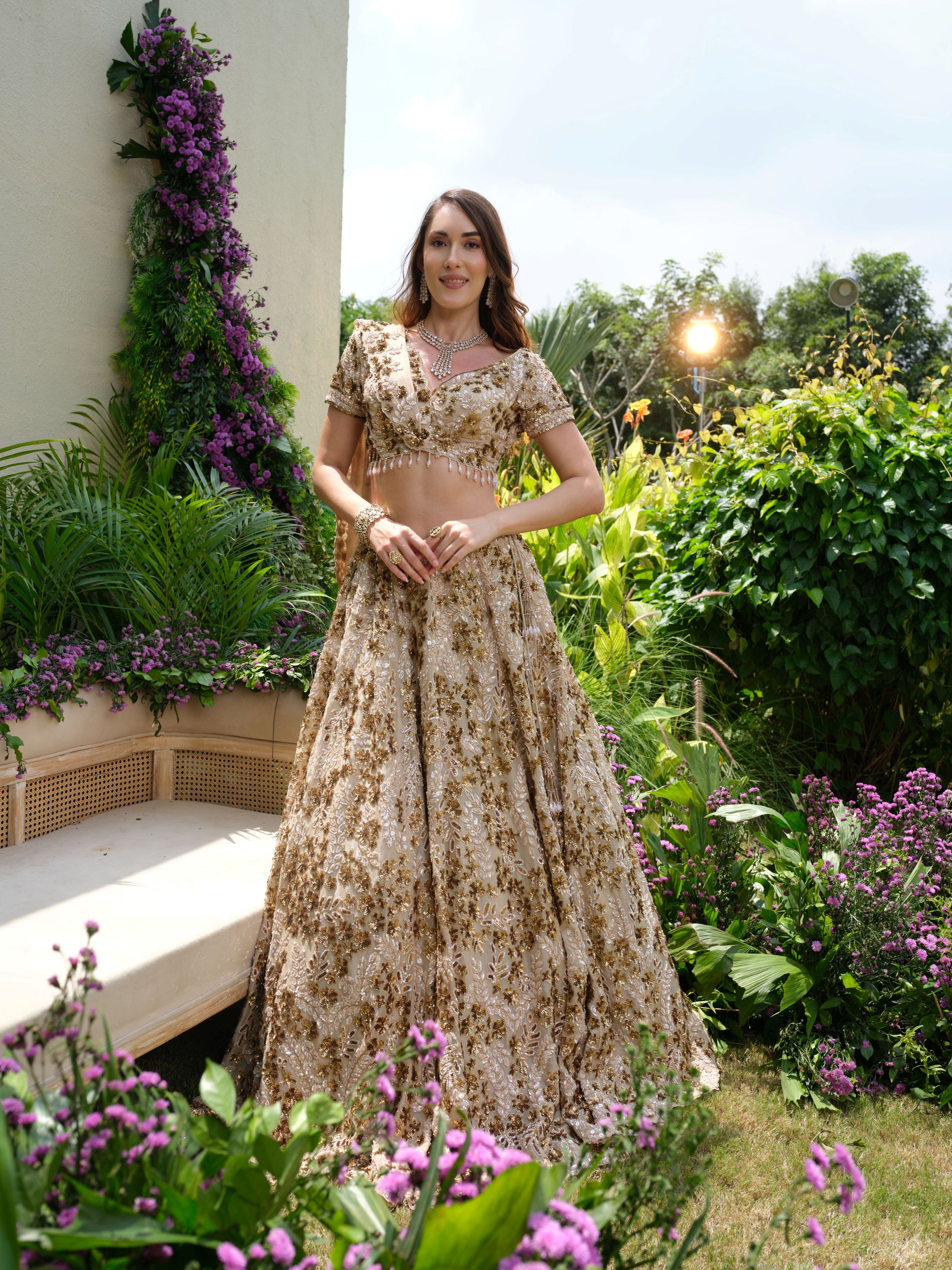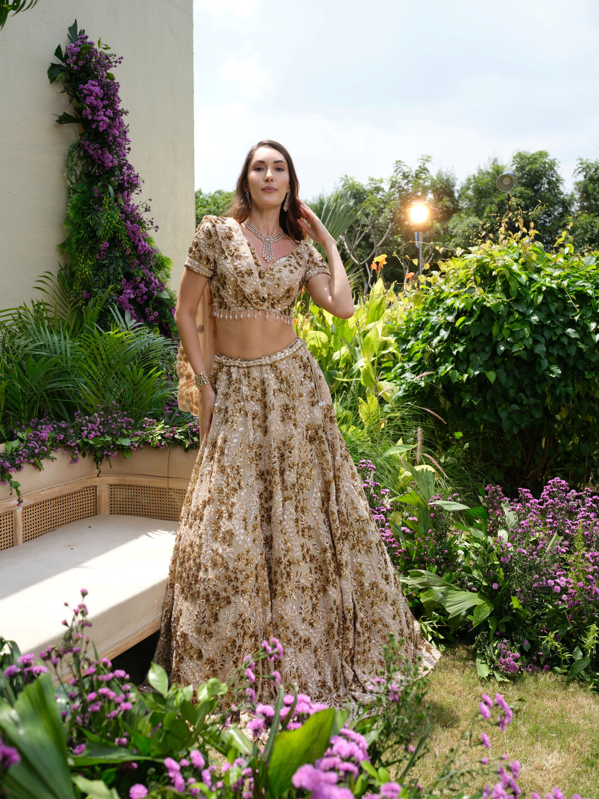 A stunning embellished lehenga set featuring intricate floral embroidery in golden and olive tones. The blouse is designed with delicate beadwork and tassel detailing along the hemline, paired with a voluminous flowy skirt that exudes grandeur. Crafted with rich textures and elegant motifs, this ensemble perfectly blends traditional artistry with contemporary charm.