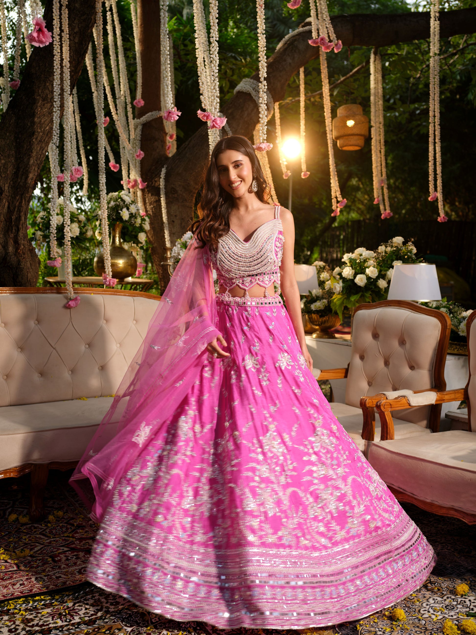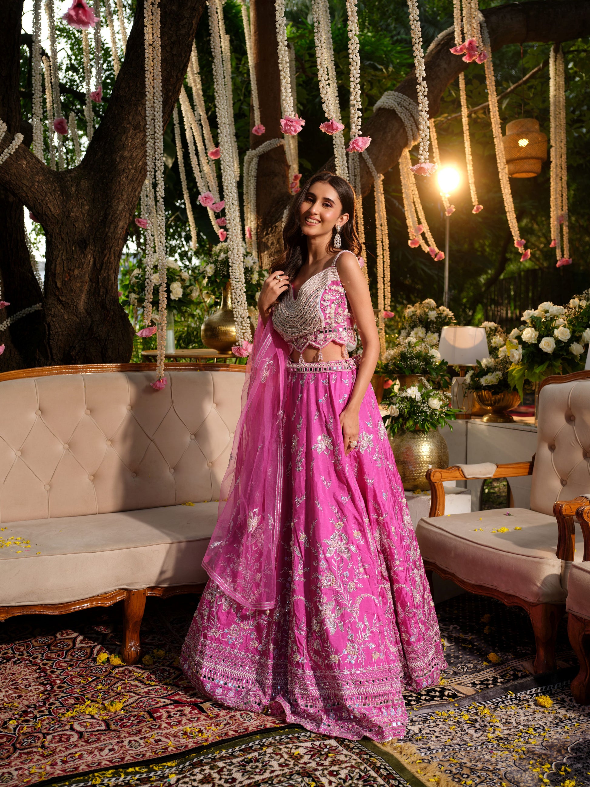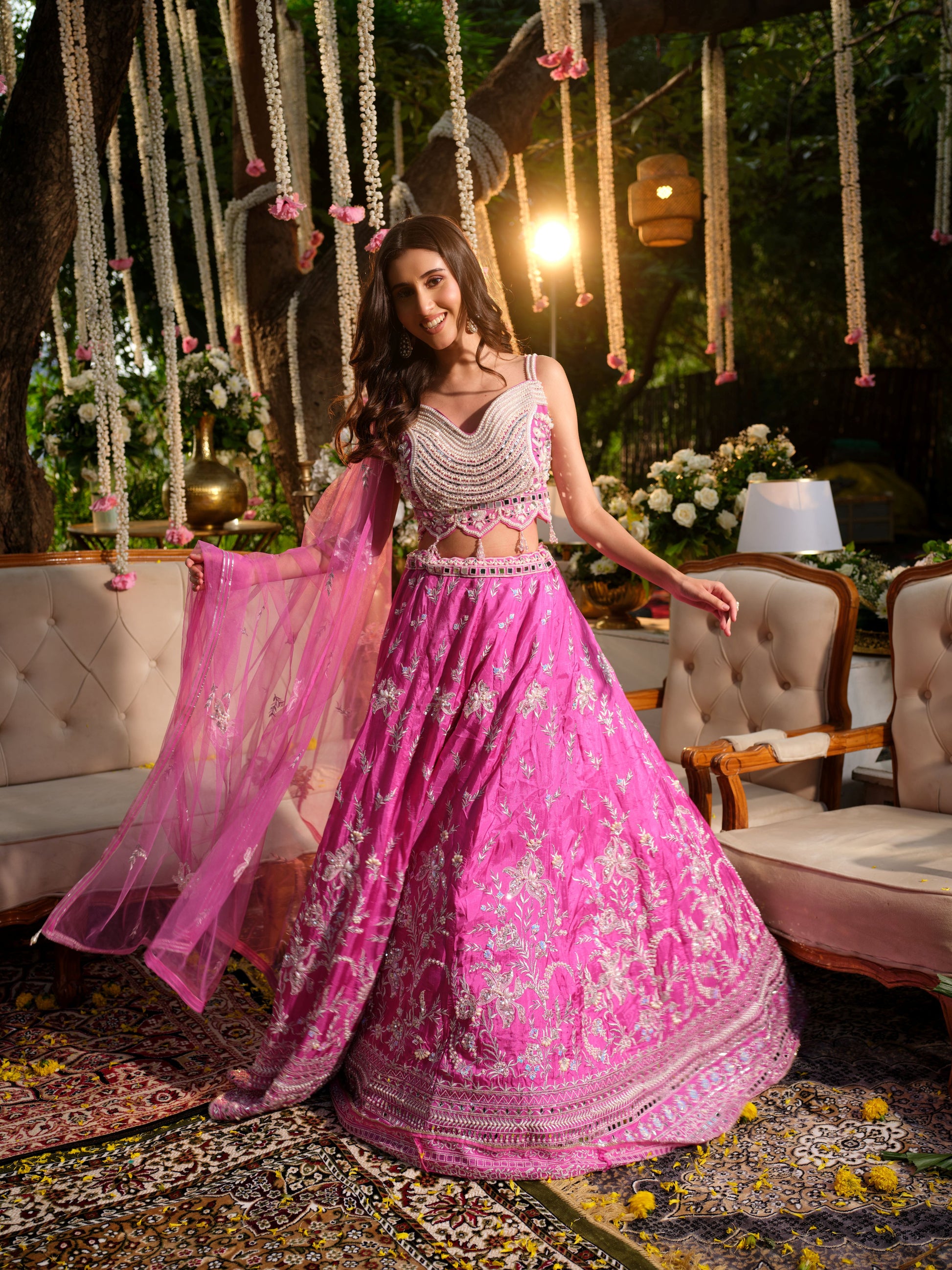 Make a radiant statement in this fuchsia pink lehenga set, crafted with intricate silver threadwork, mirror embellishments, and delicate sequins. The voluminous lehenga paired with a heavily adorned blouse strikes the perfect balance between grandeur and elegance. A soft net dupatta with subtle detailing enhances the overall charm, creating a look that is both regal and romantic.This ensemble is designed to make you shine at every occasion.