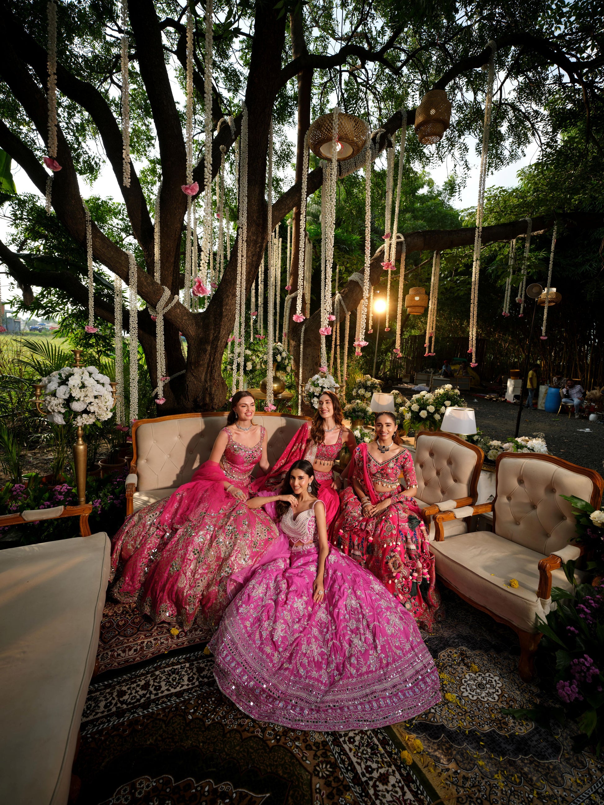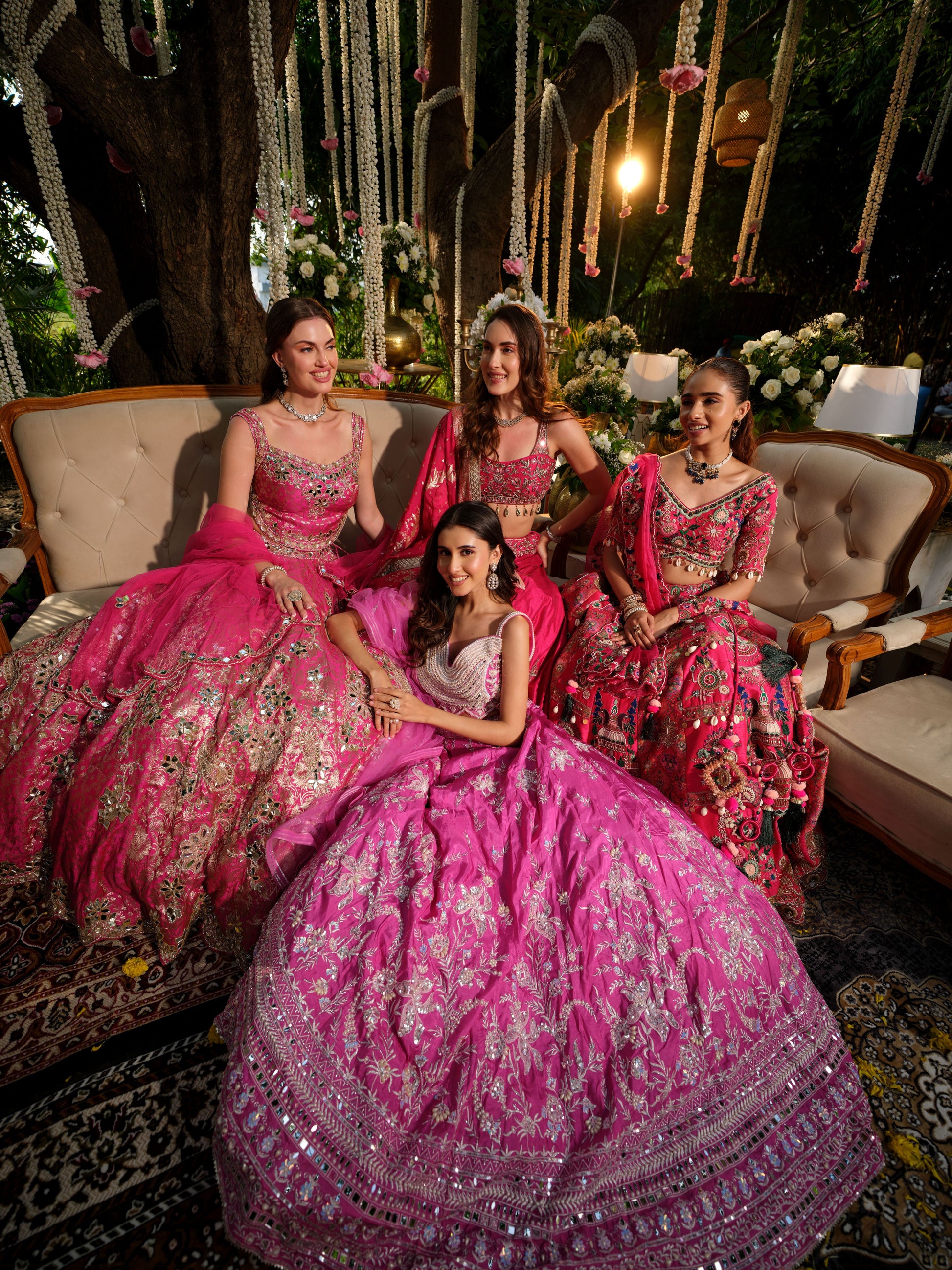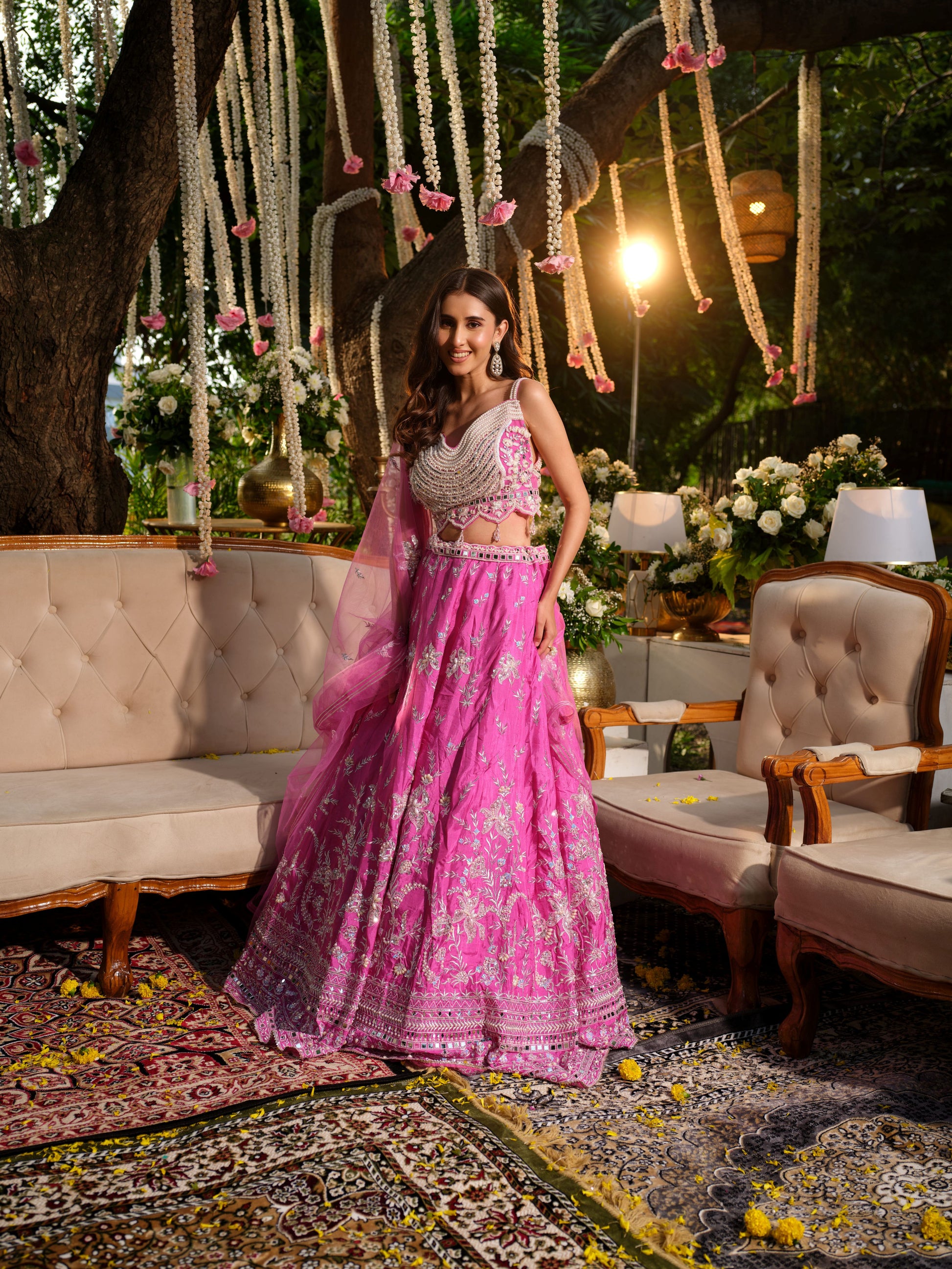 Make a radiant statement in this fuchsia pink lehenga set, crafted with intricate silver threadwork, mirror embellishments, and delicate sequins. The voluminous lehenga paired with a heavily adorned blouse strikes the perfect balance between grandeur and elegance. A soft net dupatta with subtle detailing enhances the overall charm, creating a look that is both regal and romantic.This ensemble is designed to make you shine at every occasion.