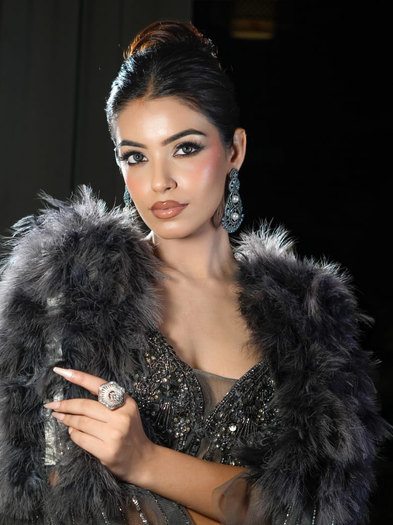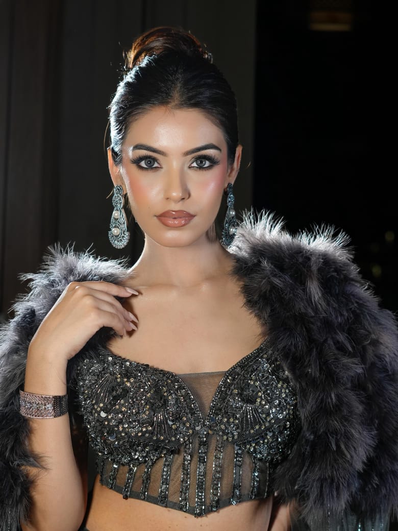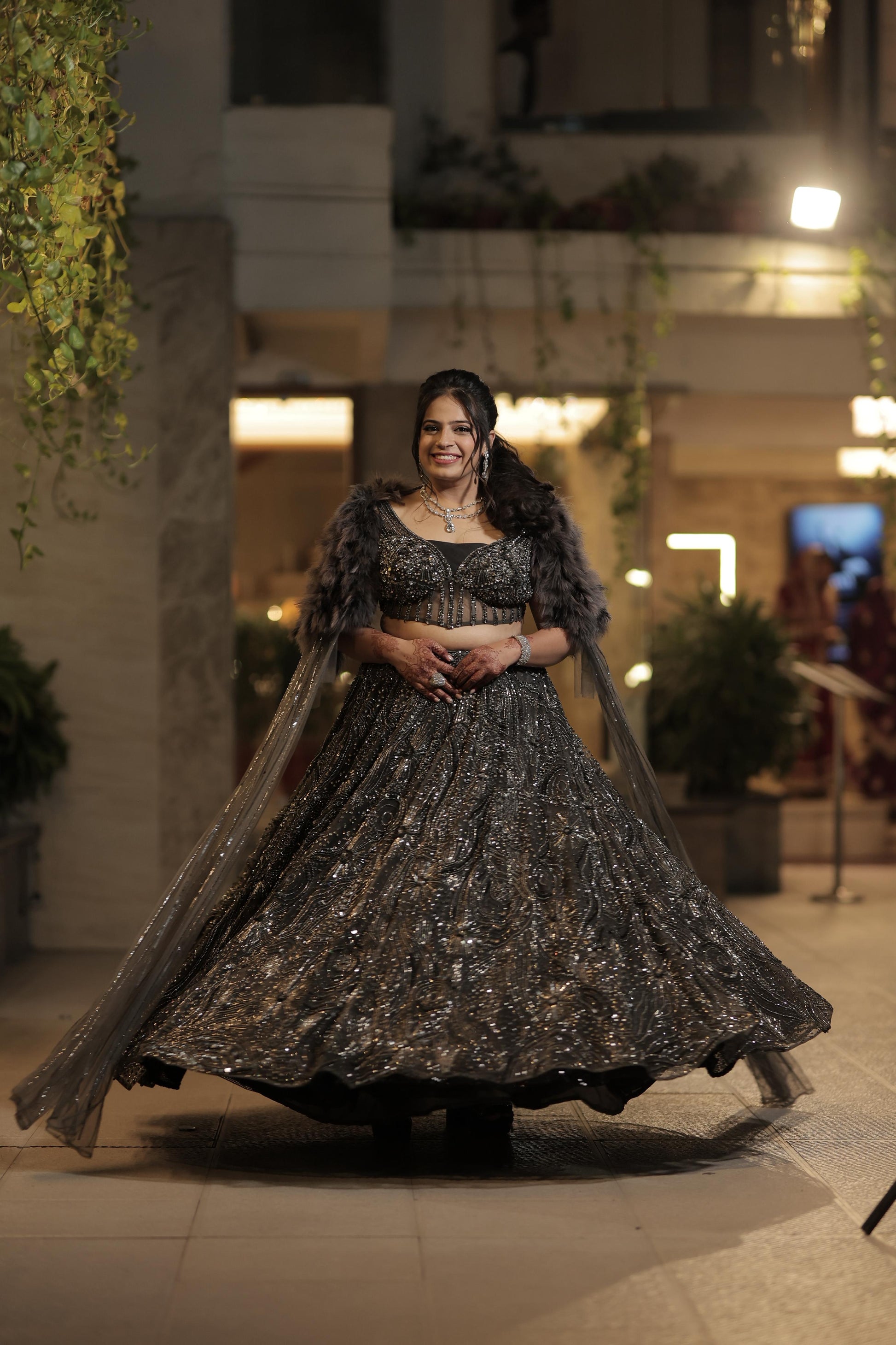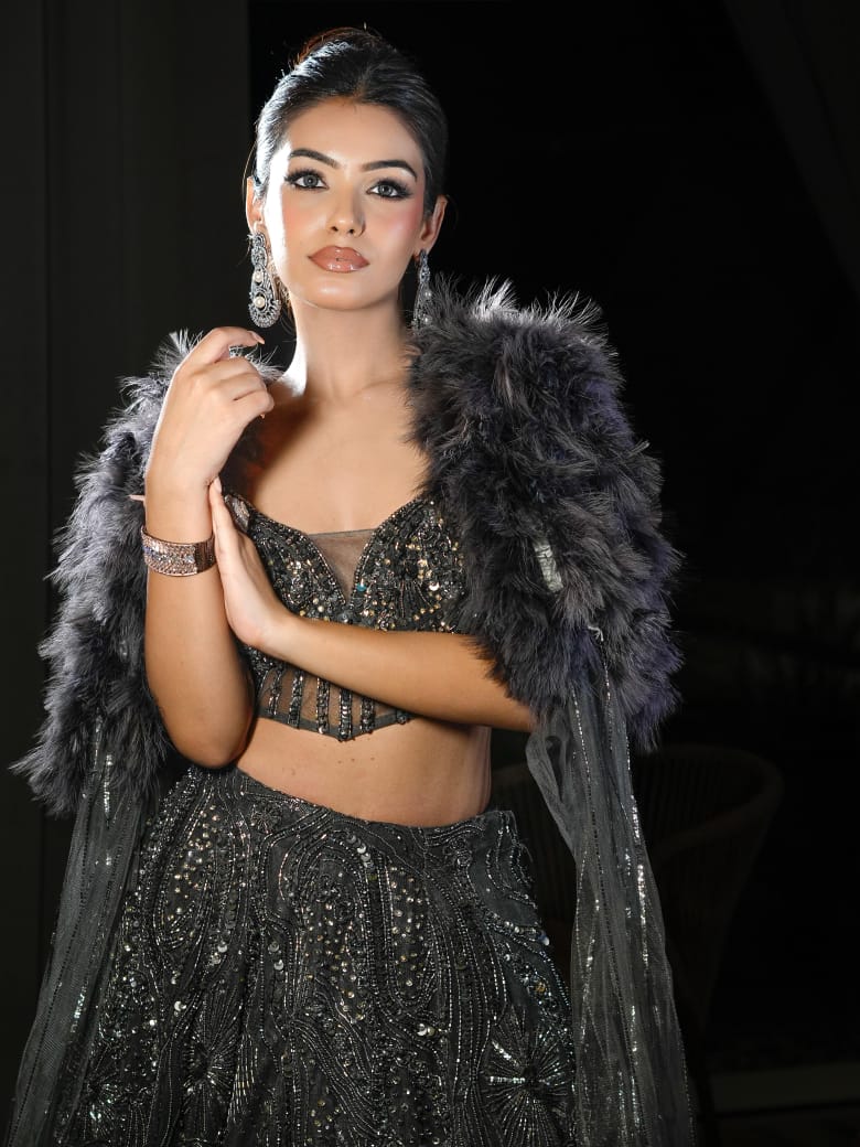 Turn heads with this exquisite charcoal grey embellished lehenga set, crafted for the modern diva who loves to make a statement. The intricate sequin and thread embroidery on the lehenga paired with a plunging neckline blouse exudes bold elegance. The look is elevated with a dramatic fur-trimmed cape dupatta that adds regality and glamour, perfect for evening celebrations.