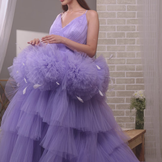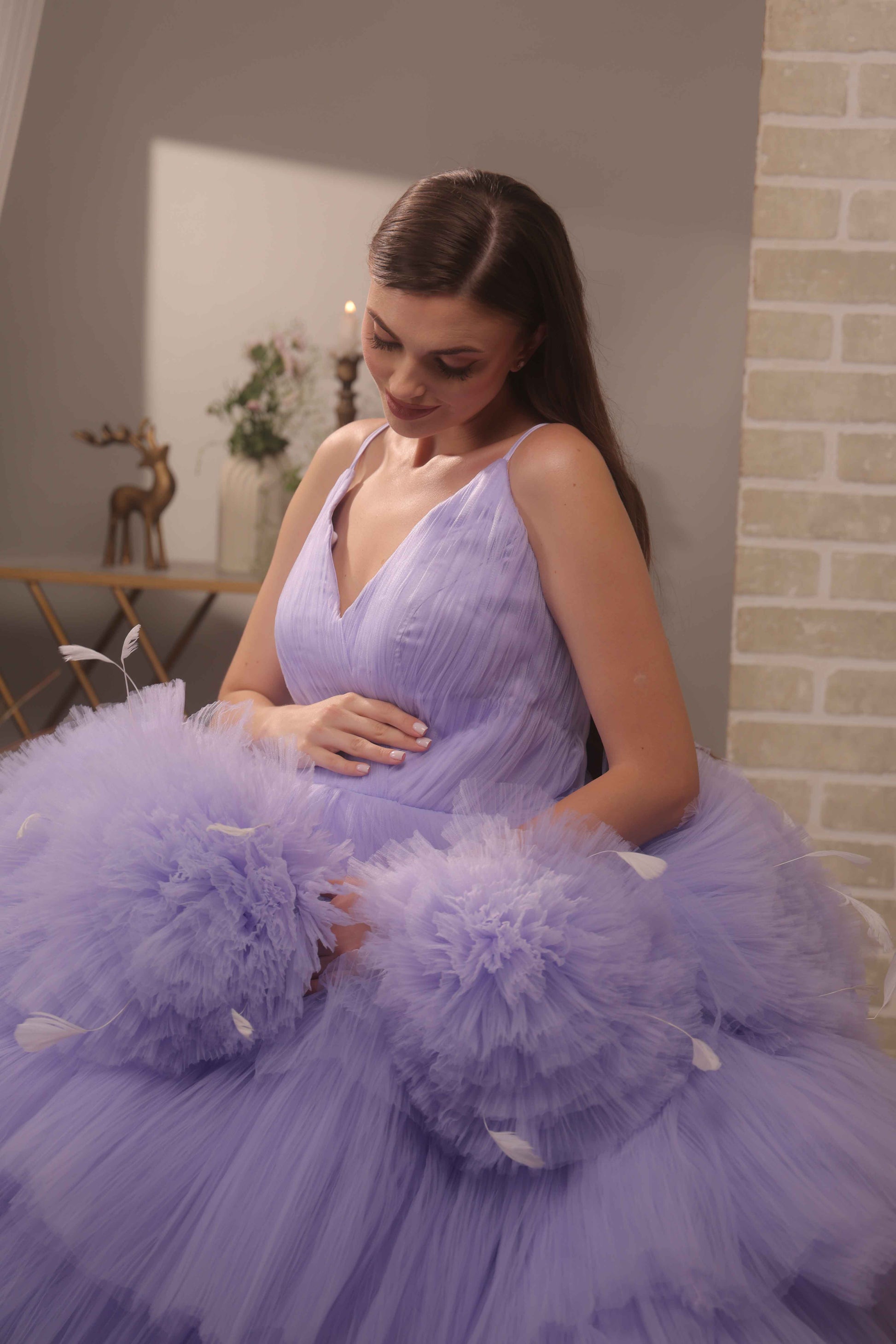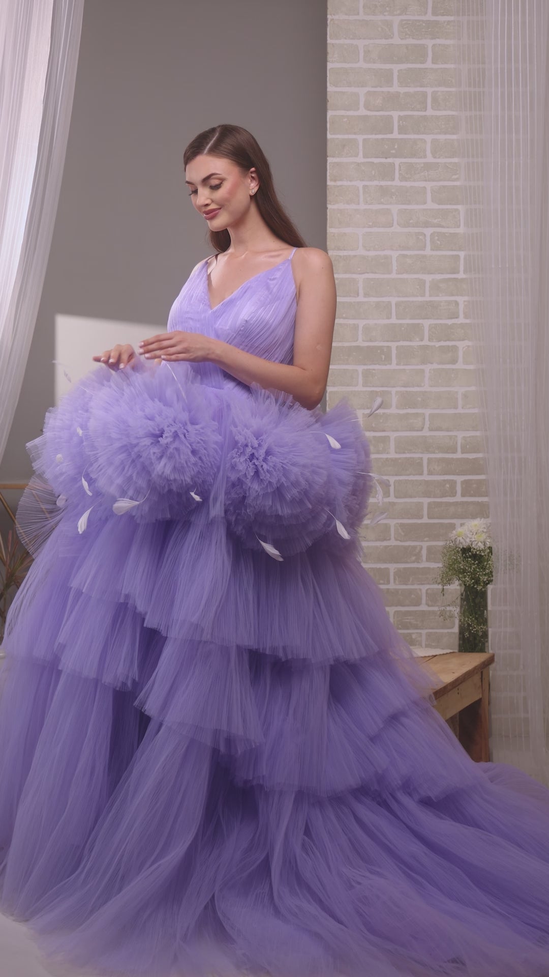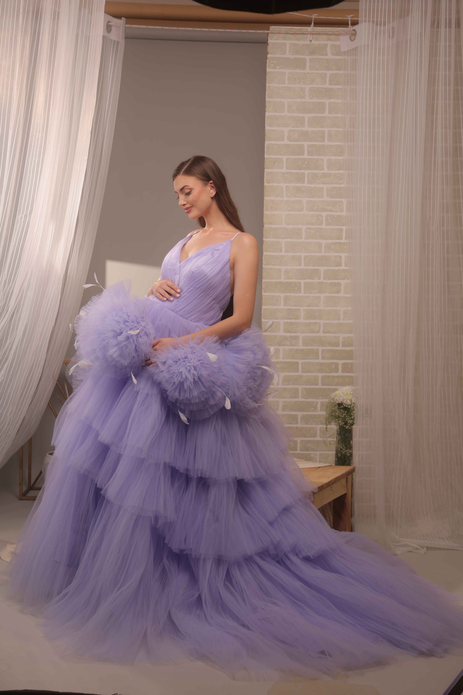 Experience ethereal beauty with our Blooming Joy maternity gown. This whimsical gown features soft lavender tulle layers, creating a voluminous, fairytale-like silhouette. Adorned with delicate flower appliqués, this gown is designed to make you feel both graceful and radiant during your maternity photoshoot or baby shower.