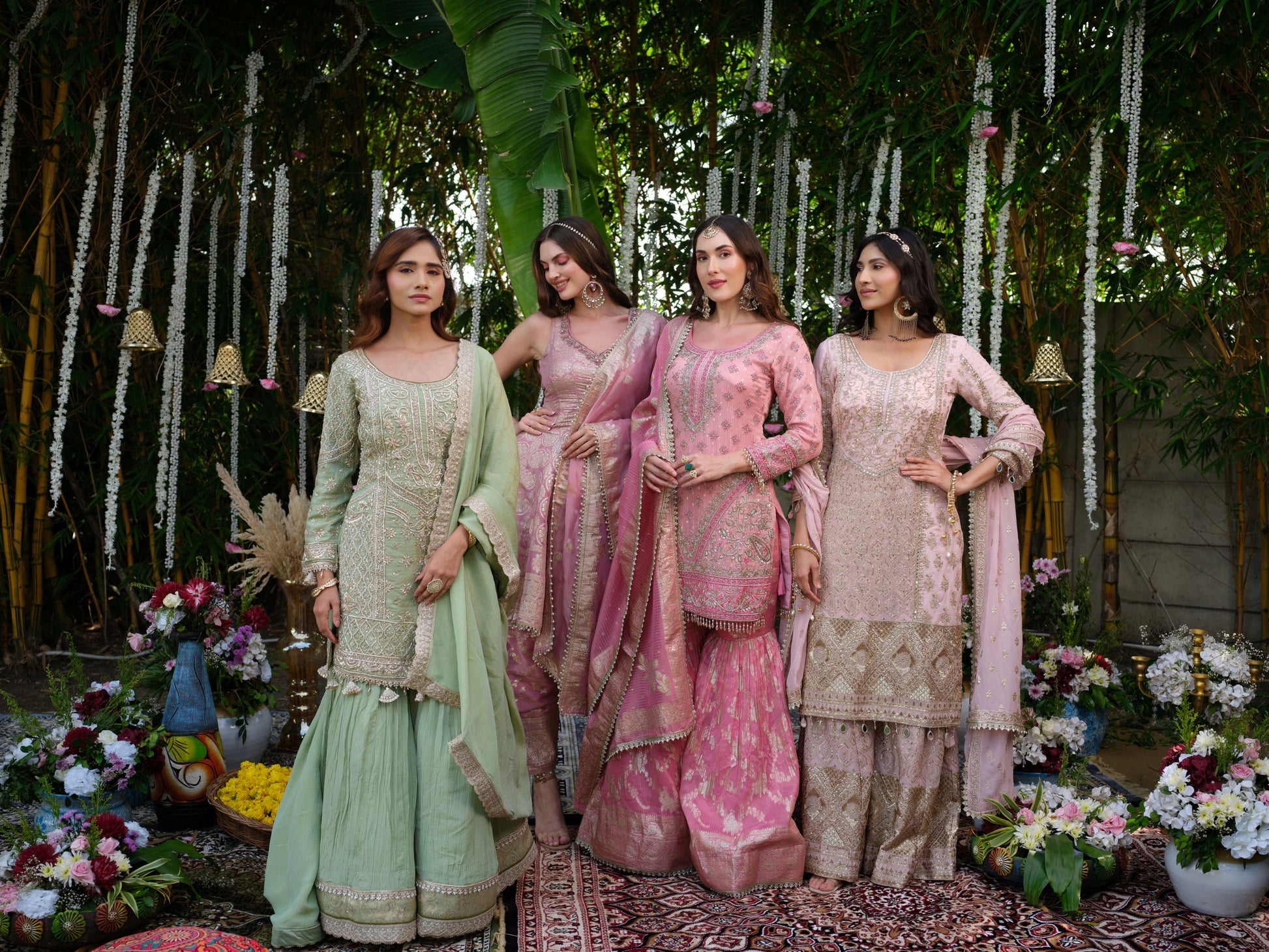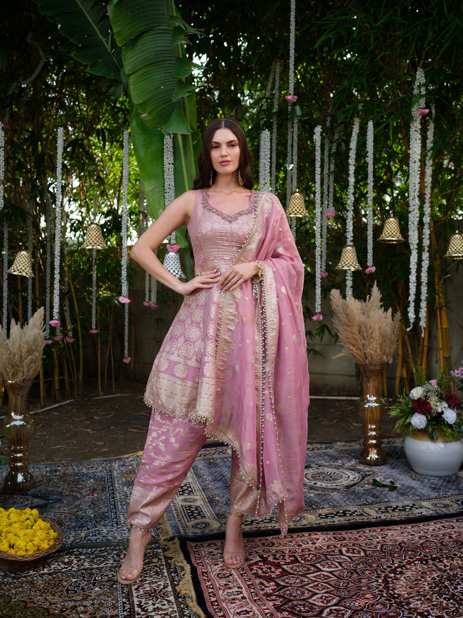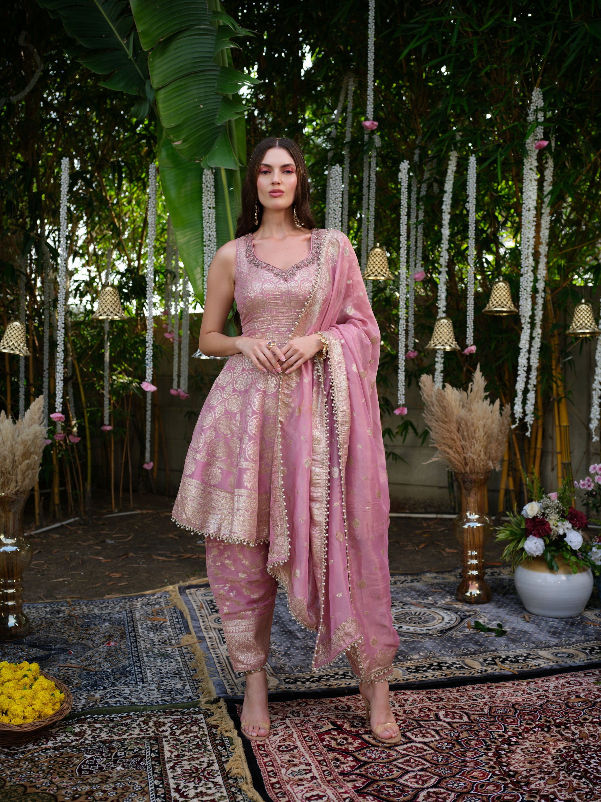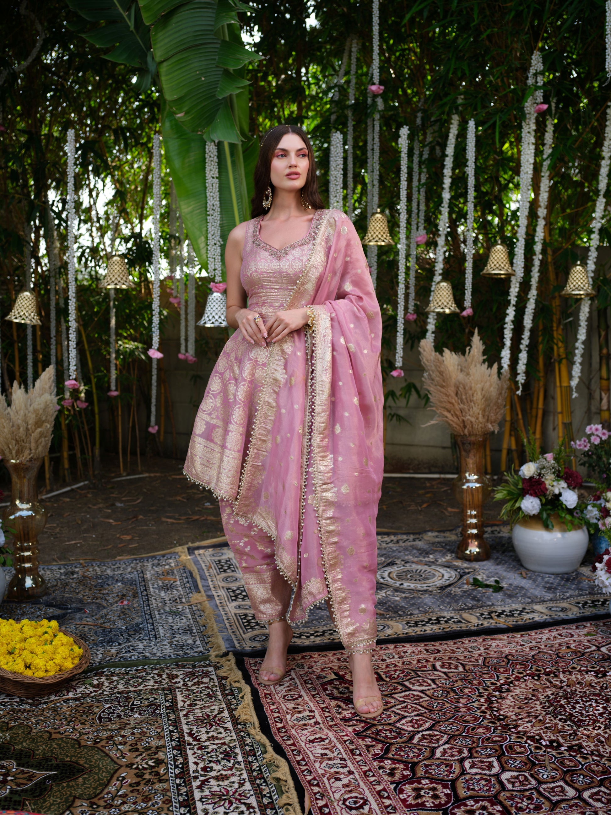 A timeless beauty, this blush pink Banarasi Anarkali features intricate golden zari weaving that exudes regal charm. Paired with matching churidar pants and a delicately bordered dupatta, the ensemble reflects a perfect balance of tradition and sophistication. Ideal for weddings, festive gatherings, or elegant evening celebrations.