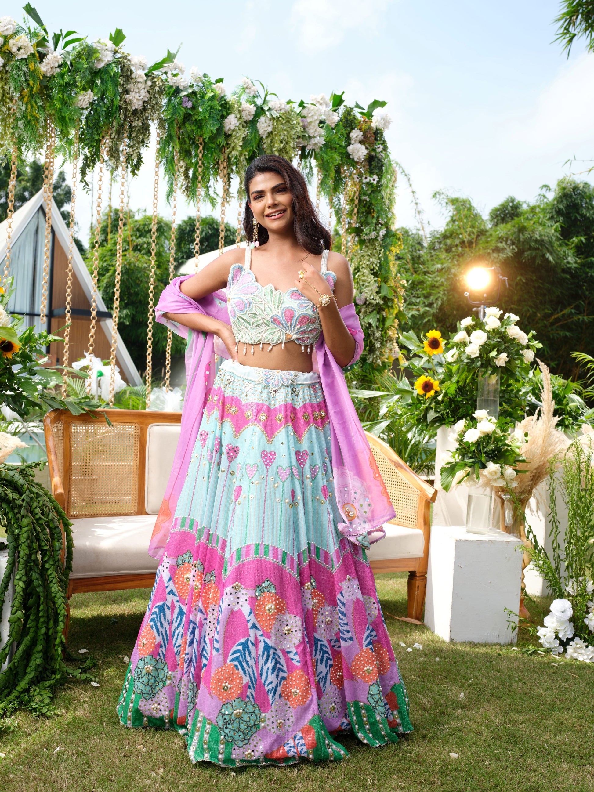 A refreshing aqua blue lehenga with playful pops of pink, lilac, and green, detailed with bold floral and geometric prints. The strappy blouse features pastel embroidery and bead highlights, while the flared skirt bursts with vibrant patterns, making it a standout piece. Paired with a lilac dupatta, this ensemble radiates youthful energy and contemporary charm.