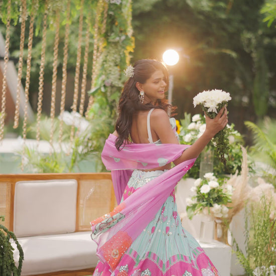 A refreshing aqua blue lehenga with playful pops of pink, lilac, and green, detailed with bold floral and geometric prints. The strappy blouse features pastel embroidery and bead highlights, while the flared skirt bursts with vibrant patterns, making it a standout piece. Paired with a lilac dupatta, this ensemble radiates youthful energy and contemporary charm.