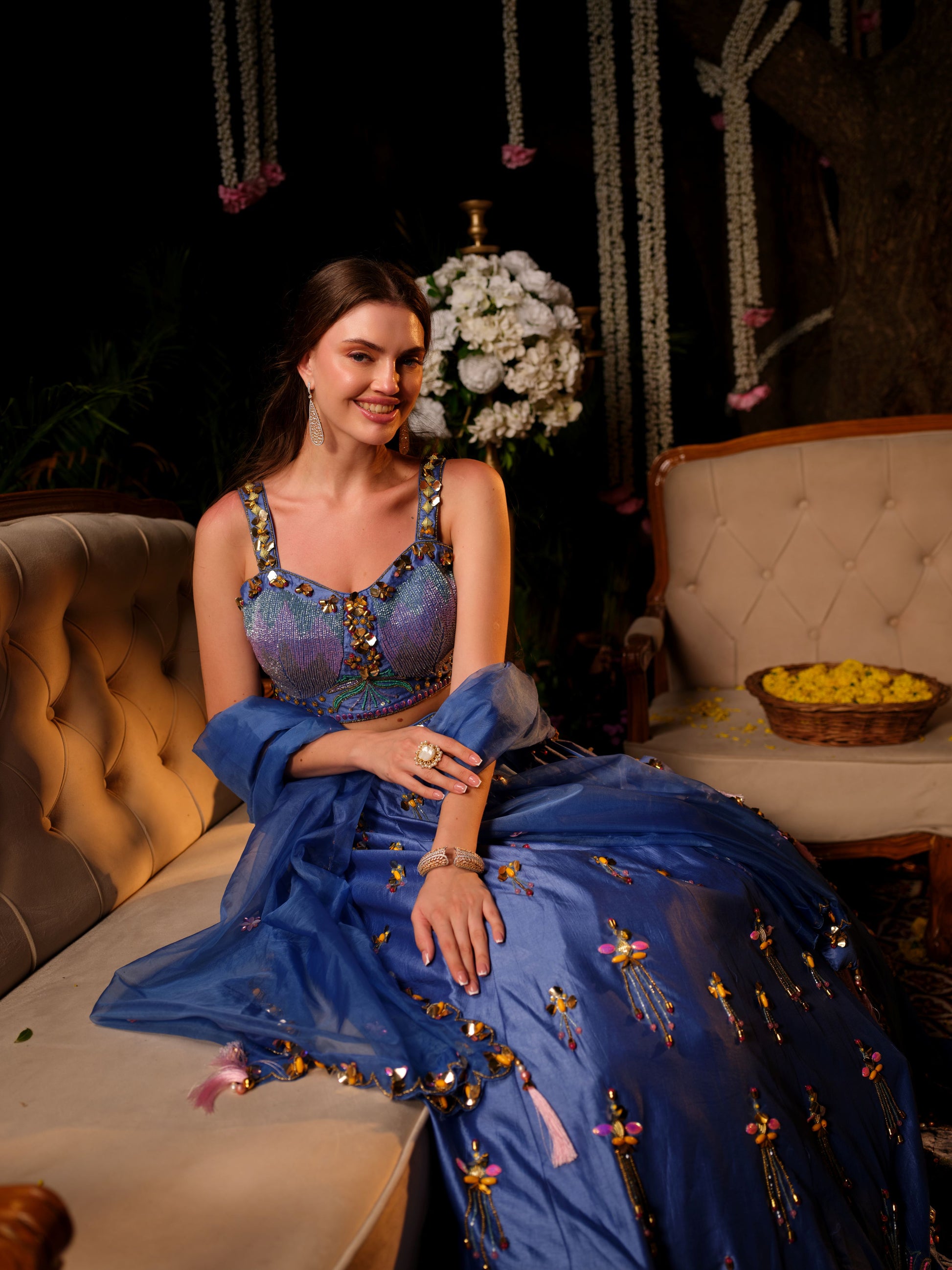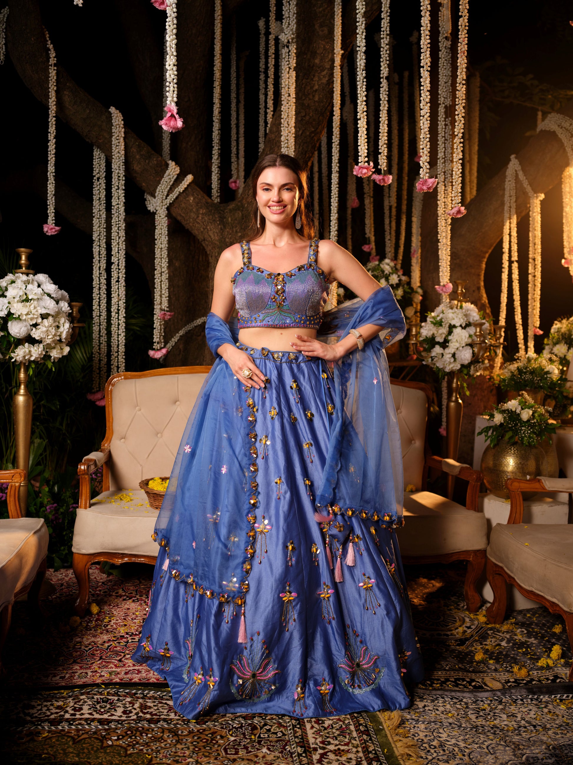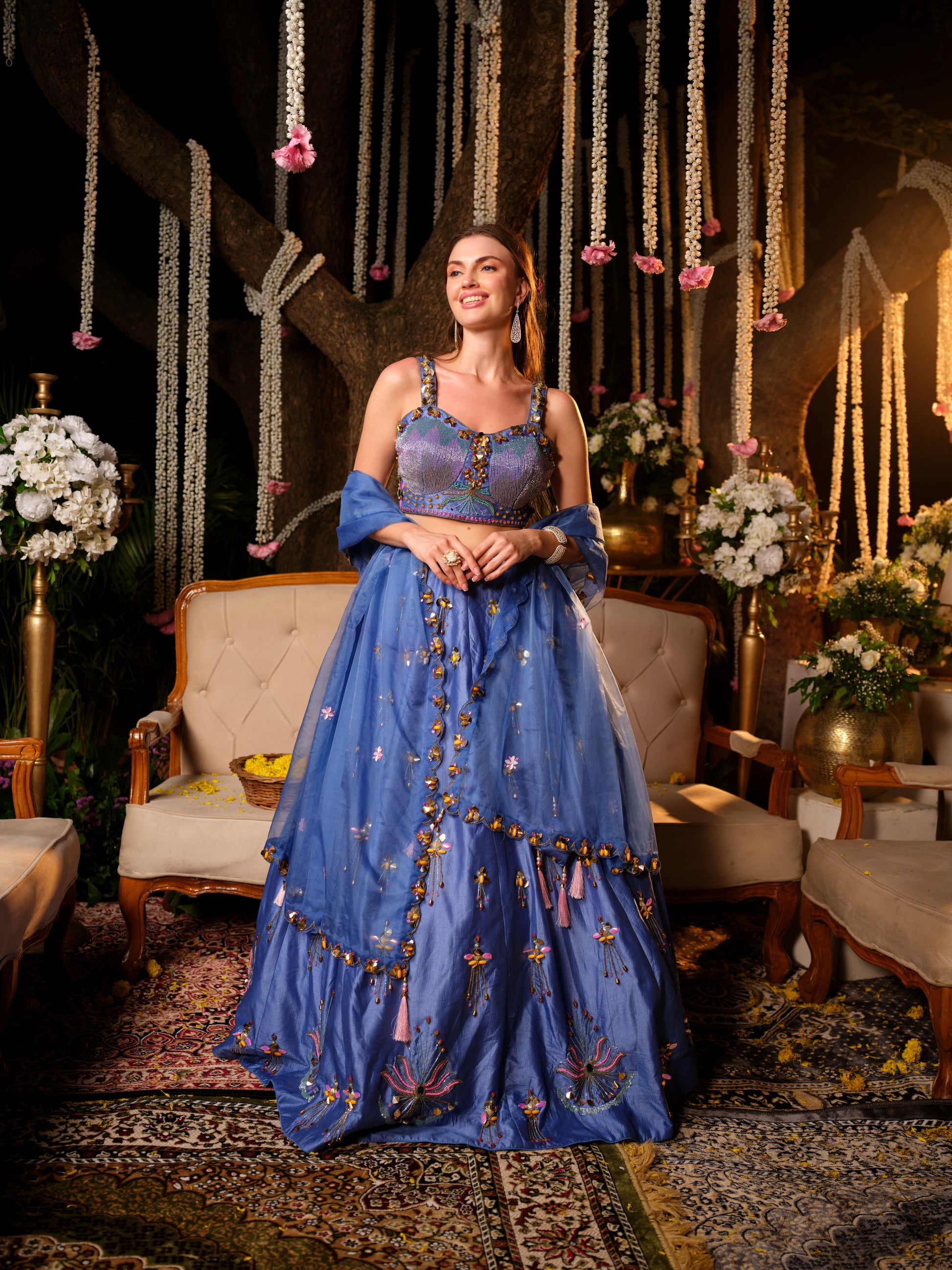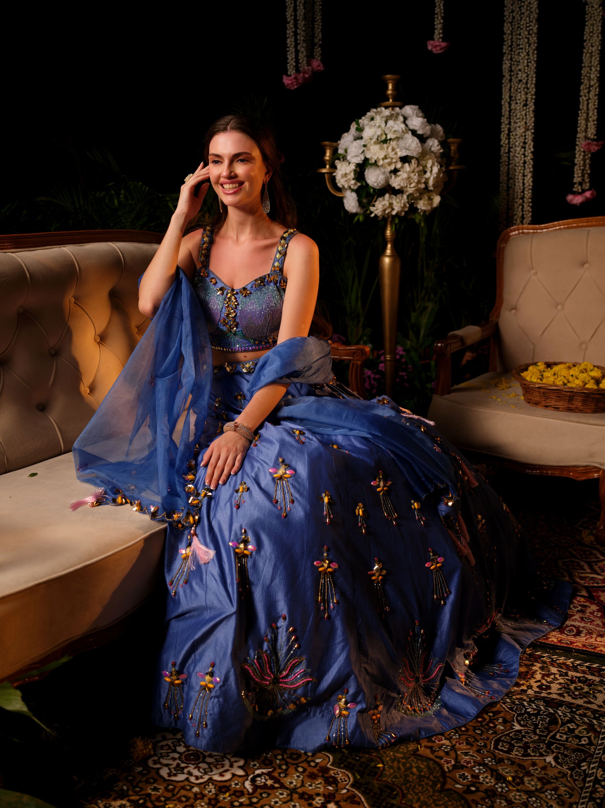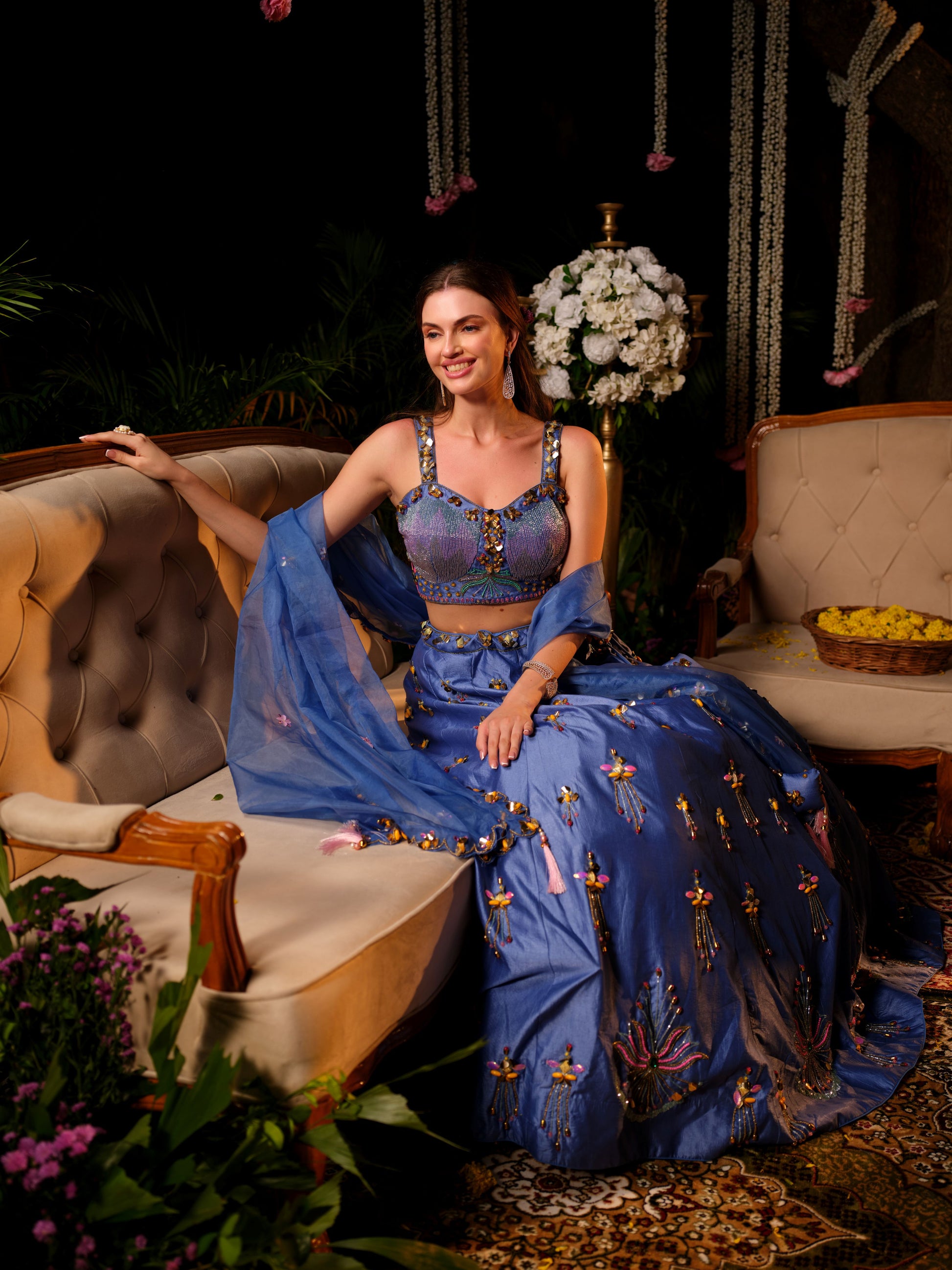 A whimsical powder blue lehenga set that captures the essence of modern charm and playful elegance. The blouse features intricate thread and sequin work with vibrant accents, while the skirt is adorned with dainty floral embroidery and delicate tassel details. The dupatta, embellished with floral appliqué and light shimmer, adds a graceful finishing touch, making this ensemble truly enchanting.
