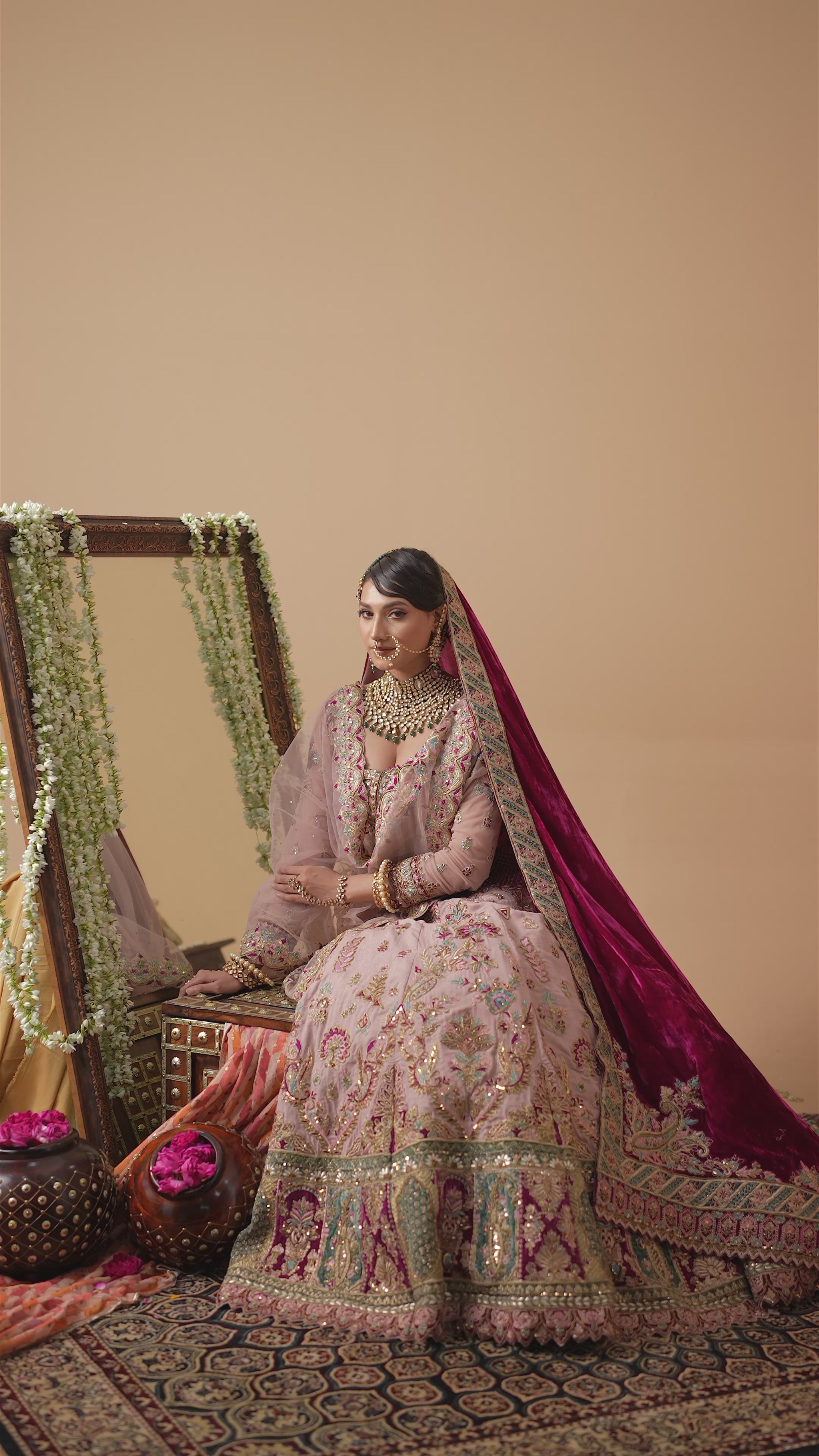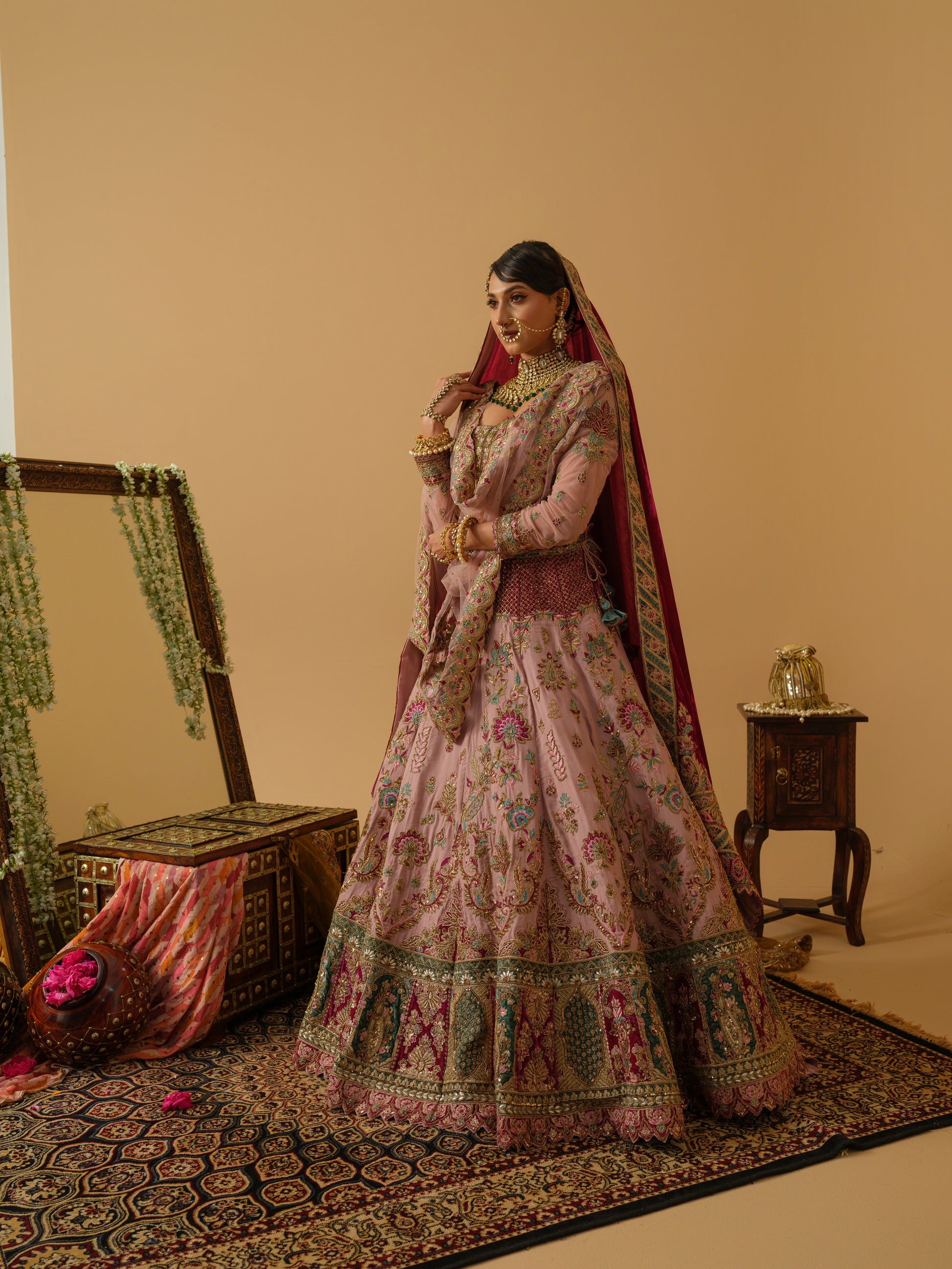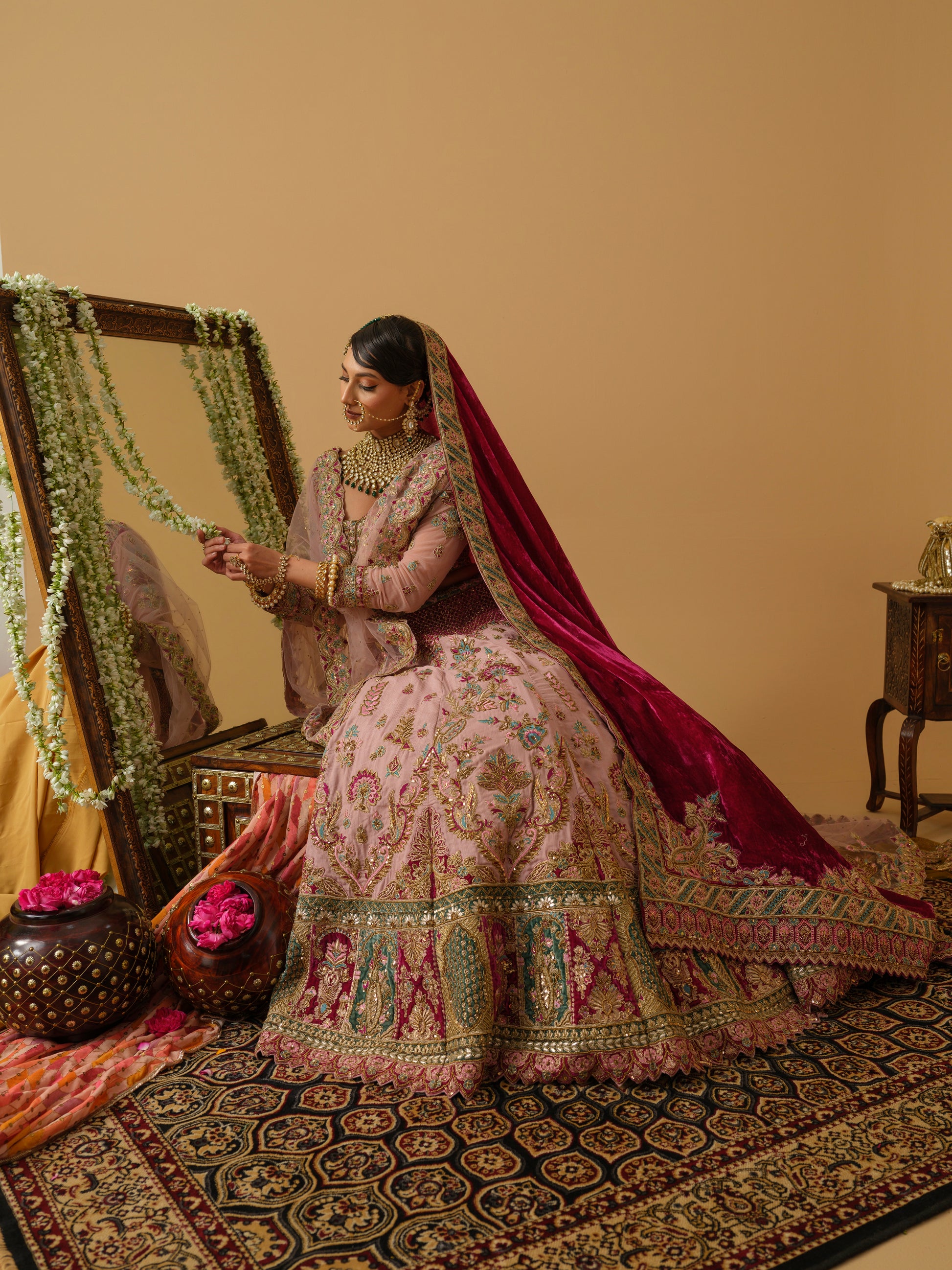 A breathtaking dusty rose lehenga, beautifully embroidered with intricate floral and Mughal-inspired motifs. The rich maroon dupatta with heavy detailing adds a regal touch, making it a perfect choice for a bride who loves tradition with a hint of modern elegance.