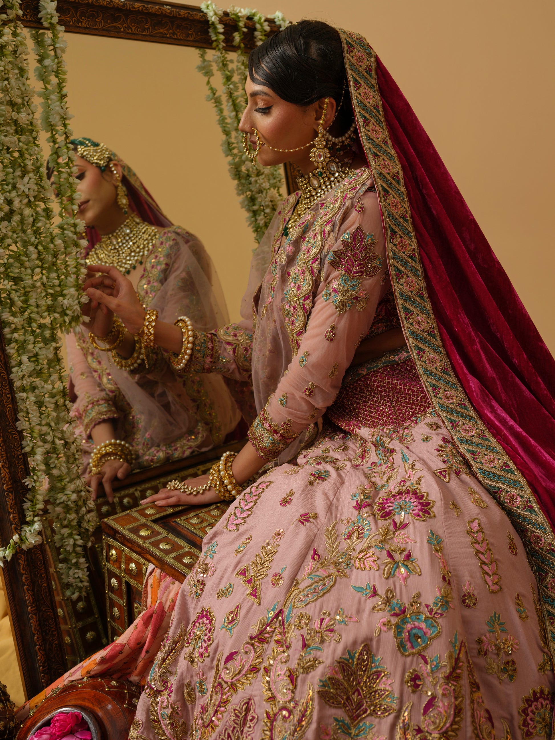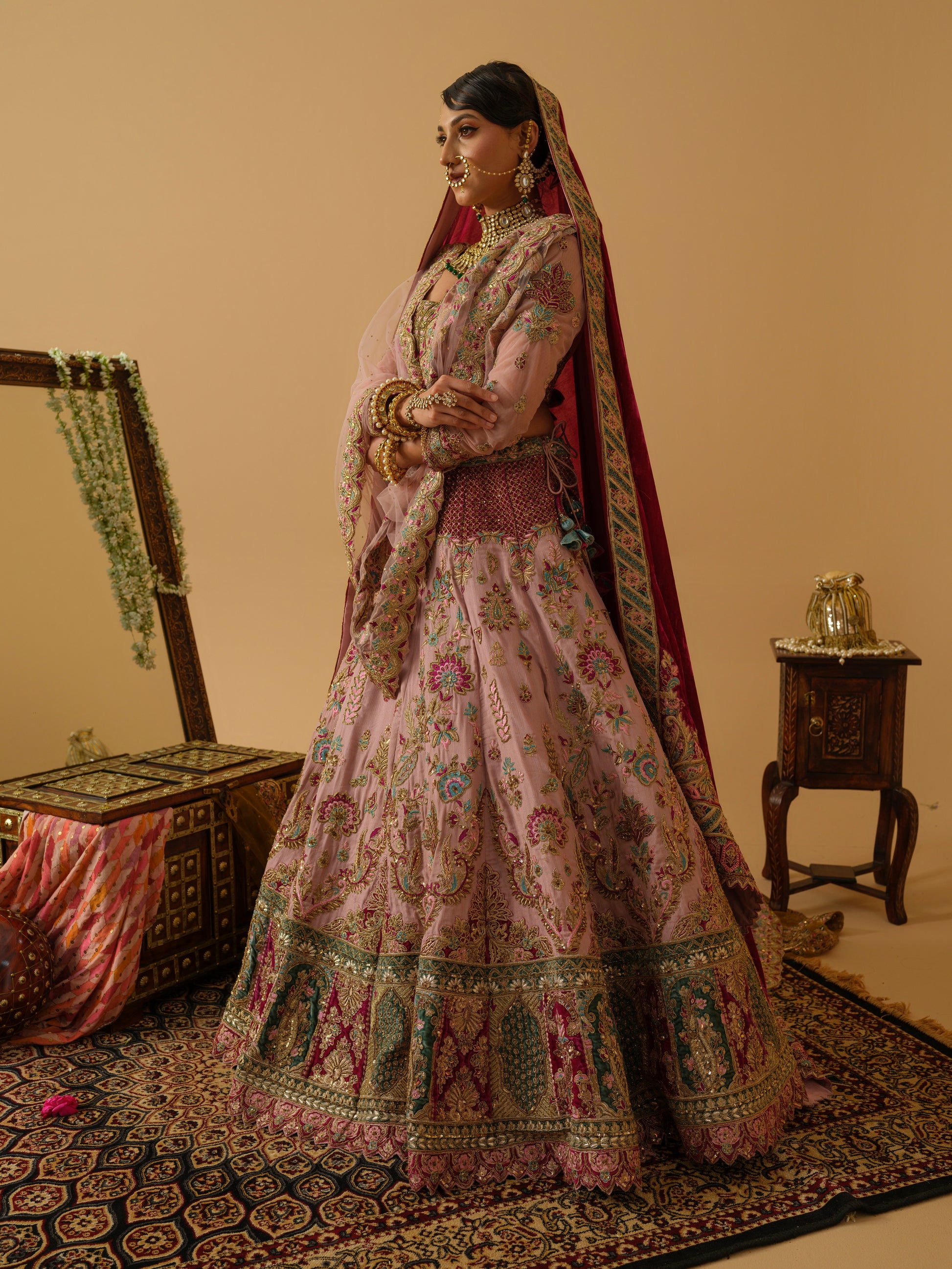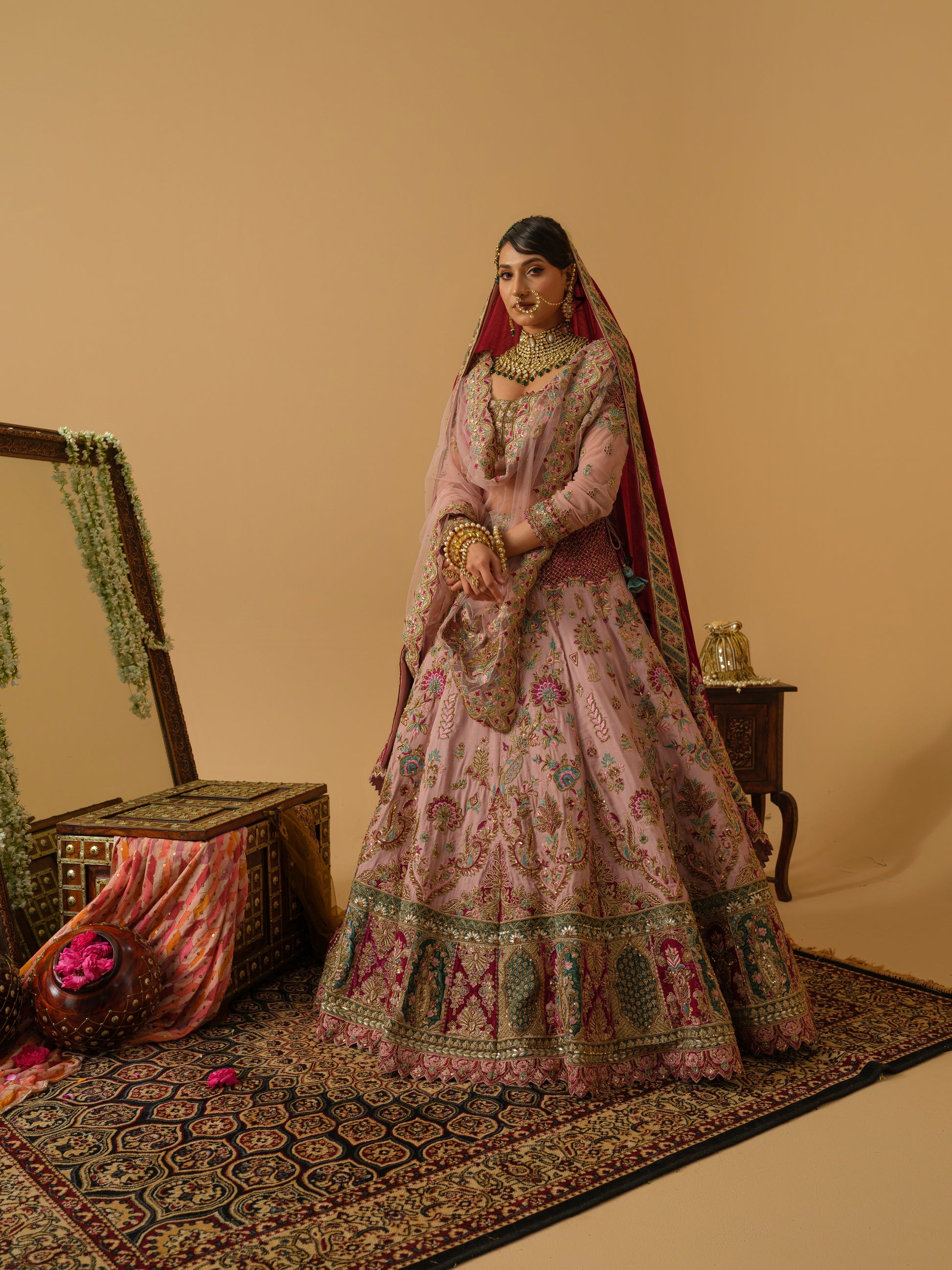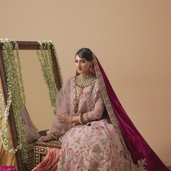 A breathtaking dusty rose lehenga, beautifully embroidered with intricate floral and Mughal-inspired motifs. The rich maroon dupatta with heavy detailing adds a regal touch, making it a perfect choice for a bride who loves tradition with a hint of modern elegance.