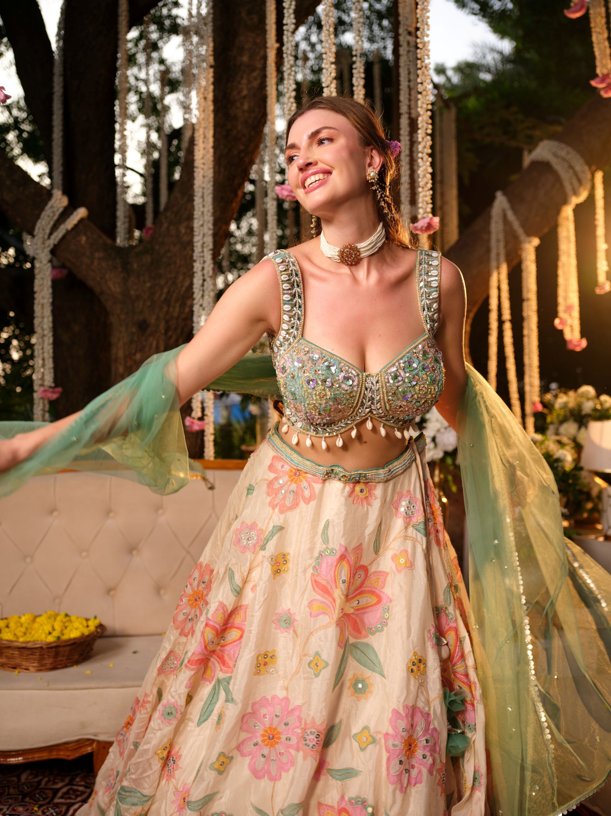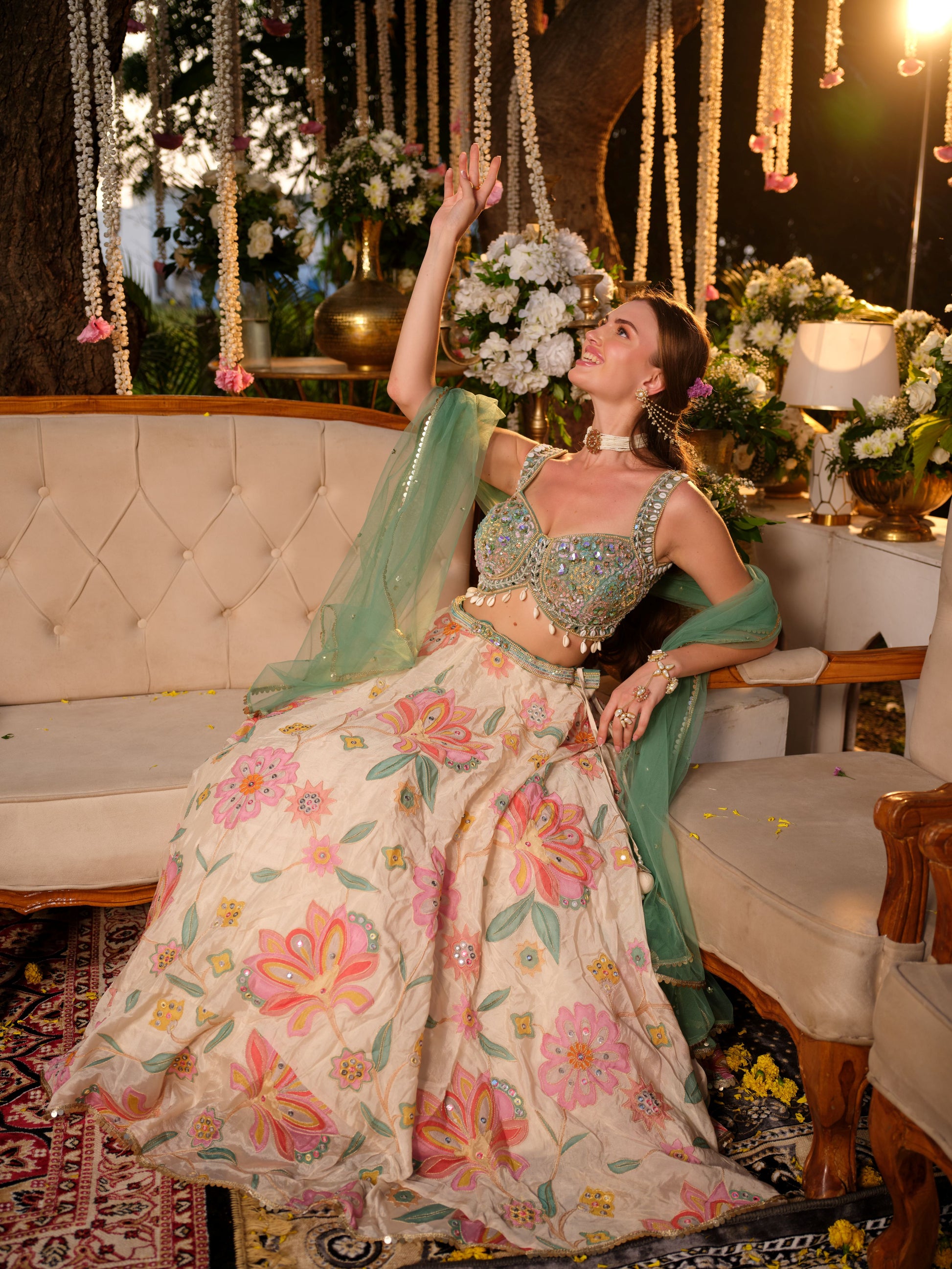 A lively ivory lehenga set that radiates freshness and joy. The heavily embellished blouse, studded with sequins, beads, and mirror work, creates a dazzling contrast against the soft ivory base. The flared lehenga features pastel floral embroidery in hues of pink, coral, and mint, giving it a vibrant yet elegant look. A sheer green dupatta with subtle shimmer borders adds the perfect finishing touch.