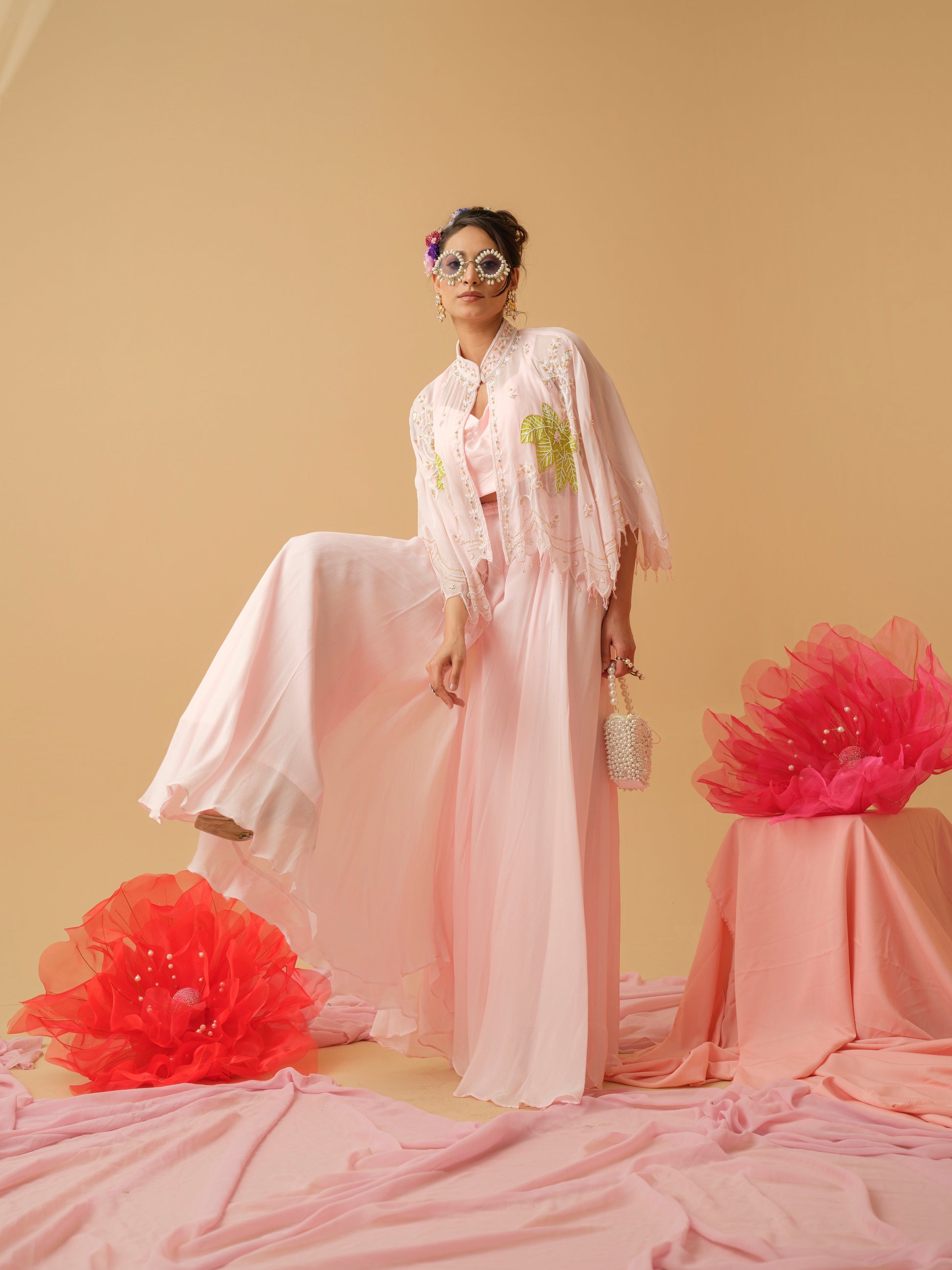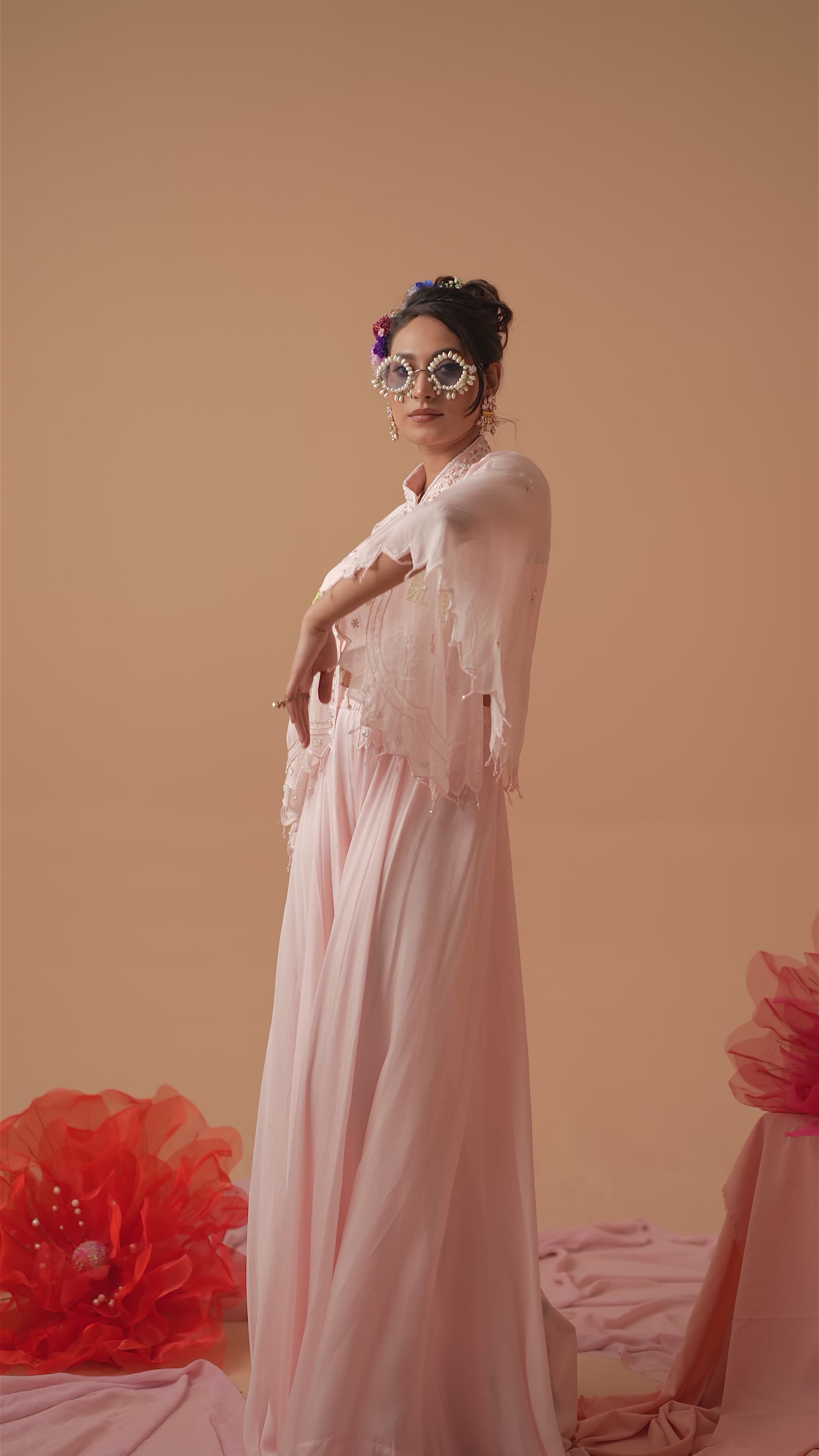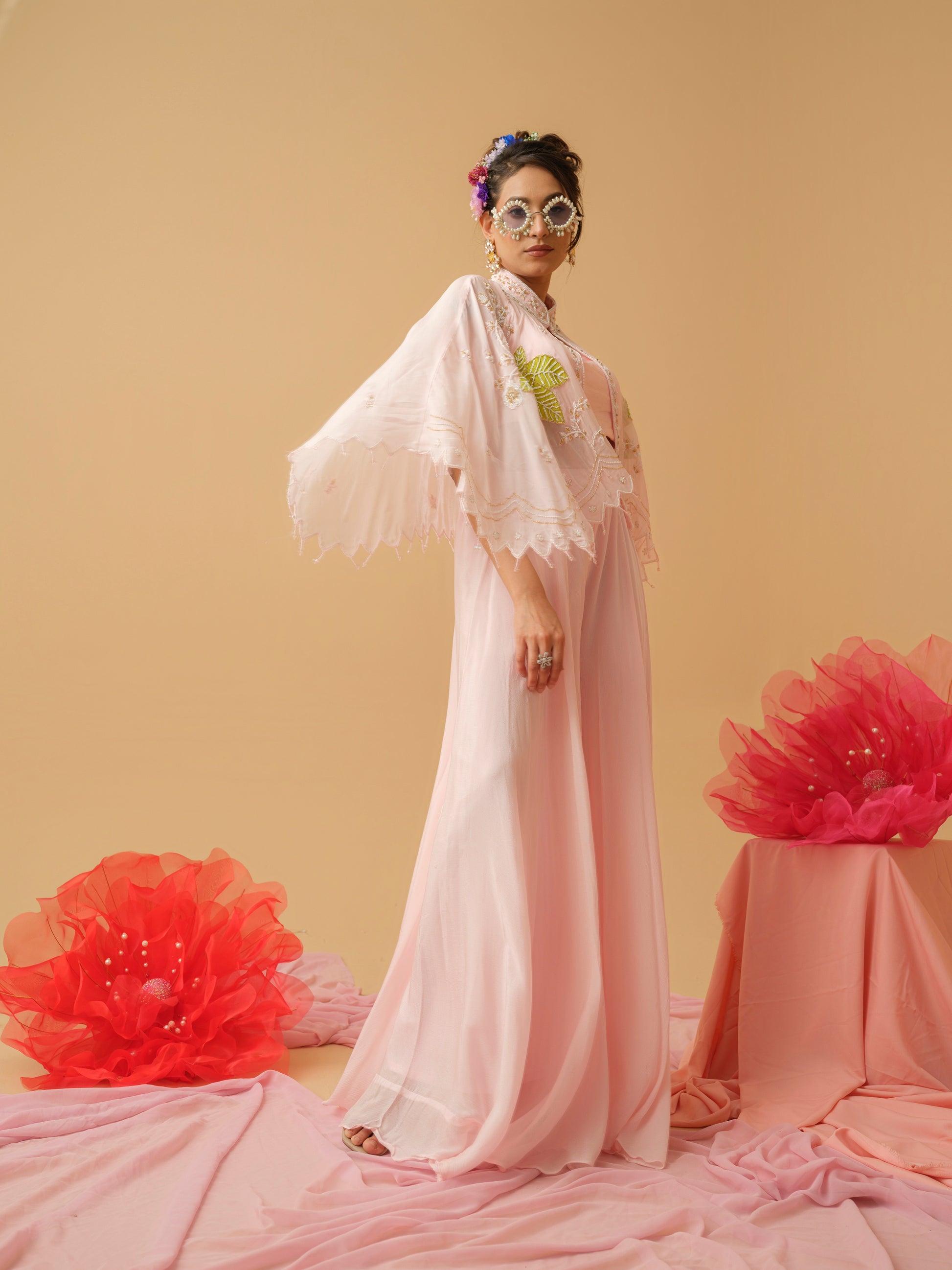 A flowy, pastel pink ensemble with a breezy cape and delicate embroidery, perfect for an effortless yet chic look.