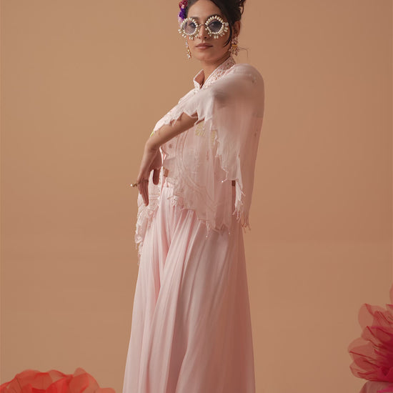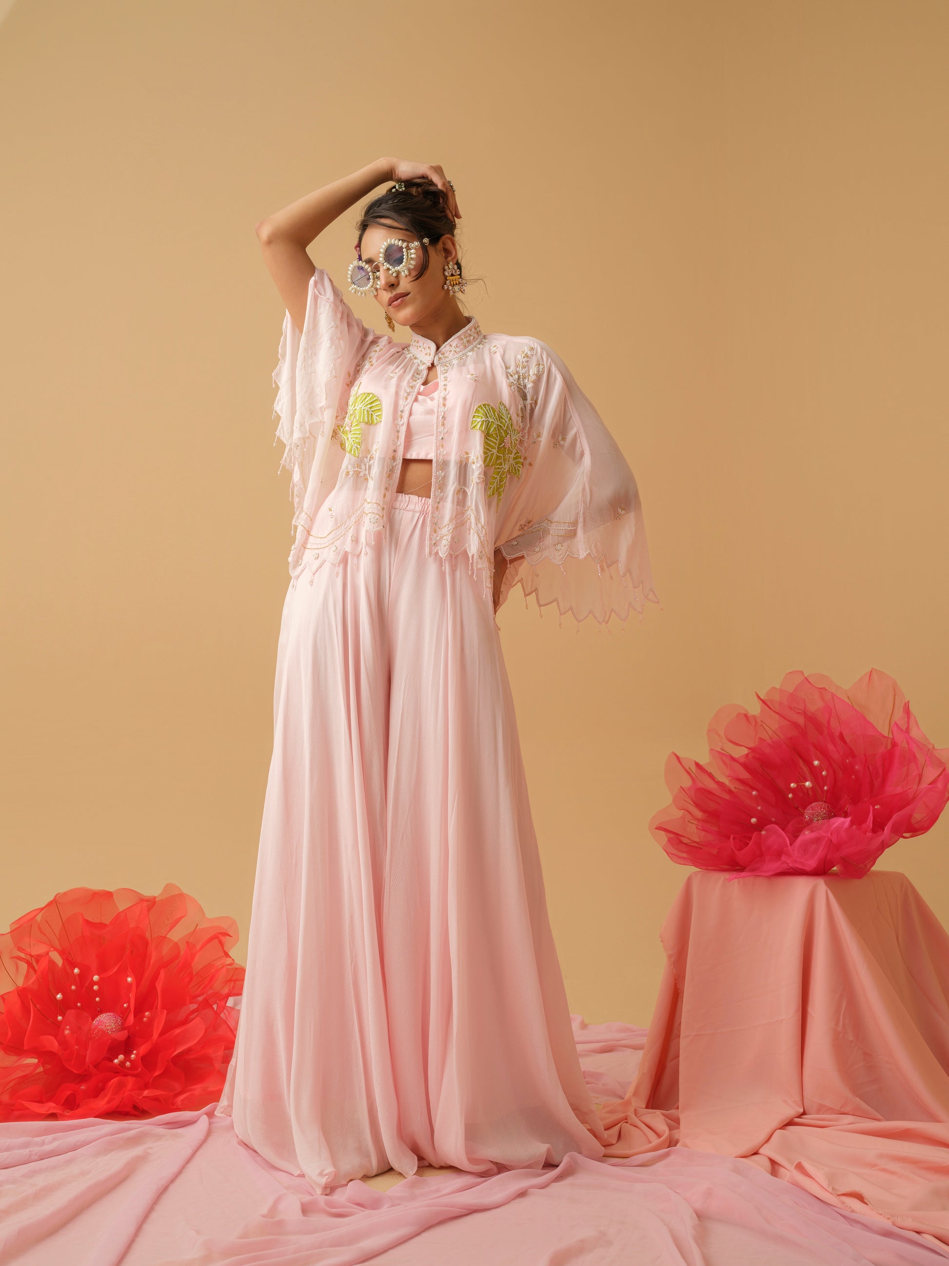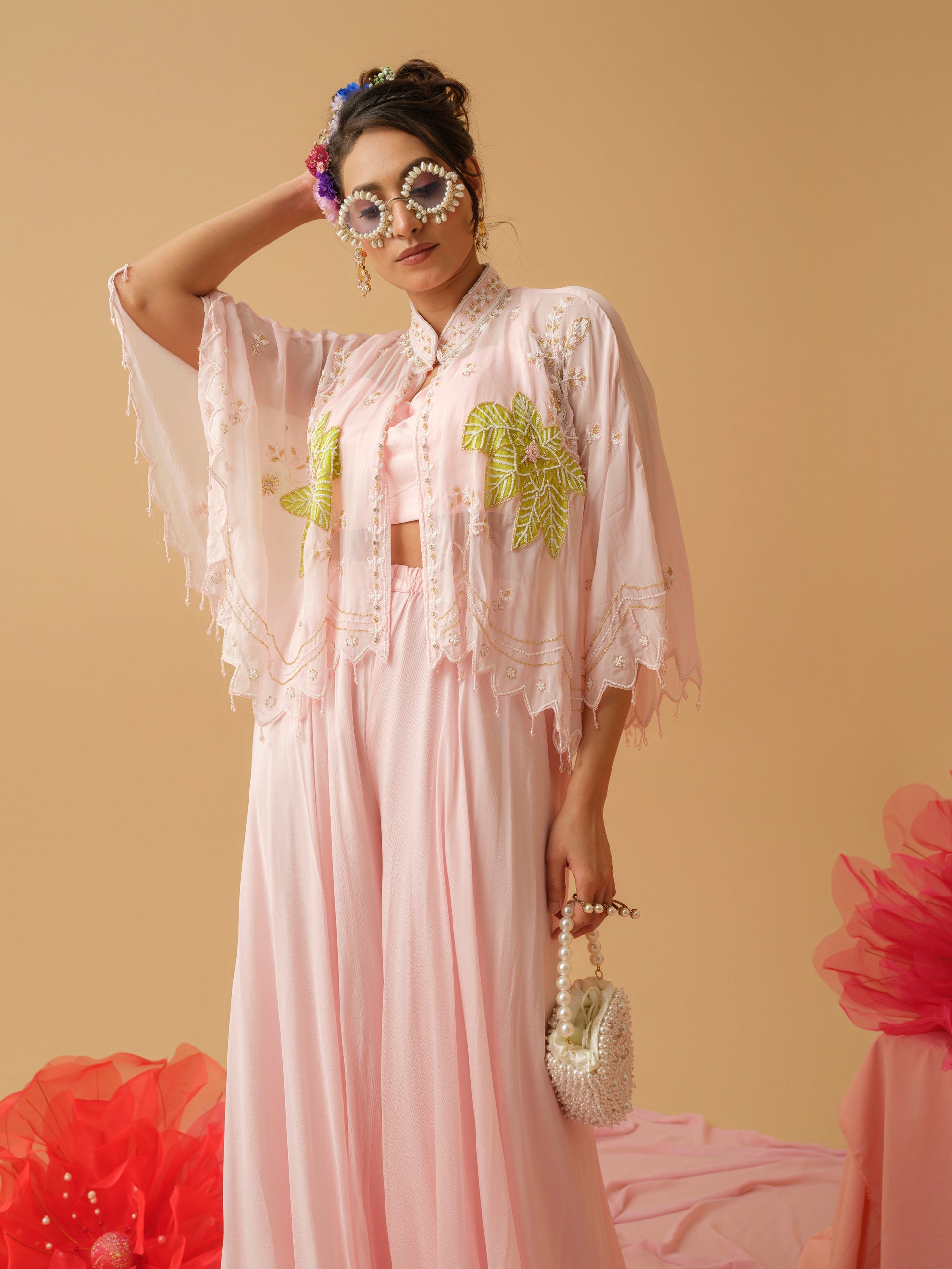 A flowy, pastel pink ensemble with a breezy cape and delicate embroidery, perfect for an effortless yet chic look.