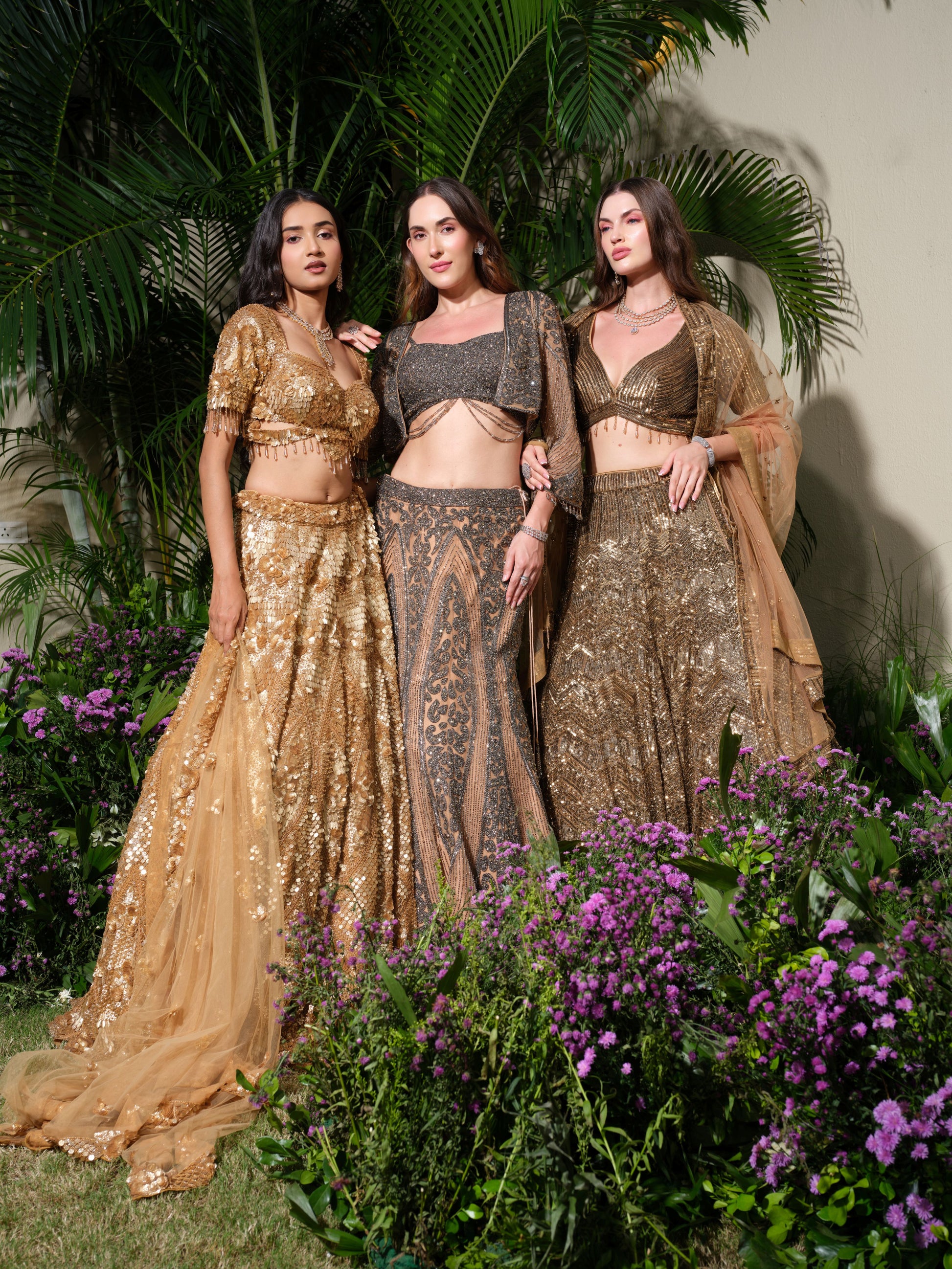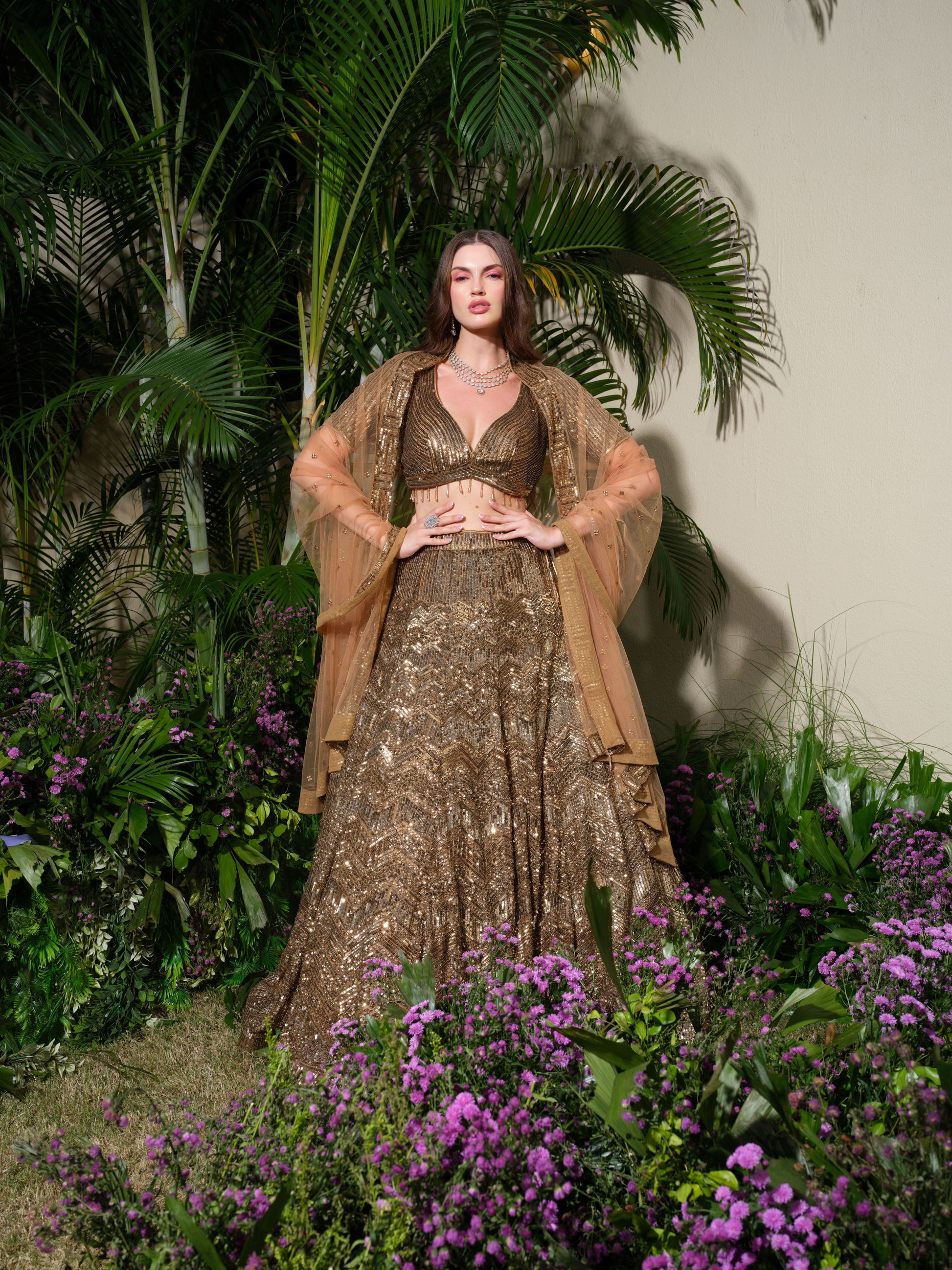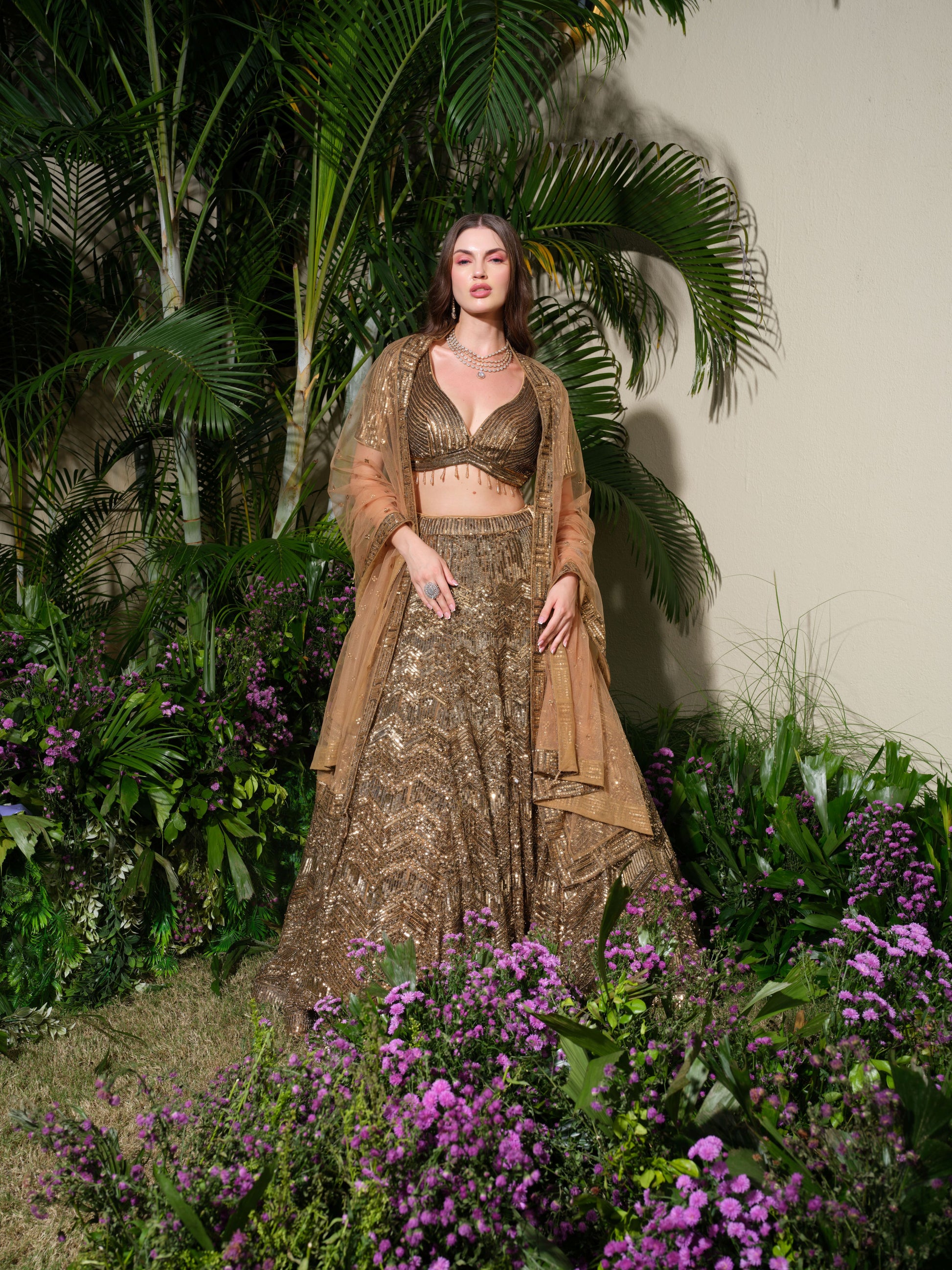A breathtaking golden lehenga set that radiates opulence. The bralette-style blouse features structured detailing, paired with a voluminous skirt drenched in sequins and intricate patterns that catch the light with every move. A sheer dupatta with delicate golden embroidery completes the ensemble, adding a touch of elegance to the bold, regal aesthetic. This outfit strikes the perfect balance between modern glamour and timeless tradition.