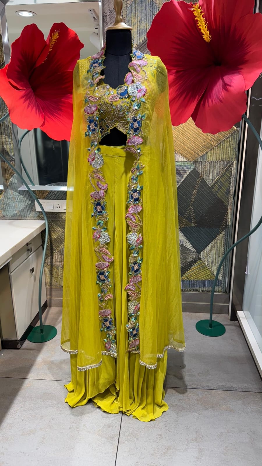 Step into elegance with this sunshine yellow ensemble, designed to make a bold statement. The outfit features a chic blouse with intricate floral embroidery paired with graceful wide-legged palazzo pants. Adding a touch of drama, the sheer cape is delicately embellished with 3D floral detailing along the borders, creating a stunning play of colors and textures.