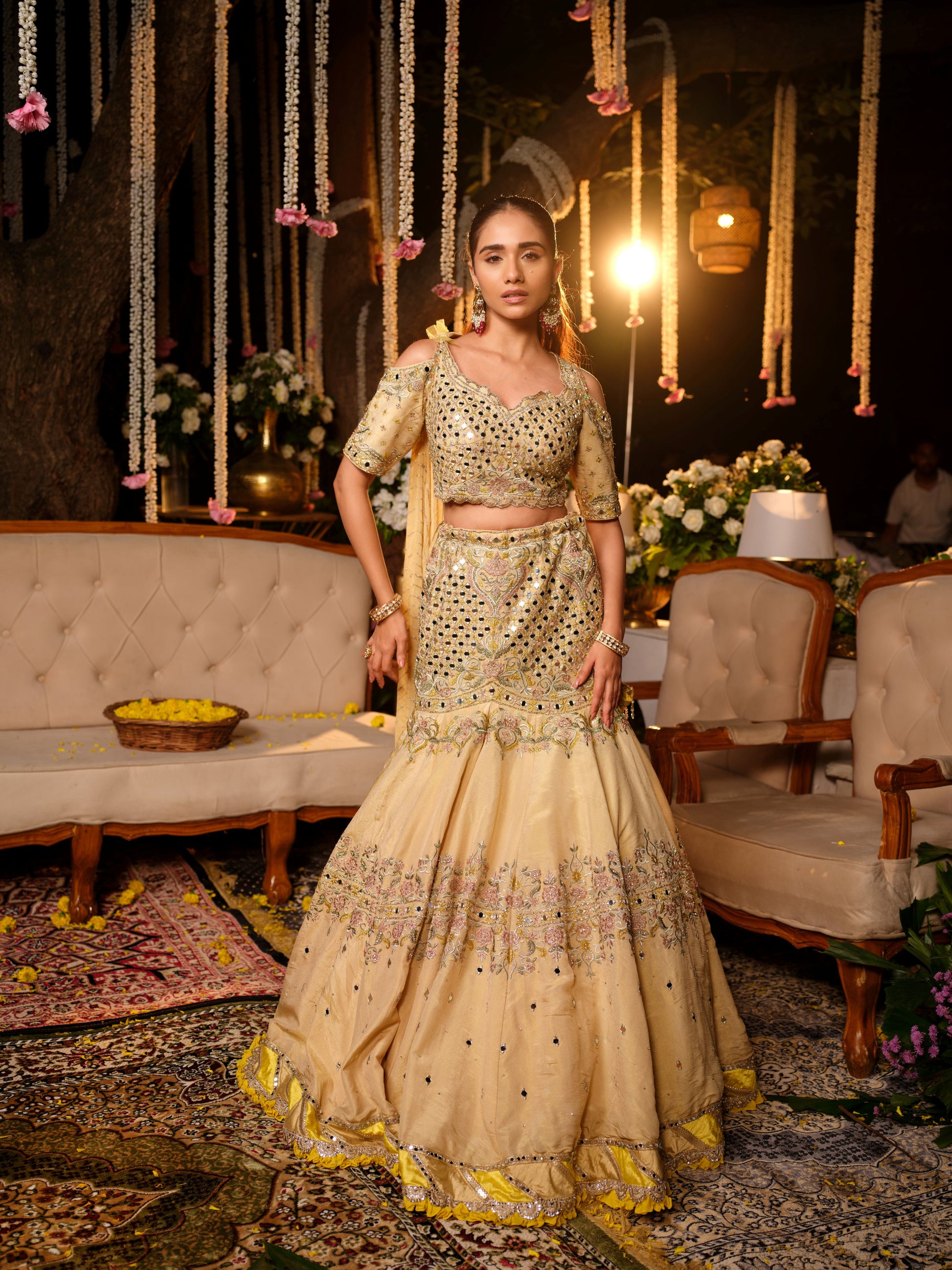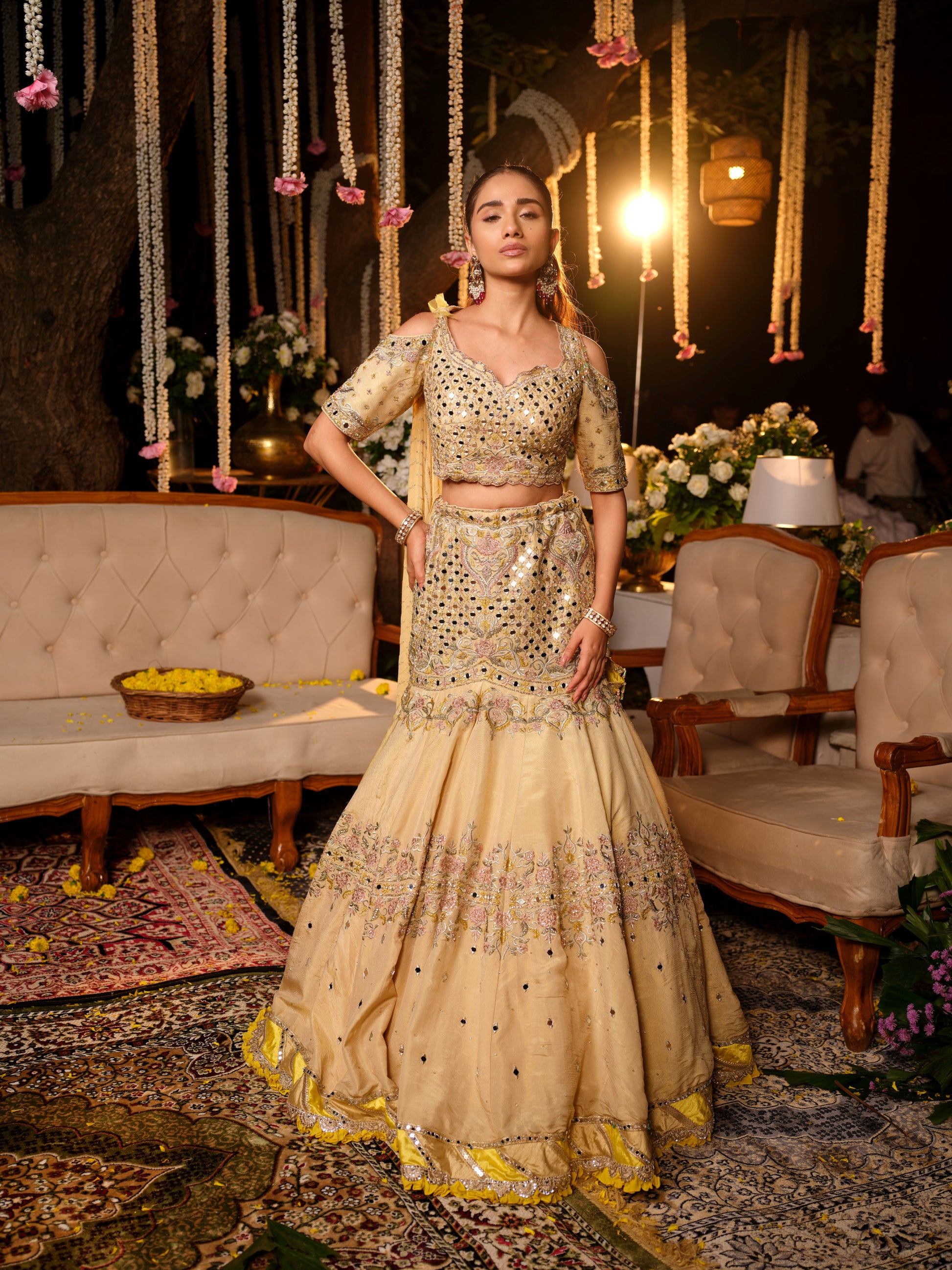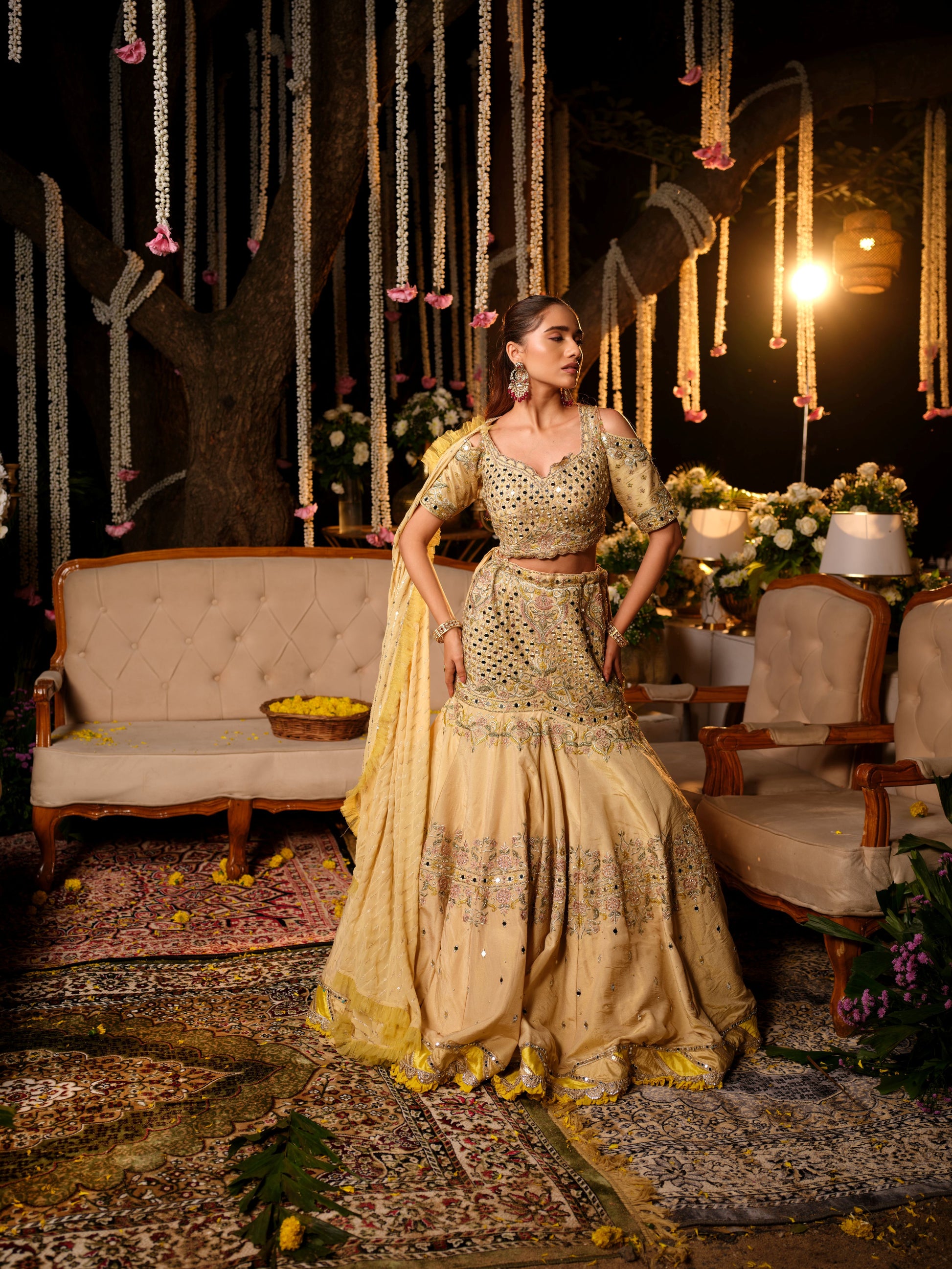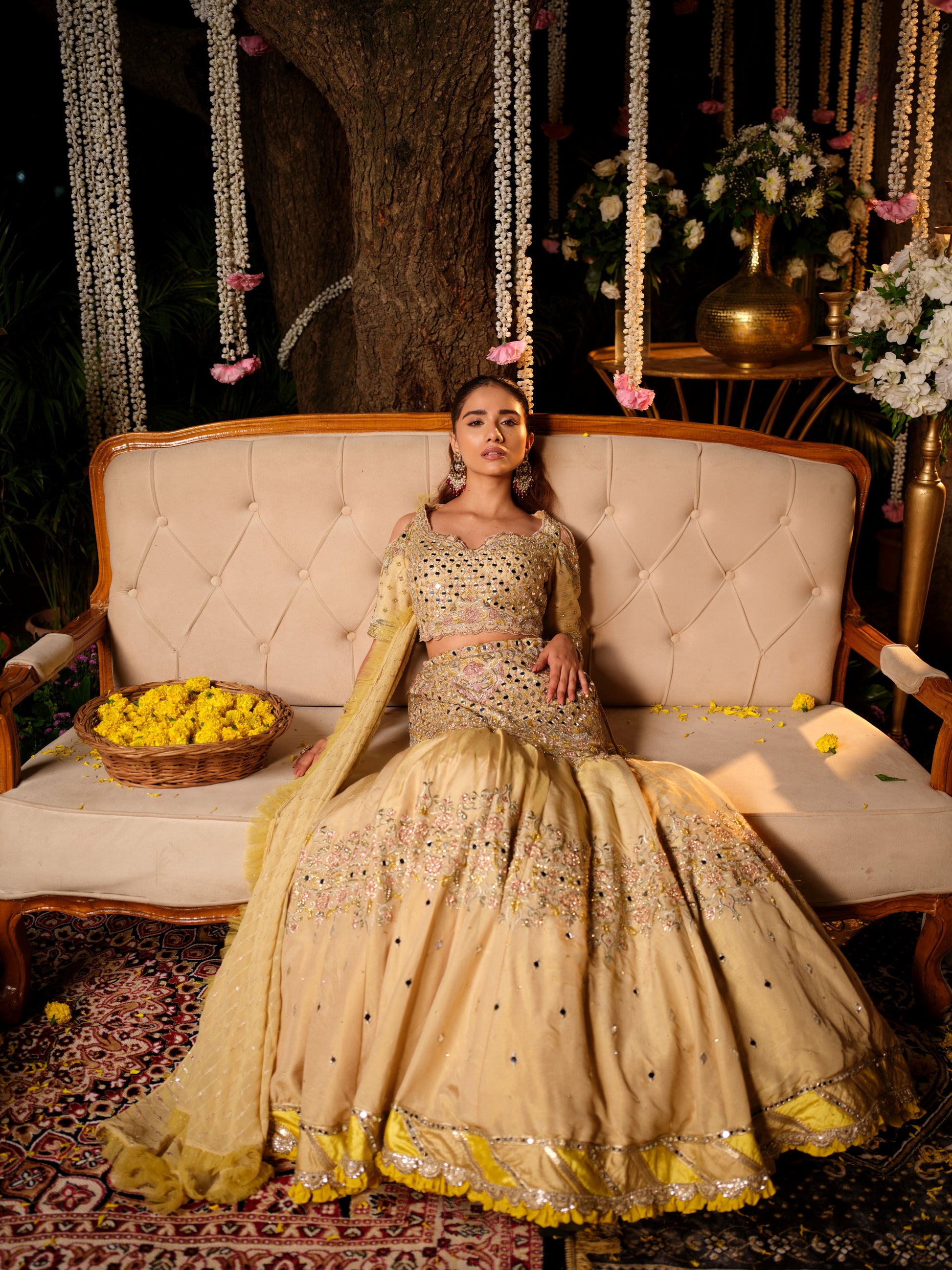 A show-stopping golden yellow lehenga set that radiates festive grandeur. The blouse is intricately adorned with mirror and sequin work, paired with a mermaid-cut skirt embellished with delicate pastel thread embroidery, shimmering highlights, and mirror details. The ensemble is completed with a matching sheer dupatta, adding the perfect balance of sparkle and elegance.