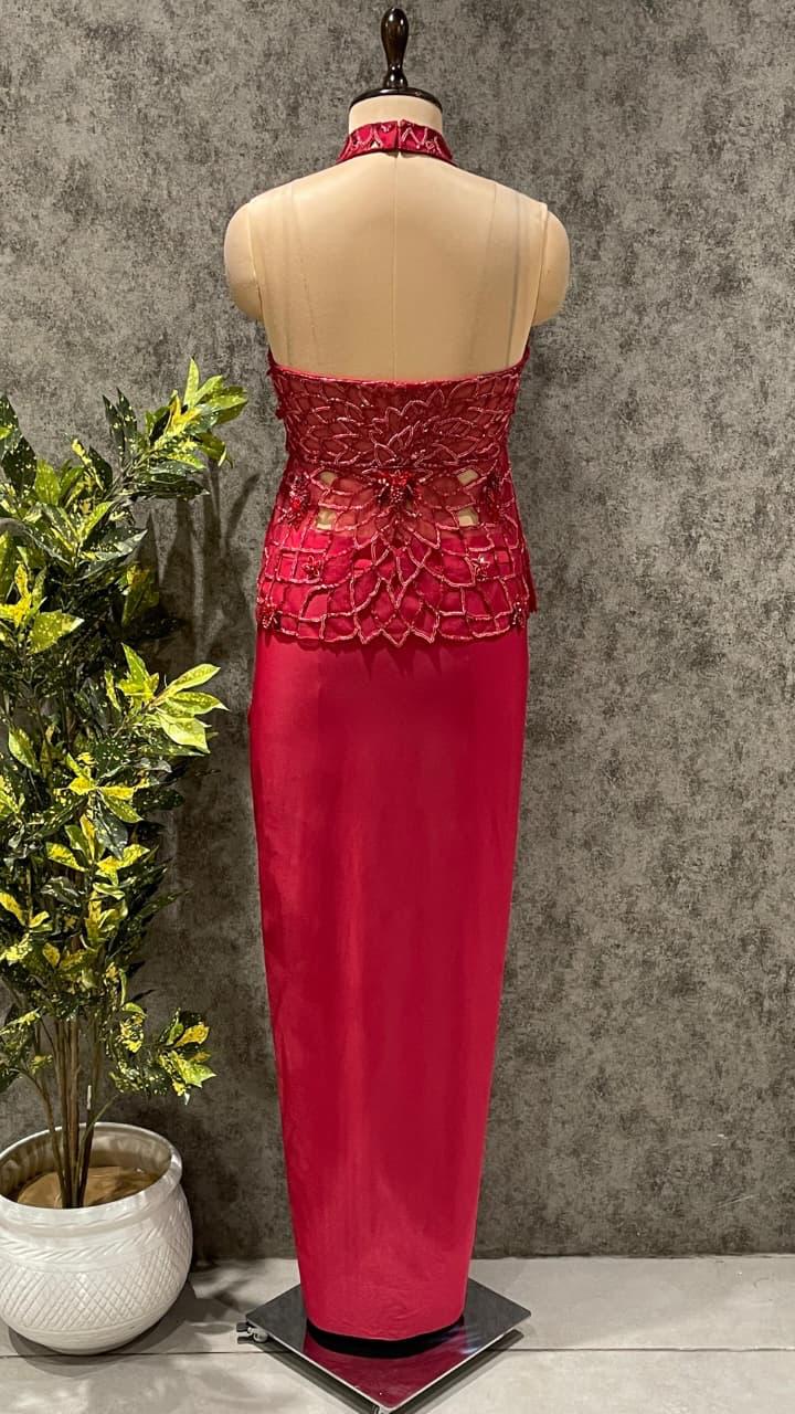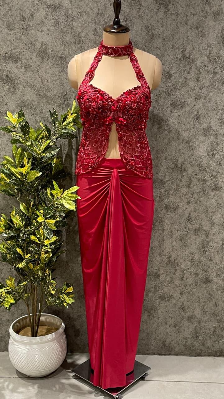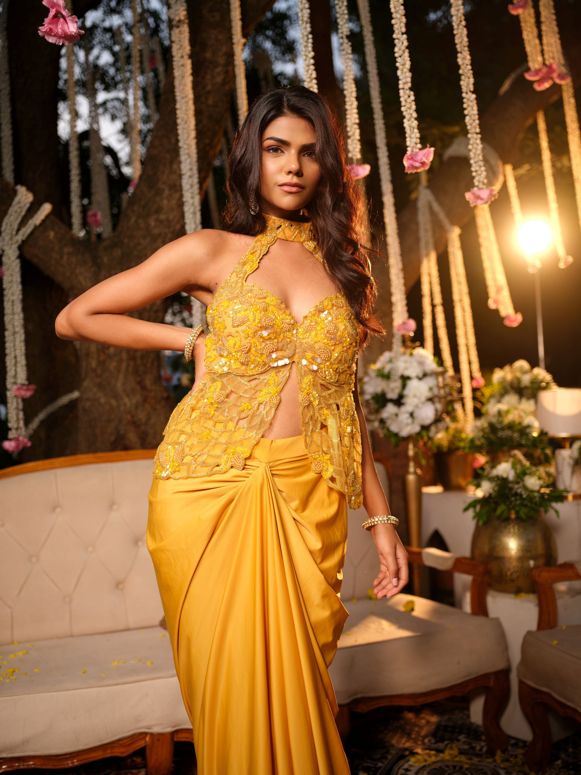 A contemporary drape saree that blends glamour with modern design. The halter-neck blouse is richly adorned with sequins, beads, and 3D floral appliqué, adding a statement sparkle. The fluid drape flows gracefully with soft pleats, creating a chic silhouette that exudes effortless sophistication and festive charm.
