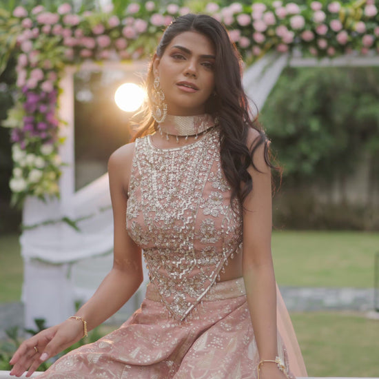 A contemporary blush pink ensemble featuring a heavily embellished sleeveless blouse with intricate sequin and bead embroidery, paired with wide-legged palazzo pants crafted in rich brocade with delicate zari motifs. The outfit is elevated with a soft net dupatta that adds grace and fluidity to the look. A perfect blend of modern silhouette and traditional craft.
