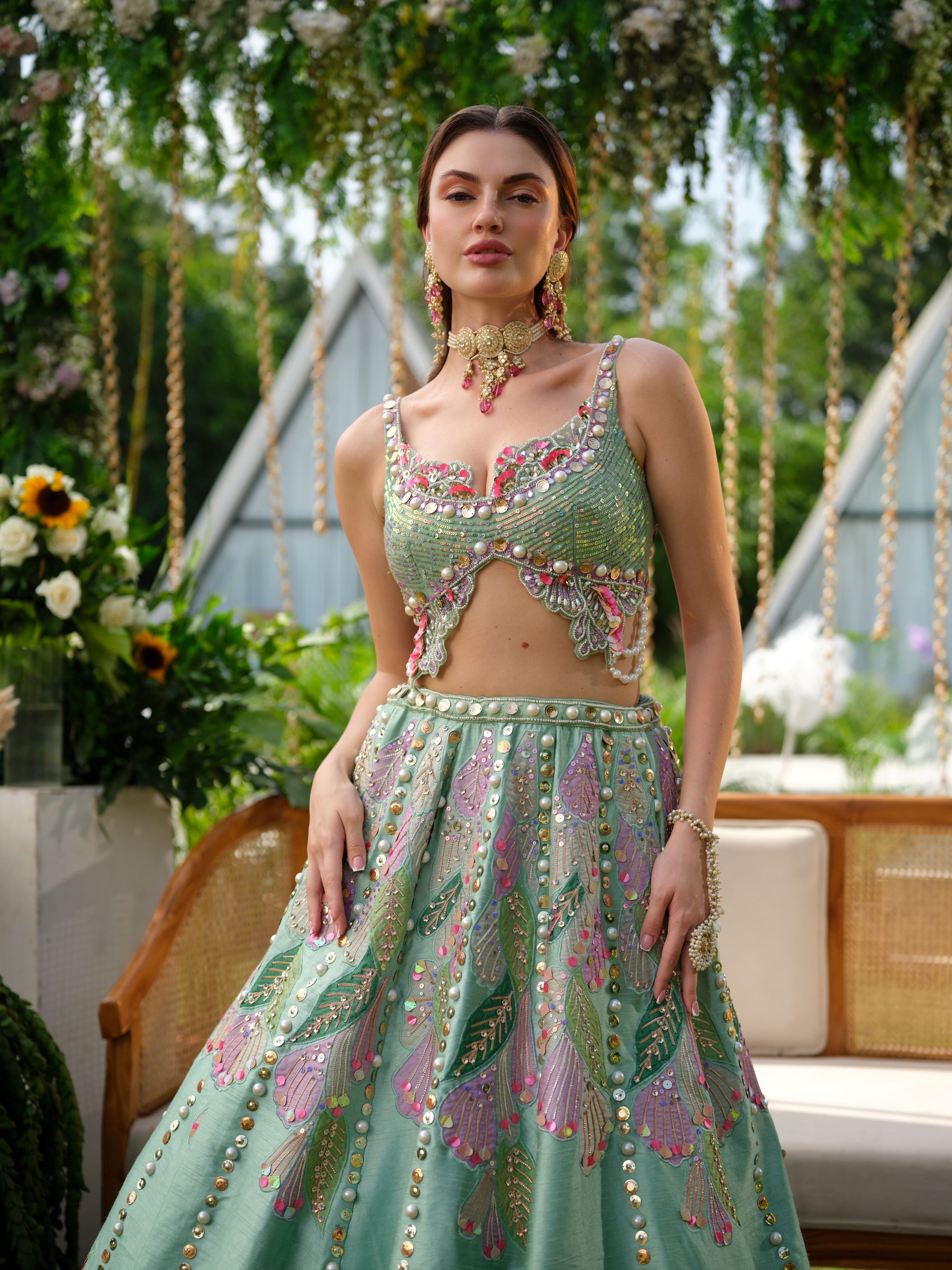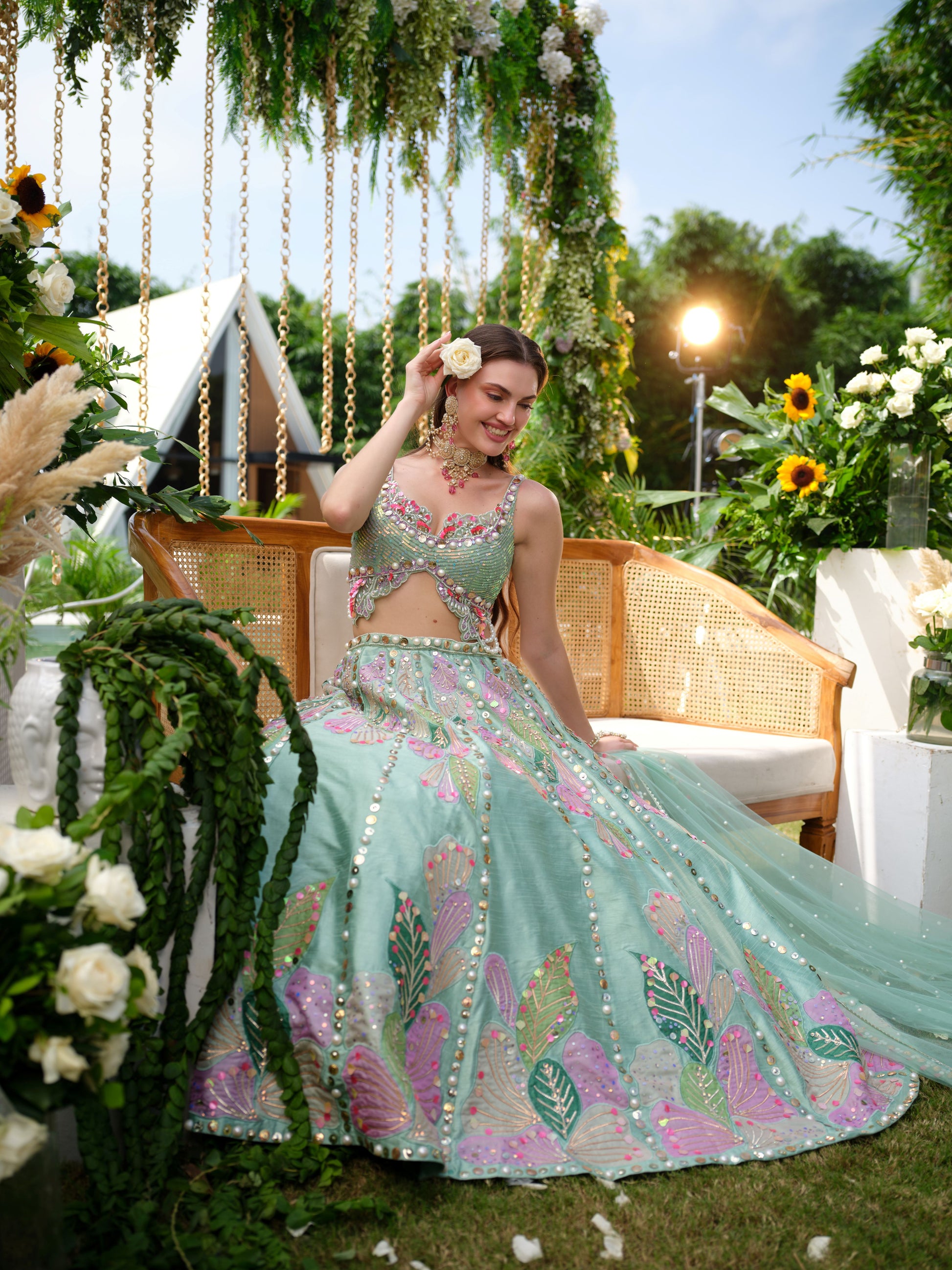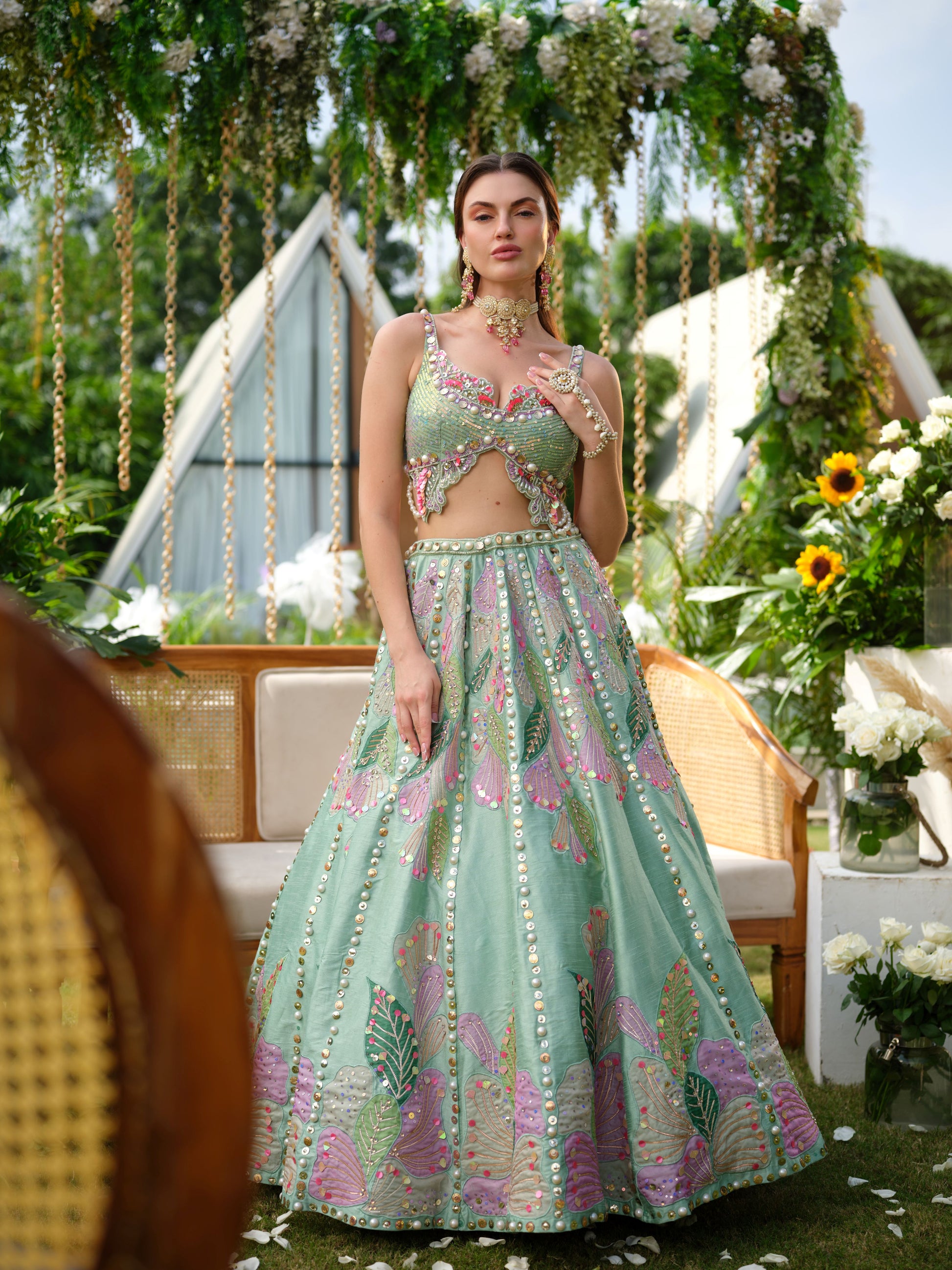 A refreshing aqua green lehenga adorned with pastel pink and lilac floral embroidery, enhanced with mirror work and delicate bead embellishments. The blouse features a modern cut with a scalloped hem and thin straps, giving it a chic, youthful appeal. The voluminous skirt flows gracefully with scattered floral motifs, making it playful yet elegant. Paired with minimal jewellery, this look is fresh, radiant, and contemporary.
