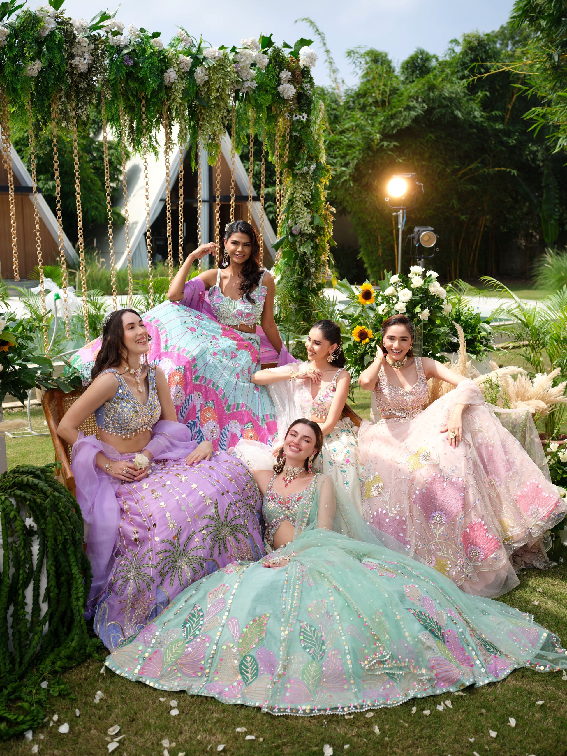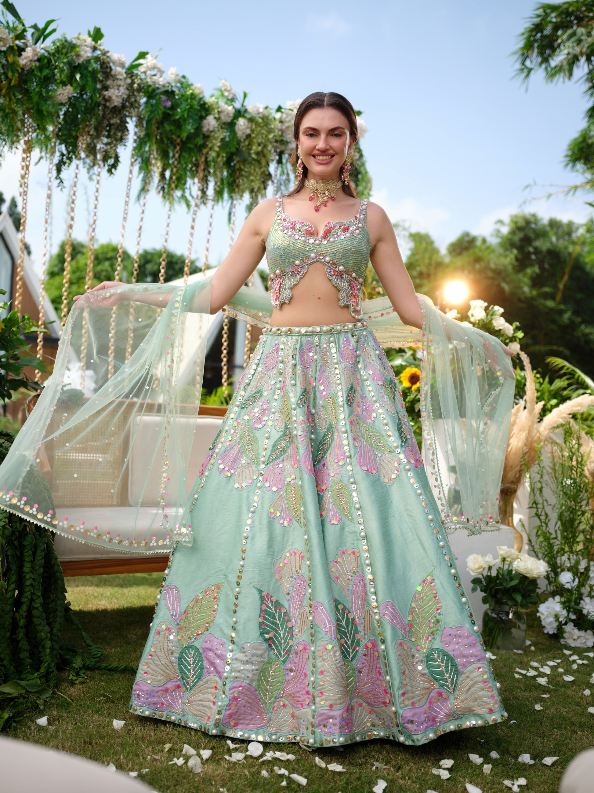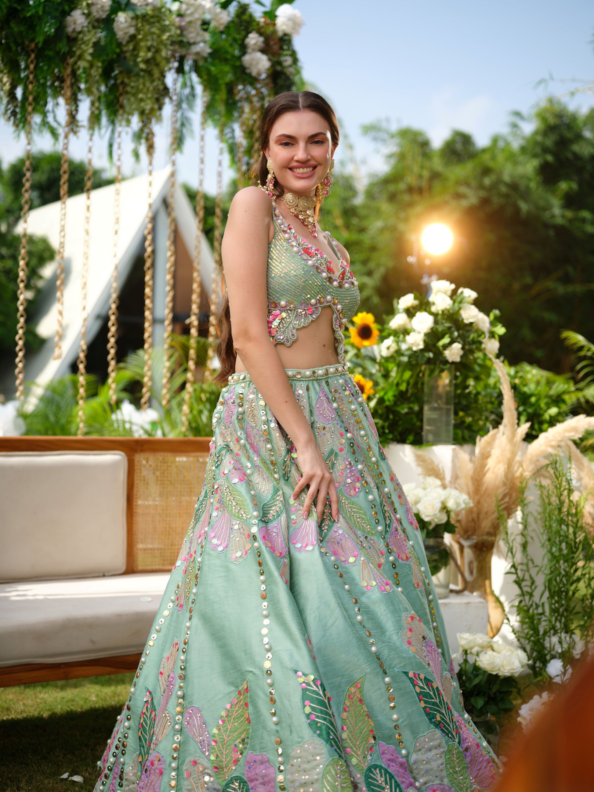 A refreshing aqua green lehenga adorned with pastel pink and lilac floral embroidery, enhanced with mirror work and delicate bead embellishments. The blouse features a modern cut with a scalloped hem and thin straps, giving it a chic, youthful appeal. The voluminous skirt flows gracefully with scattered floral motifs, making it playful yet elegant. Paired with minimal jewellery, this look is fresh, radiant, and contemporary.
