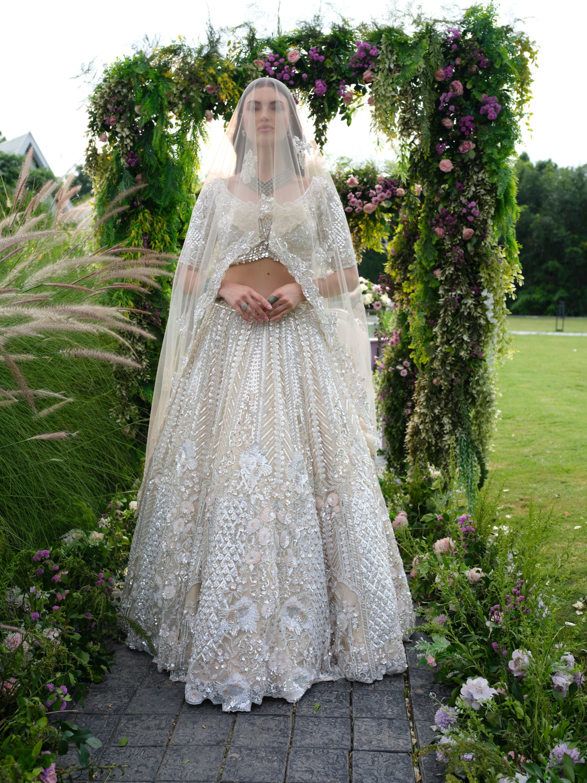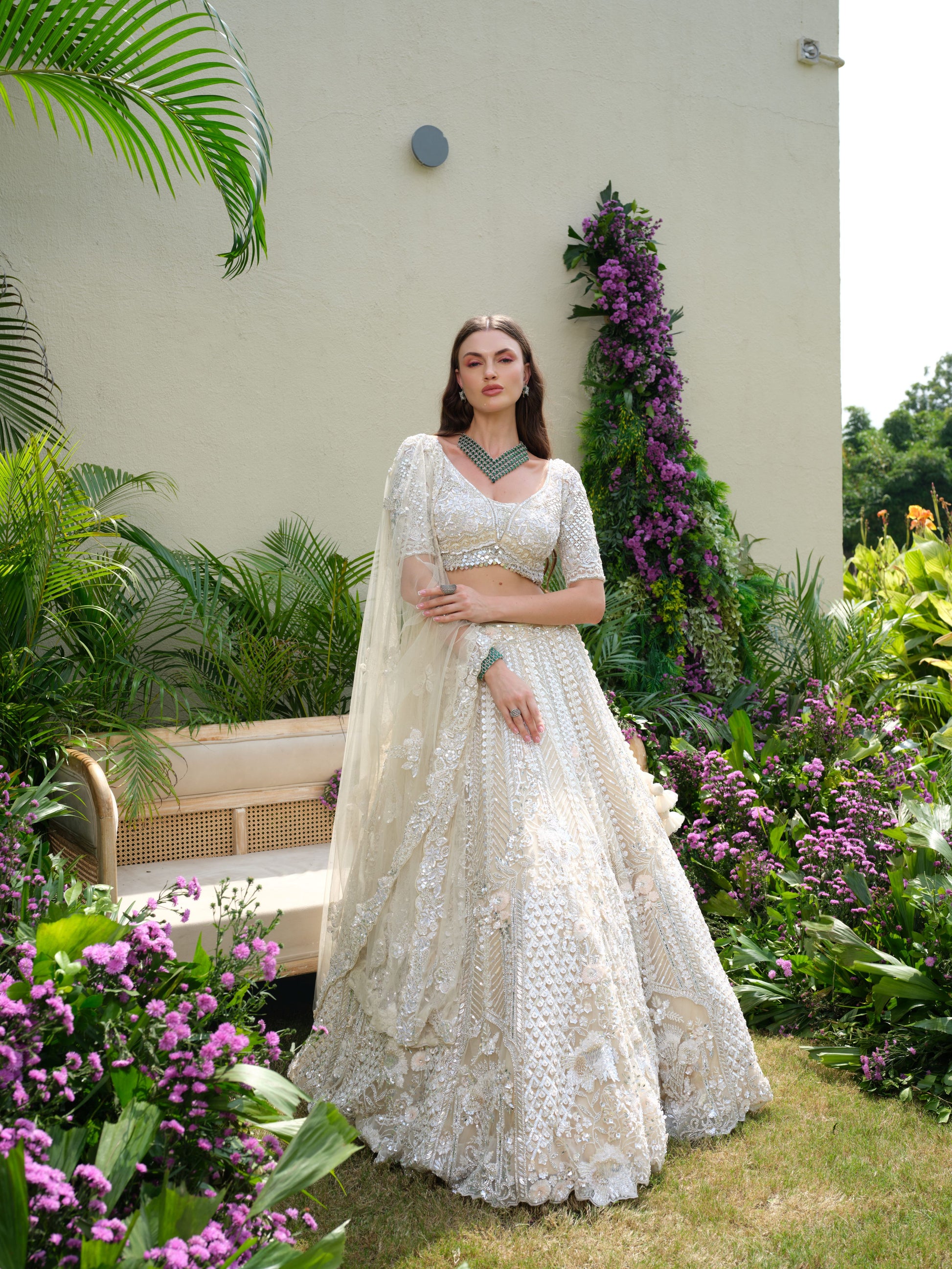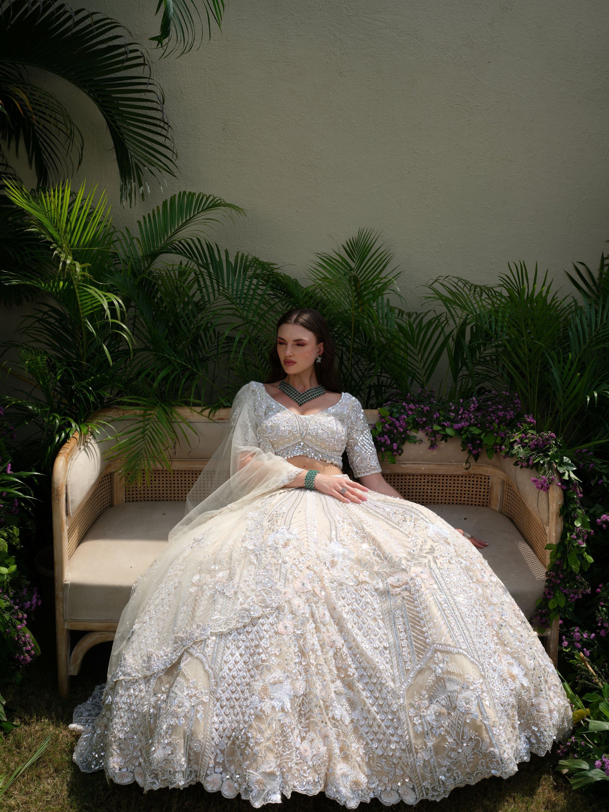 Regal and ethereal, this ivory lehenga is a masterpiece of intricate floral embroidery and delicate sequin accents. The sheer embellished blouse with scalloped details adds contemporary charm, while the voluminous skirt and flowing dupatta bring in timeless grandeur. A perfect ensemble for brides and bridesmaids at weddings, receptions, or engagement soirées.
