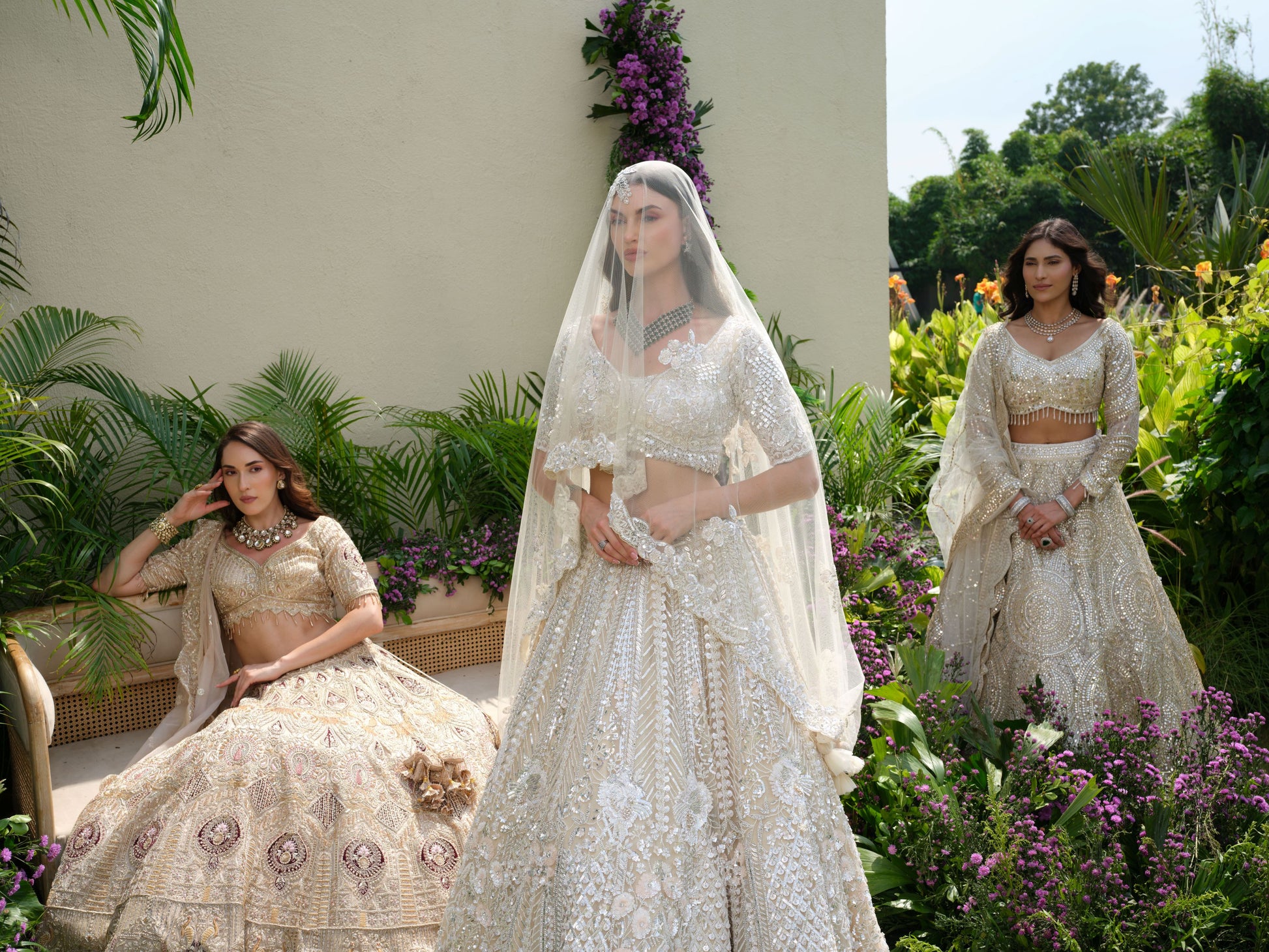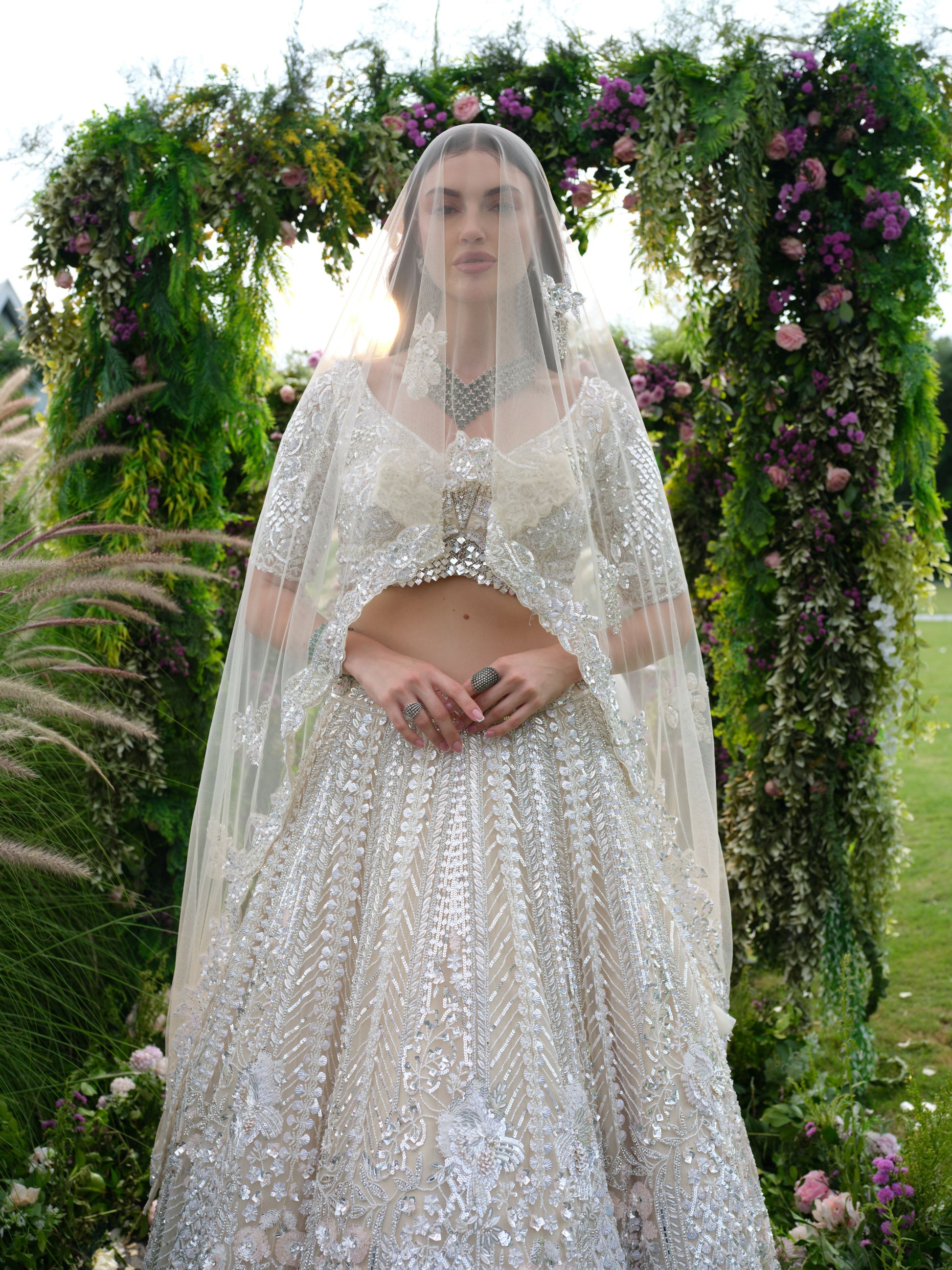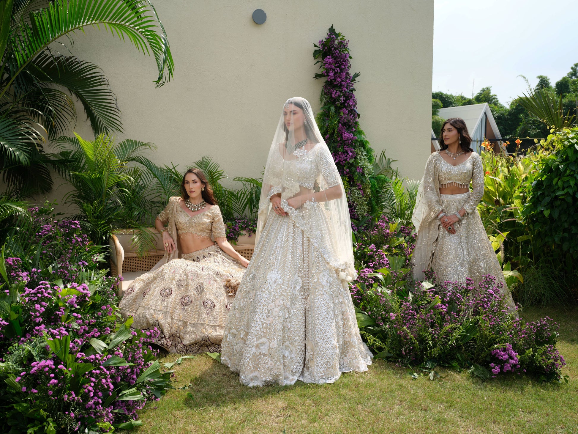 Regal and ethereal, this ivory lehenga is a masterpiece of intricate floral embroidery and delicate sequin accents. The sheer embellished blouse with scalloped details adds contemporary charm, while the voluminous skirt and flowing dupatta bring in timeless grandeur. A perfect ensemble for brides and bridesmaids at weddings, receptions, or engagement soirées.