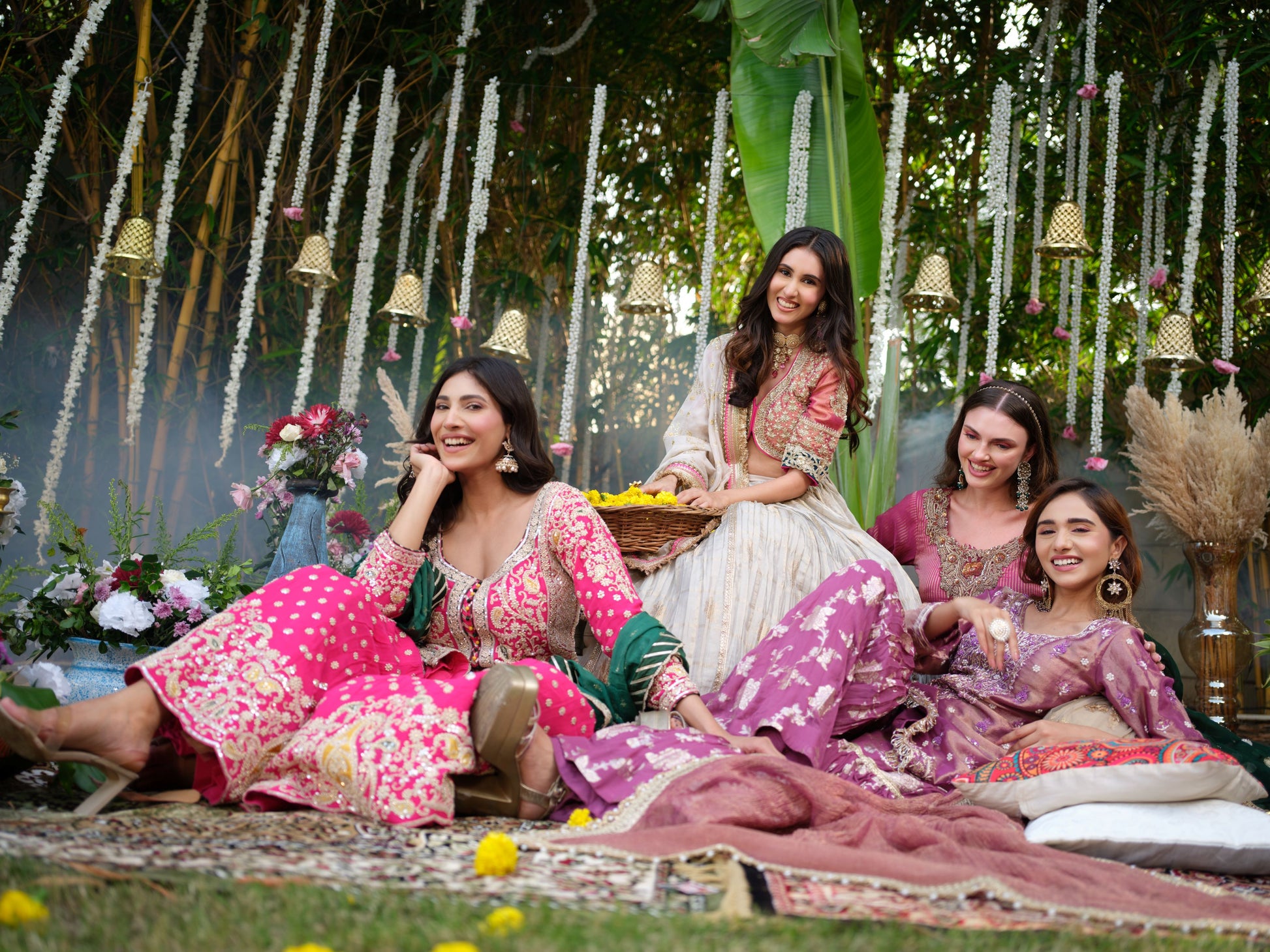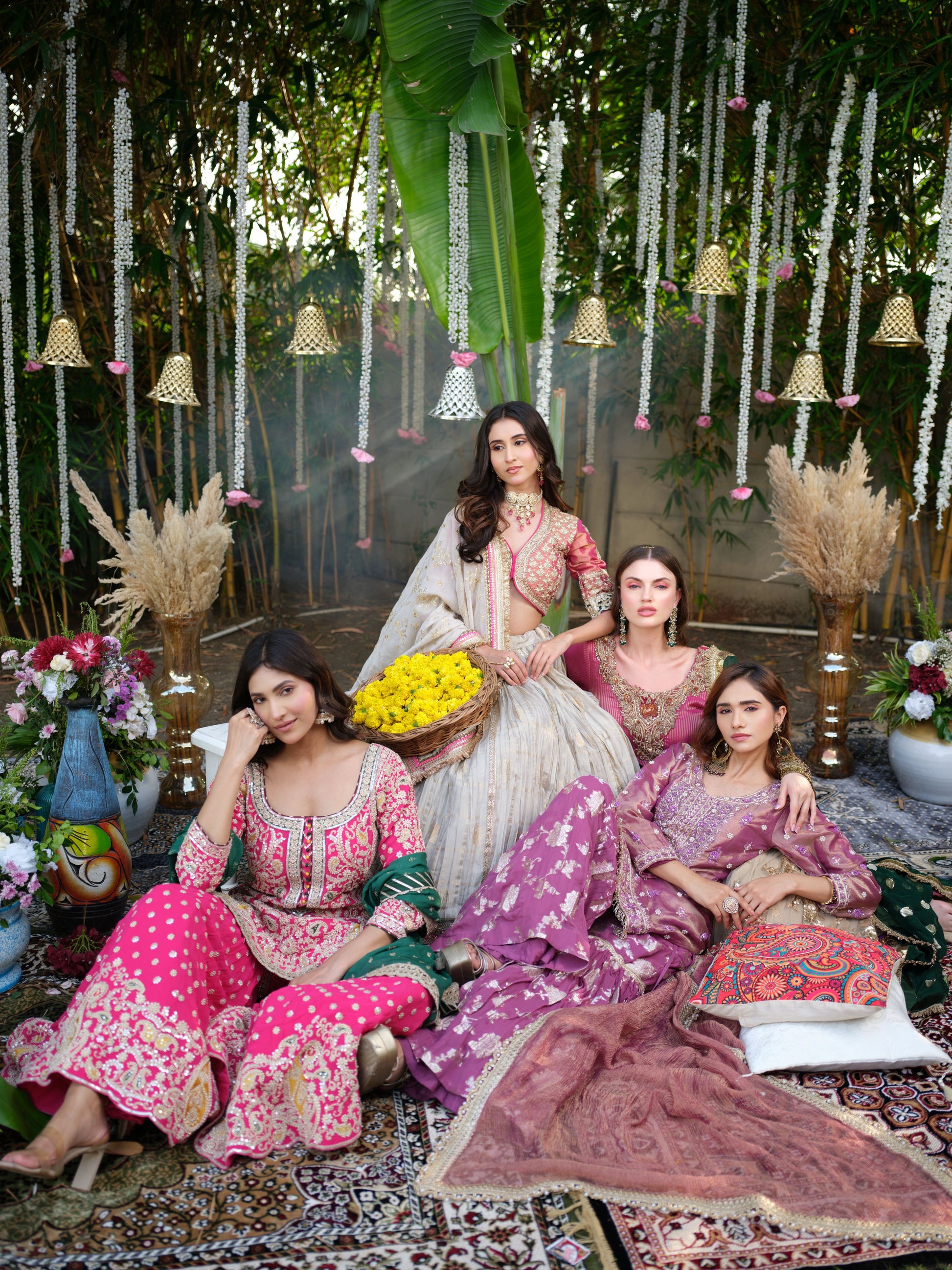 Drenched in vibrant fuchsia, this sharara set is adorned with intricate golden threadwork and delicate motifs, exuding regal elegance. The long embroidered kurta pairs beautifully with wide-flared sharara pants, while the contrasting green dupatta adds a striking finish. A perfect ensemble for mehendi, festive celebrations, or wedding functions where tradition meets glamour.