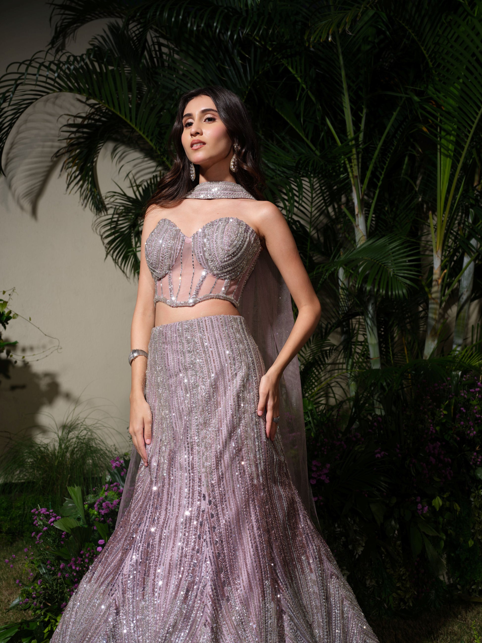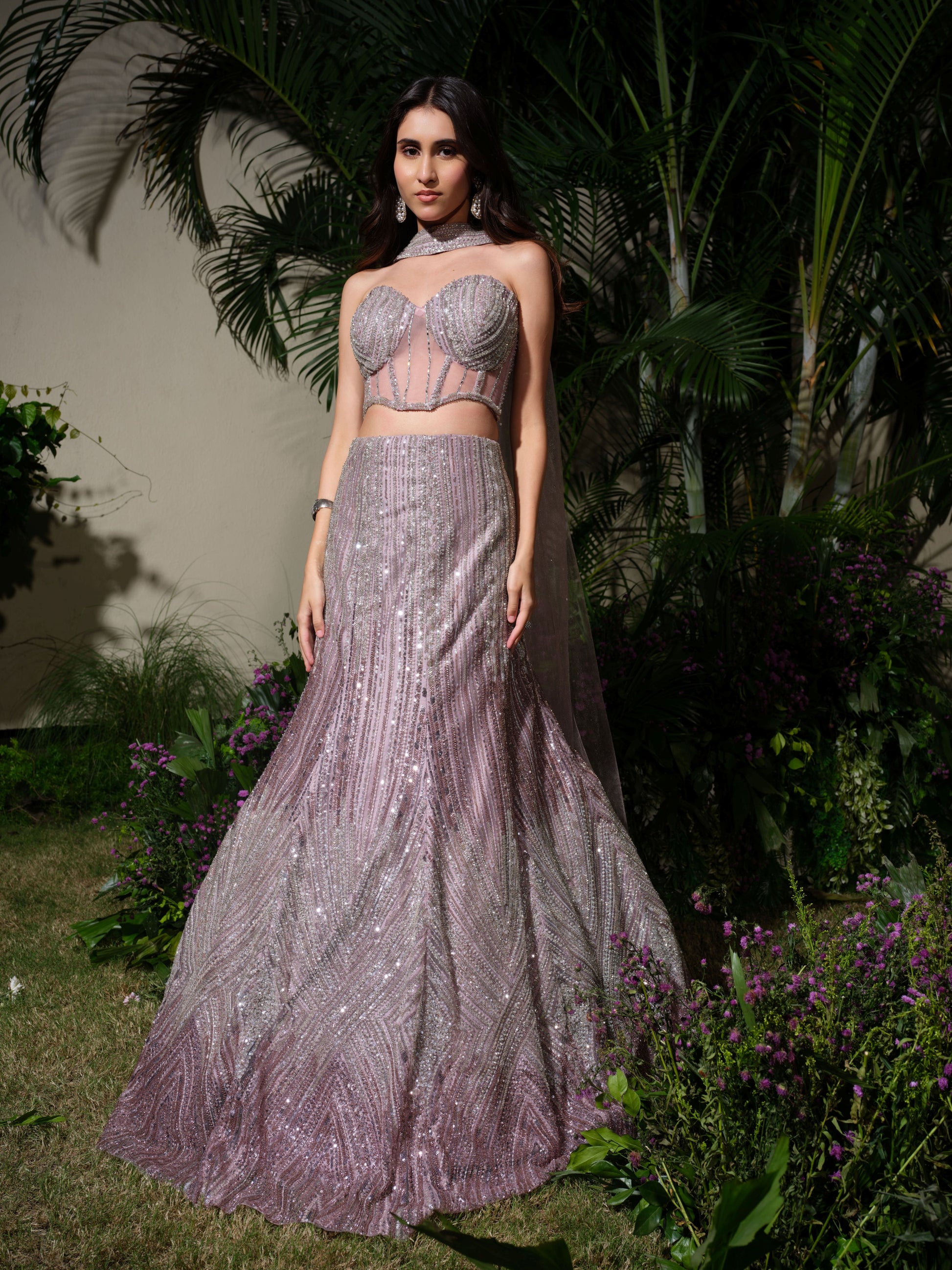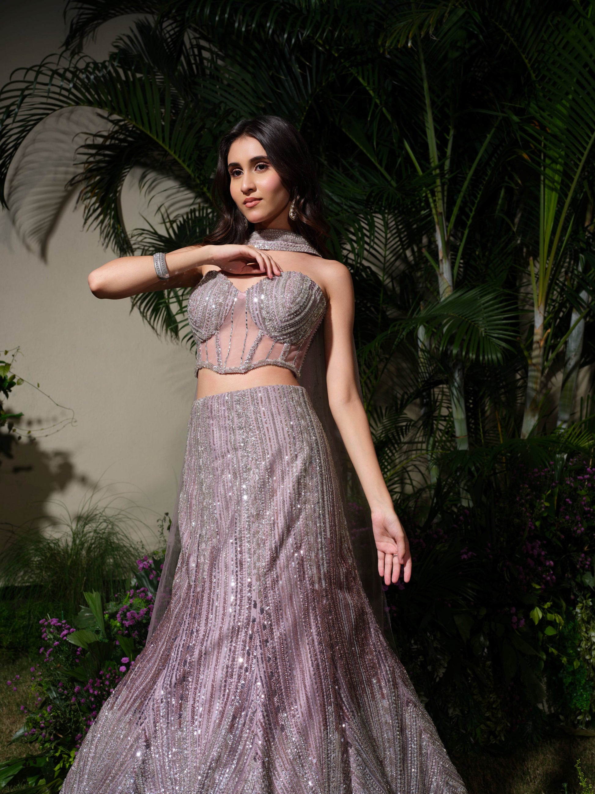 A fairytale-inspired gown in soft lilac blush, crafted with a structured corset bodice featuring sheer panels and intricate sequin embroidery. The flowing skirt is designed in a mermaid flare with radiant shimmer detailing, while the high-neck sheer drape adds a touch of ethereal elegance. Feminine, glamorous, and effortlessly modern.