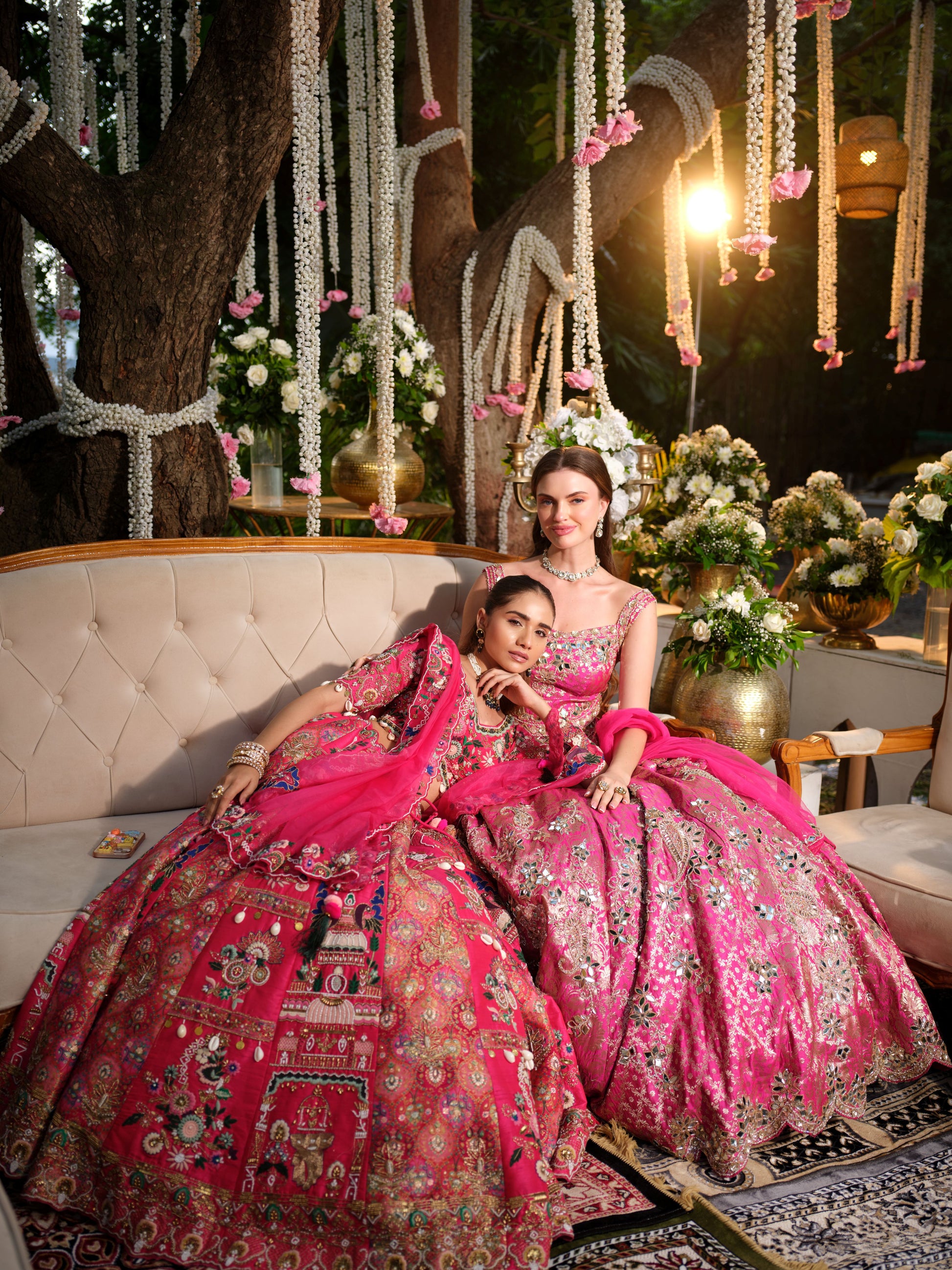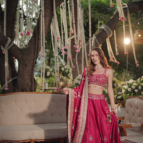 Celebrate tradition with a contemporary twist in this fuchsia pink lehenga set featuring exquisite multicolour embroidery. The lehenga is adorned with detailed mirror work, resham thread embroidery, and ornate motifs that lend it a rich, festive appeal. The matching blouse, paired with a beautifully embroidered dupatta, completes the ensemble with elegance and charm.