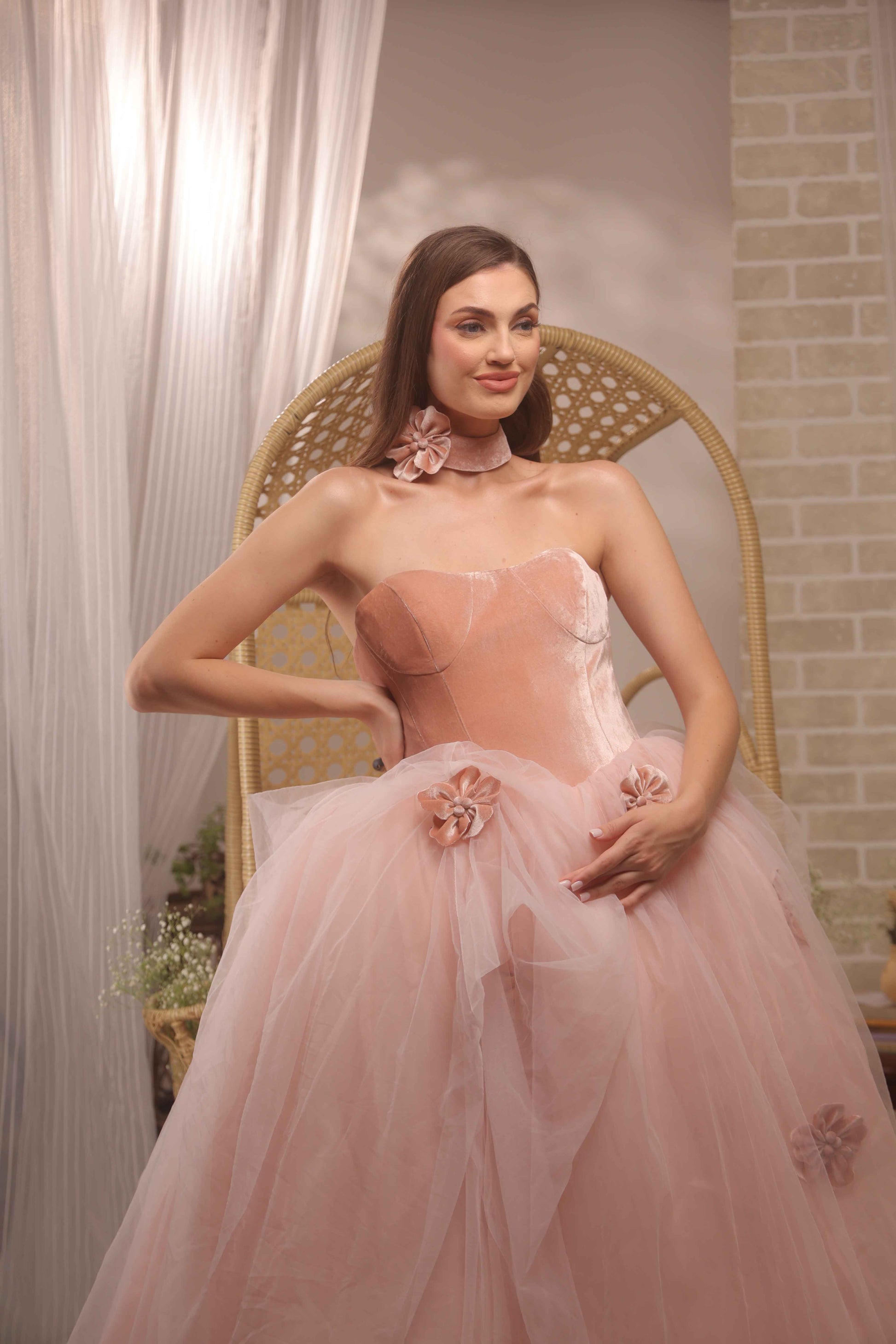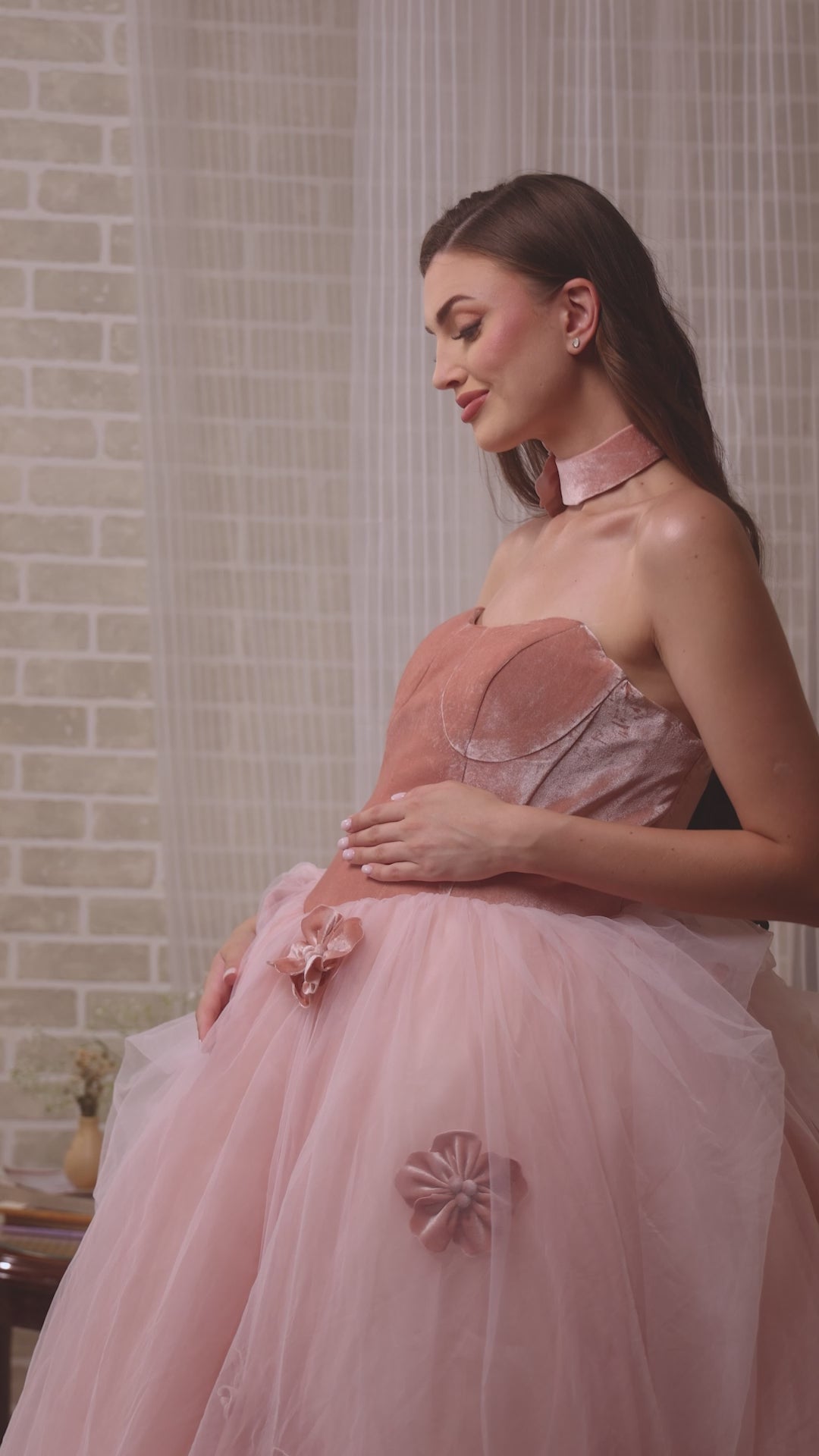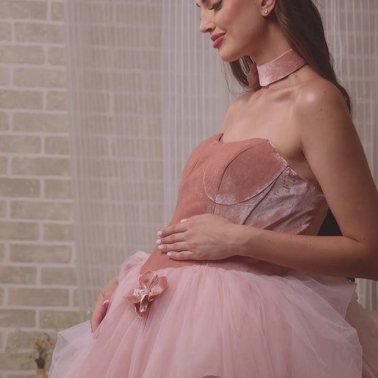 Soft, graceful, and dreamy, this blush pink maternity gown is crafted in layers of delicate tulle that flow effortlessly. The strapless bodice highlights femininity, while the subtle floral appliqué detailing adds a romantic touch. Light, airy, and elegant, this gown is designed to celebrate the glow of motherhood, making it perfect for creating fairytale-inspired maternity portraits.