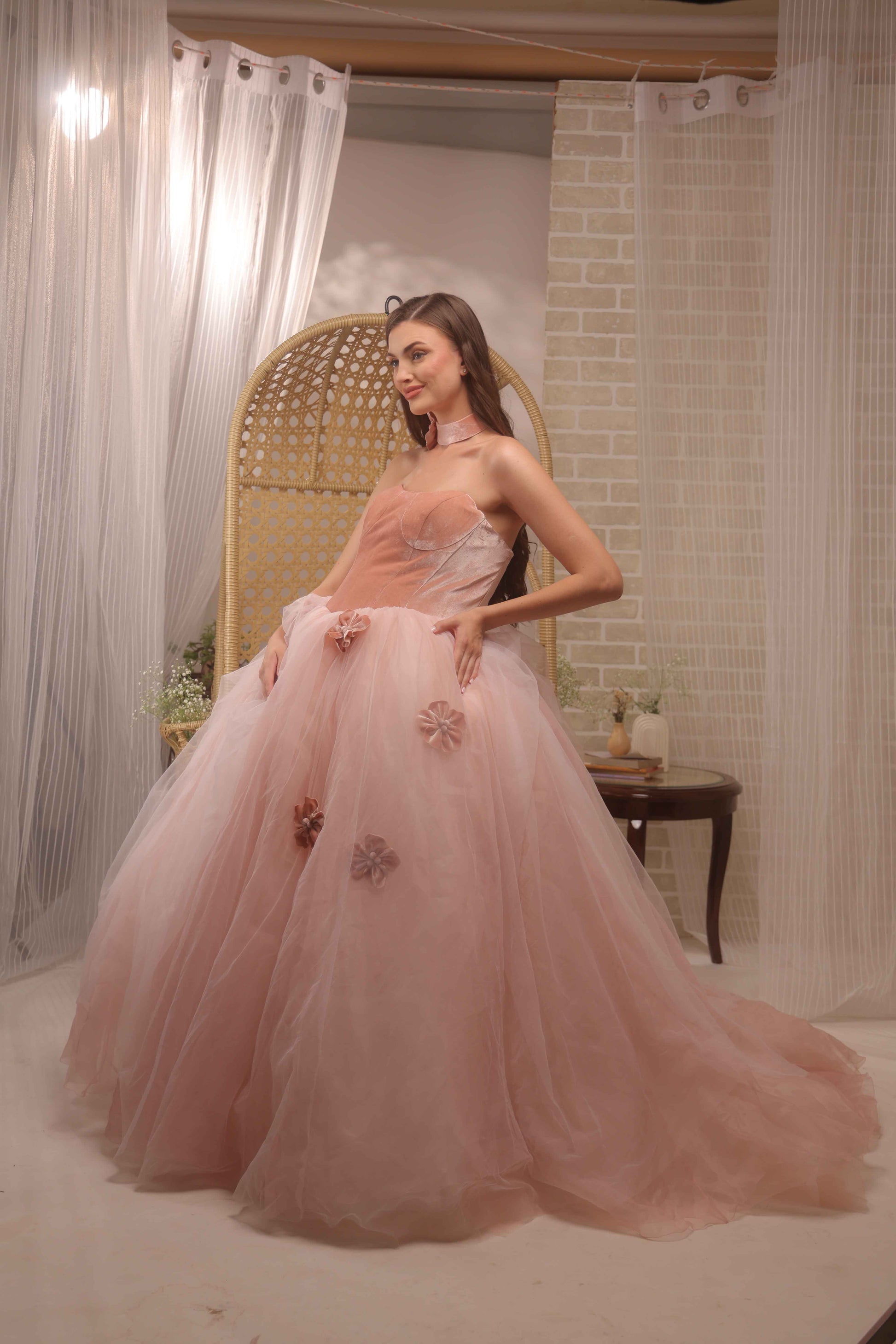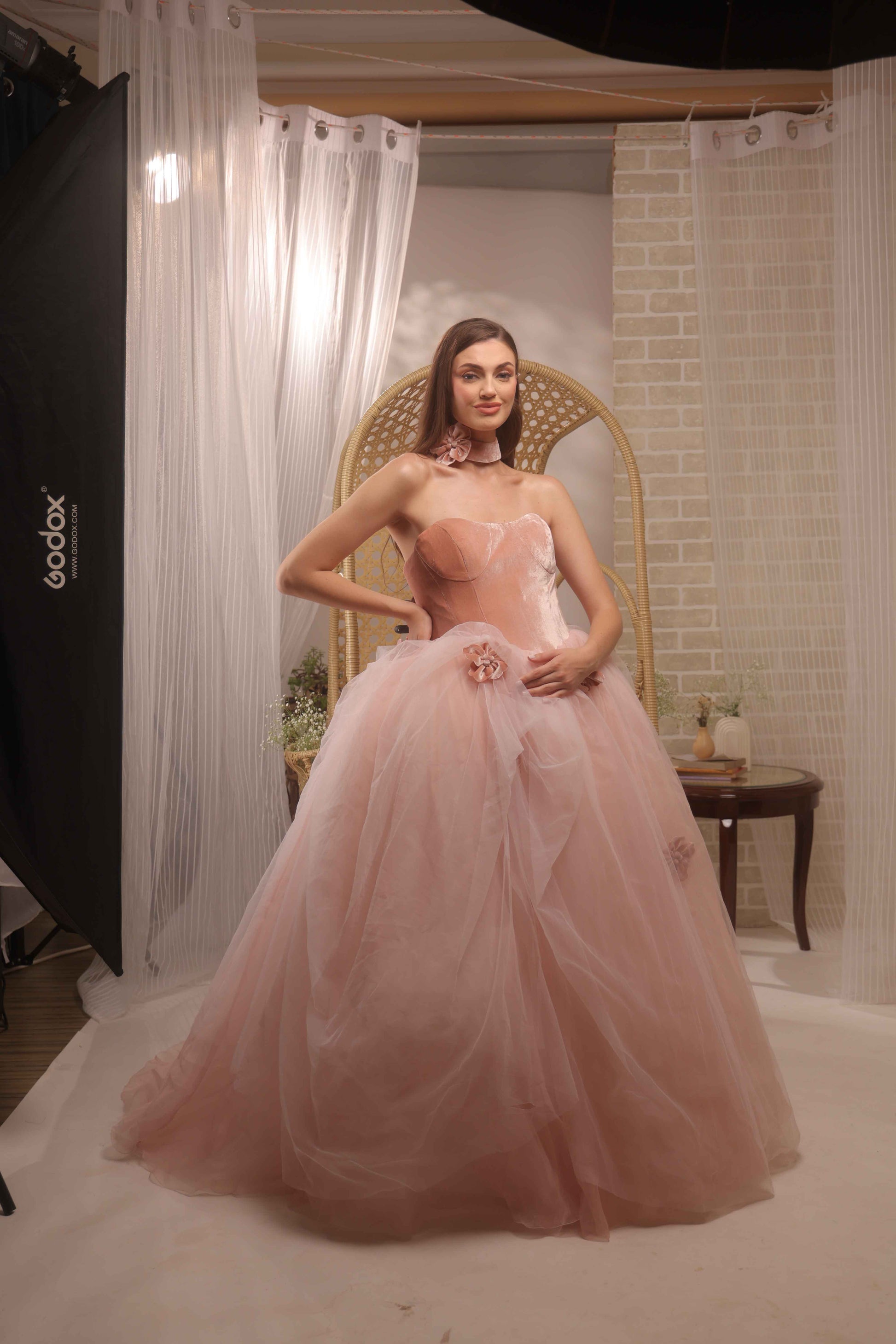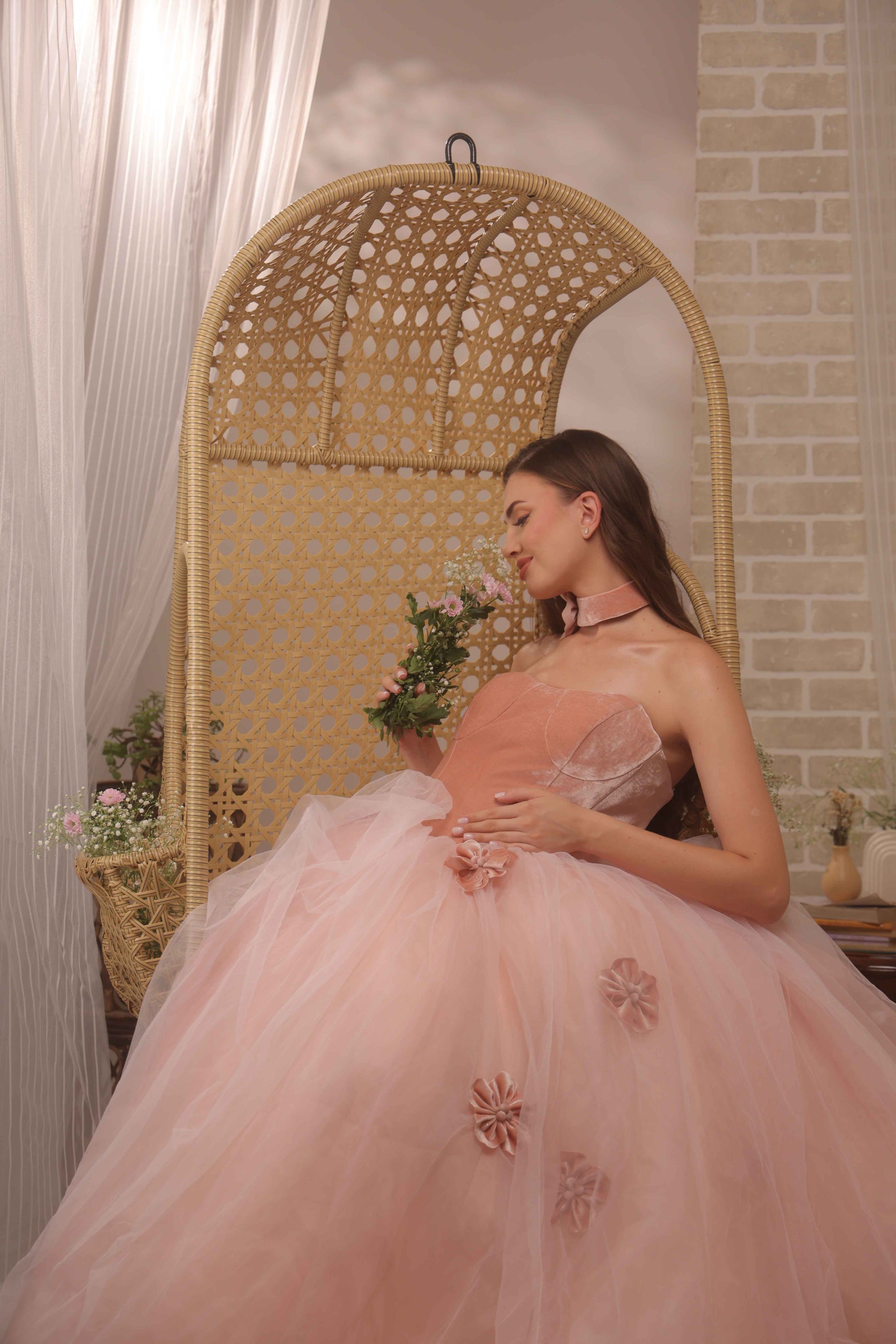 Soft, graceful, and dreamy, this blush pink maternity gown is crafted in layers of delicate tulle that flow effortlessly. The strapless bodice highlights femininity, while the subtle floral appliqué detailing adds a romantic touch. Light, airy, and elegant, this gown is designed to celebrate the glow of motherhood, making it perfect for creating fairytale-inspired maternity portraits.