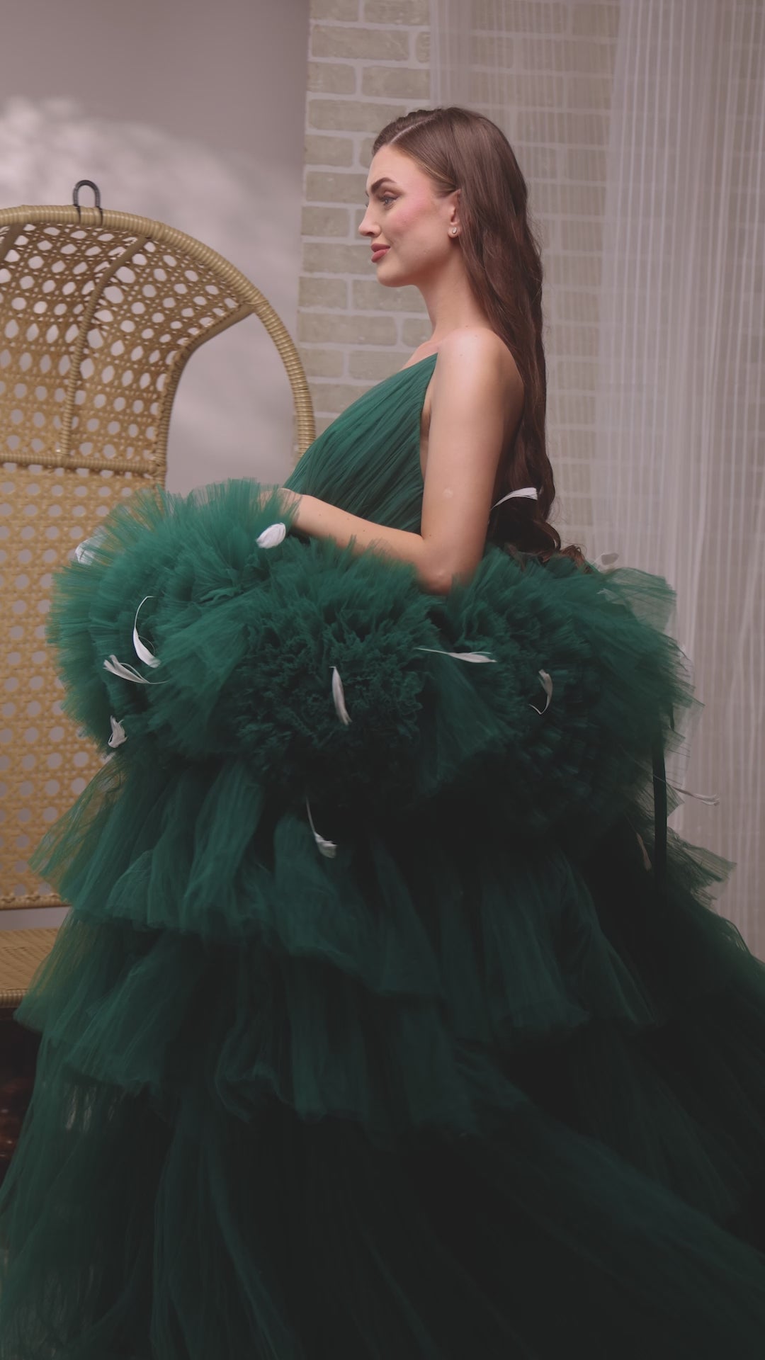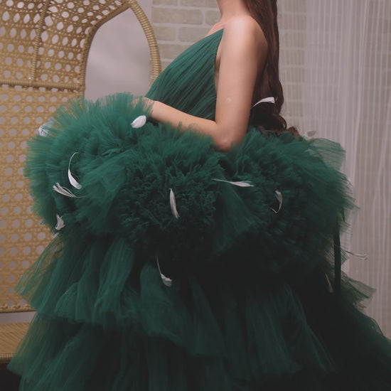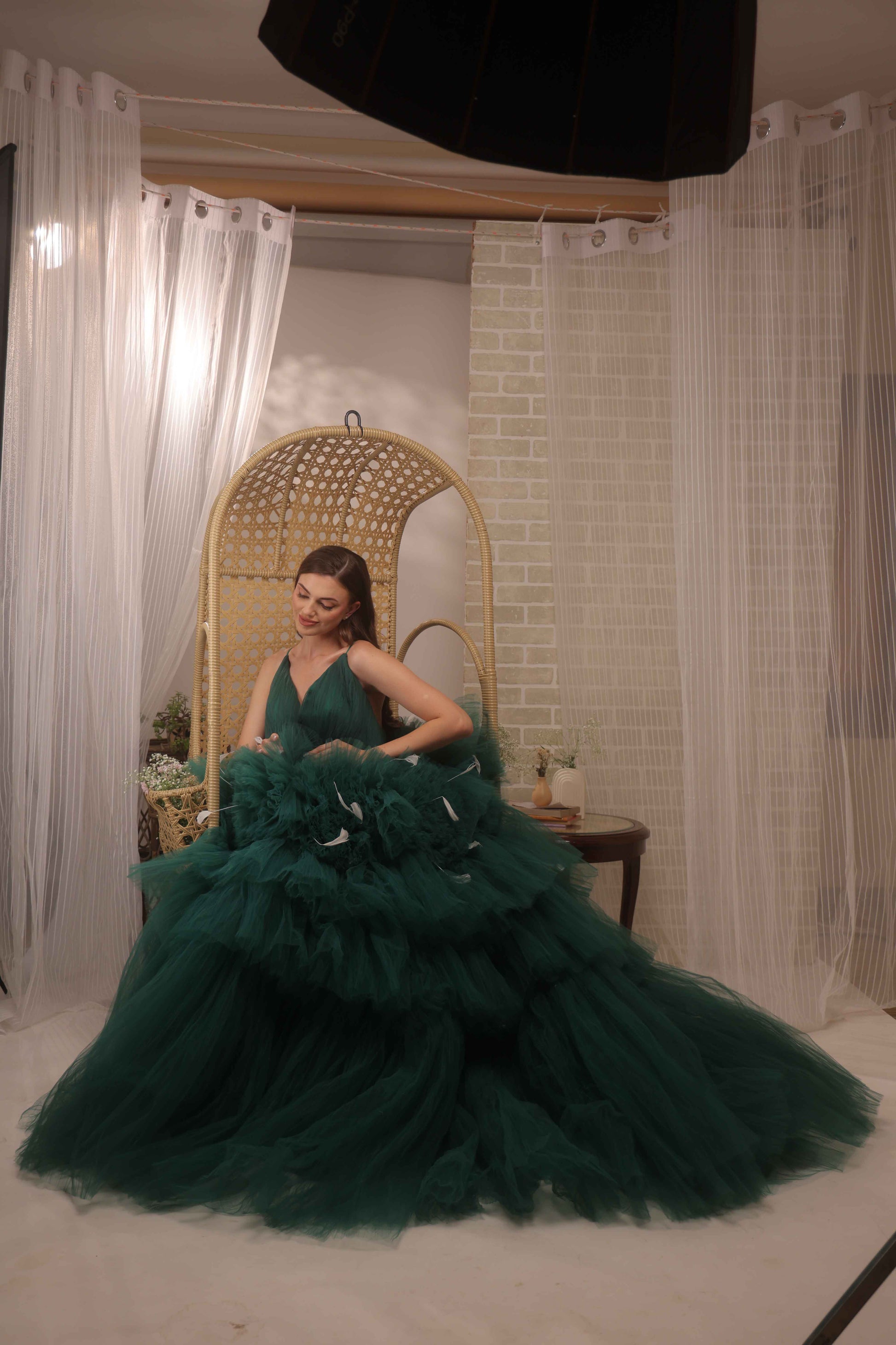 Bold and enchanting, this deep emerald green maternity gown is designed with layers of flowing tulle that create a voluminous and regal silhouette. The sleeveless V-neck bodice flatters the neckline while ensuring comfort, making it perfect for elegant maternity portraits. With its dramatic ruffles and graceful fall, this gown adds a royal charm to every photoshoot.