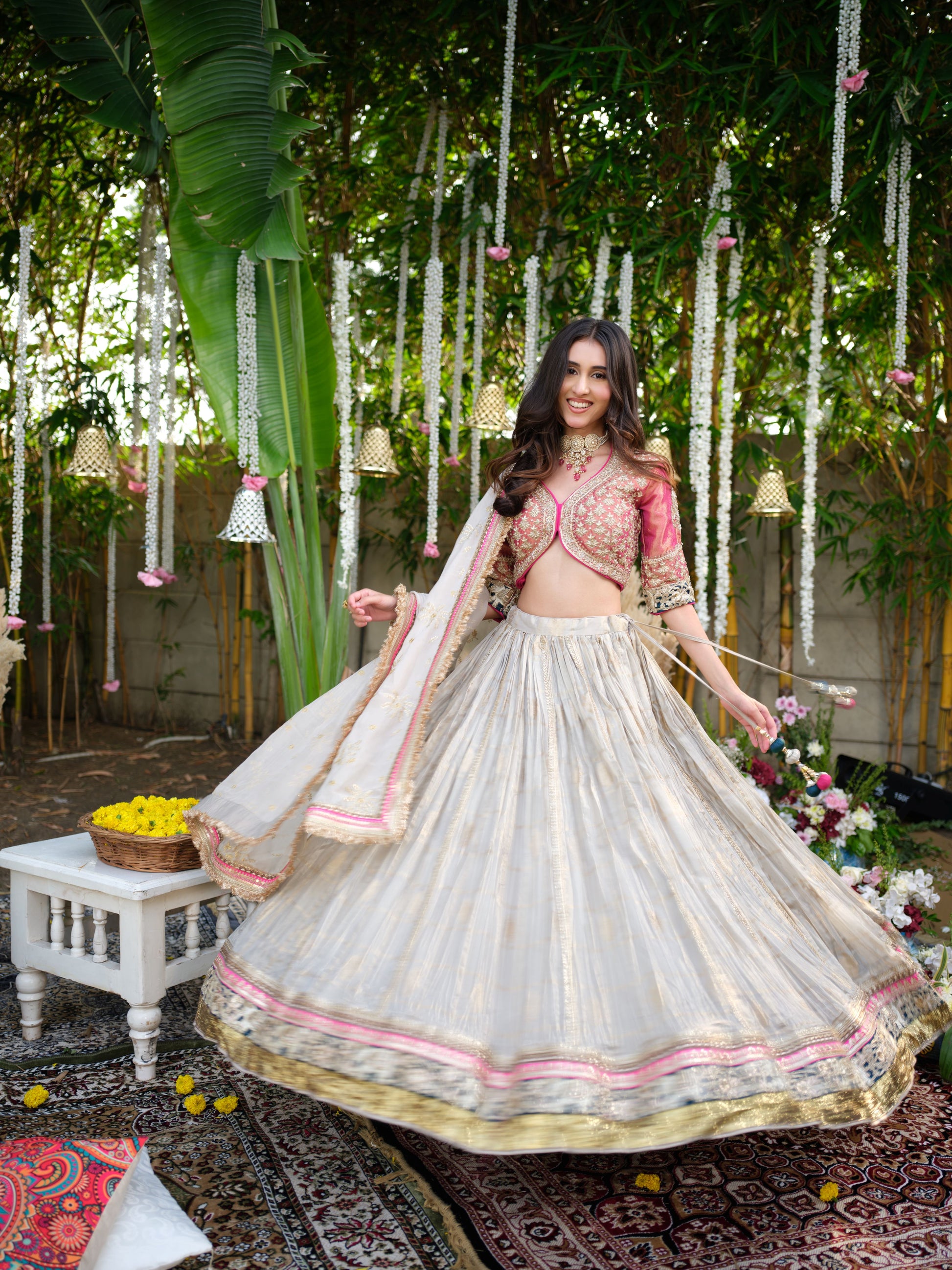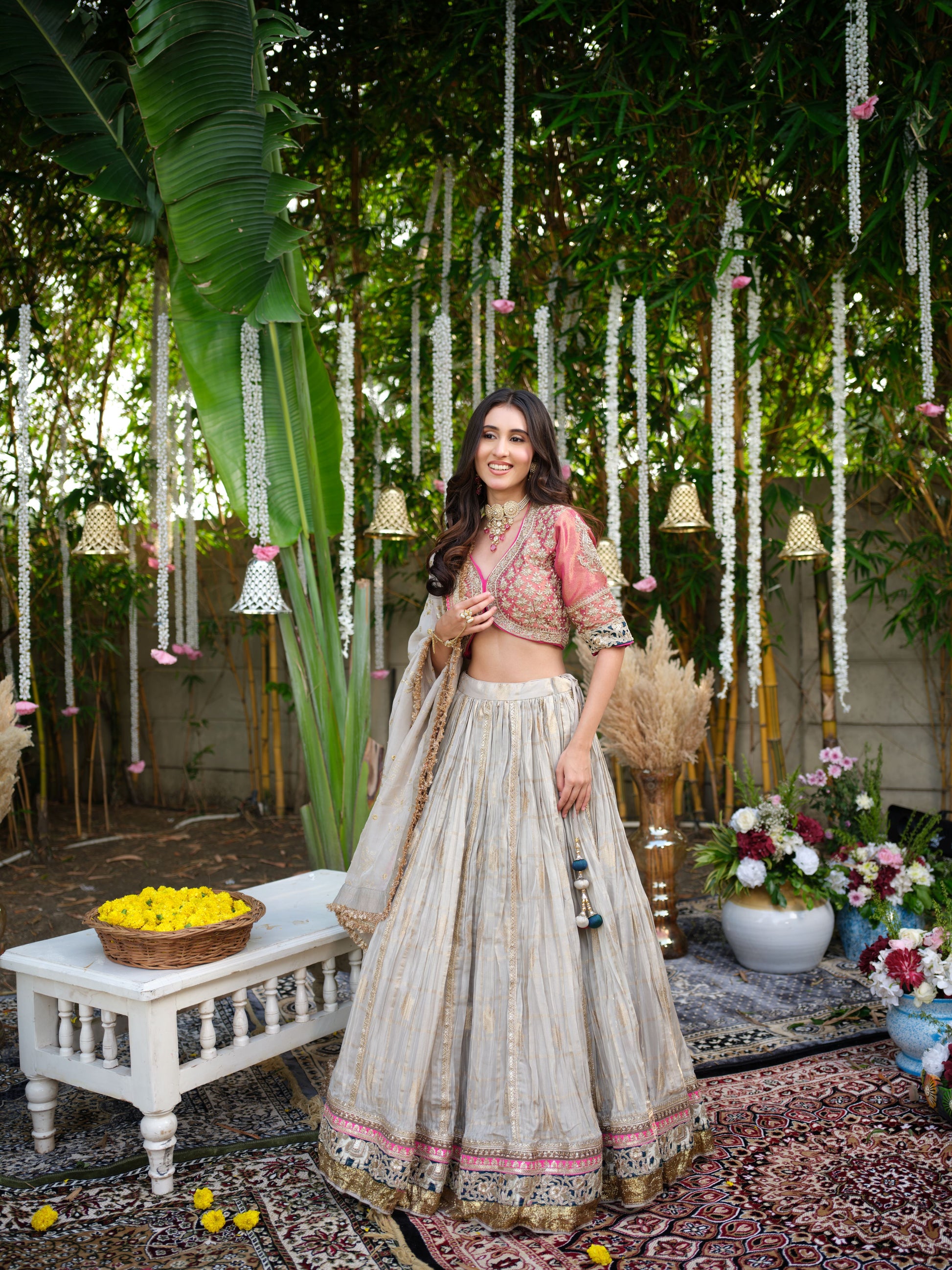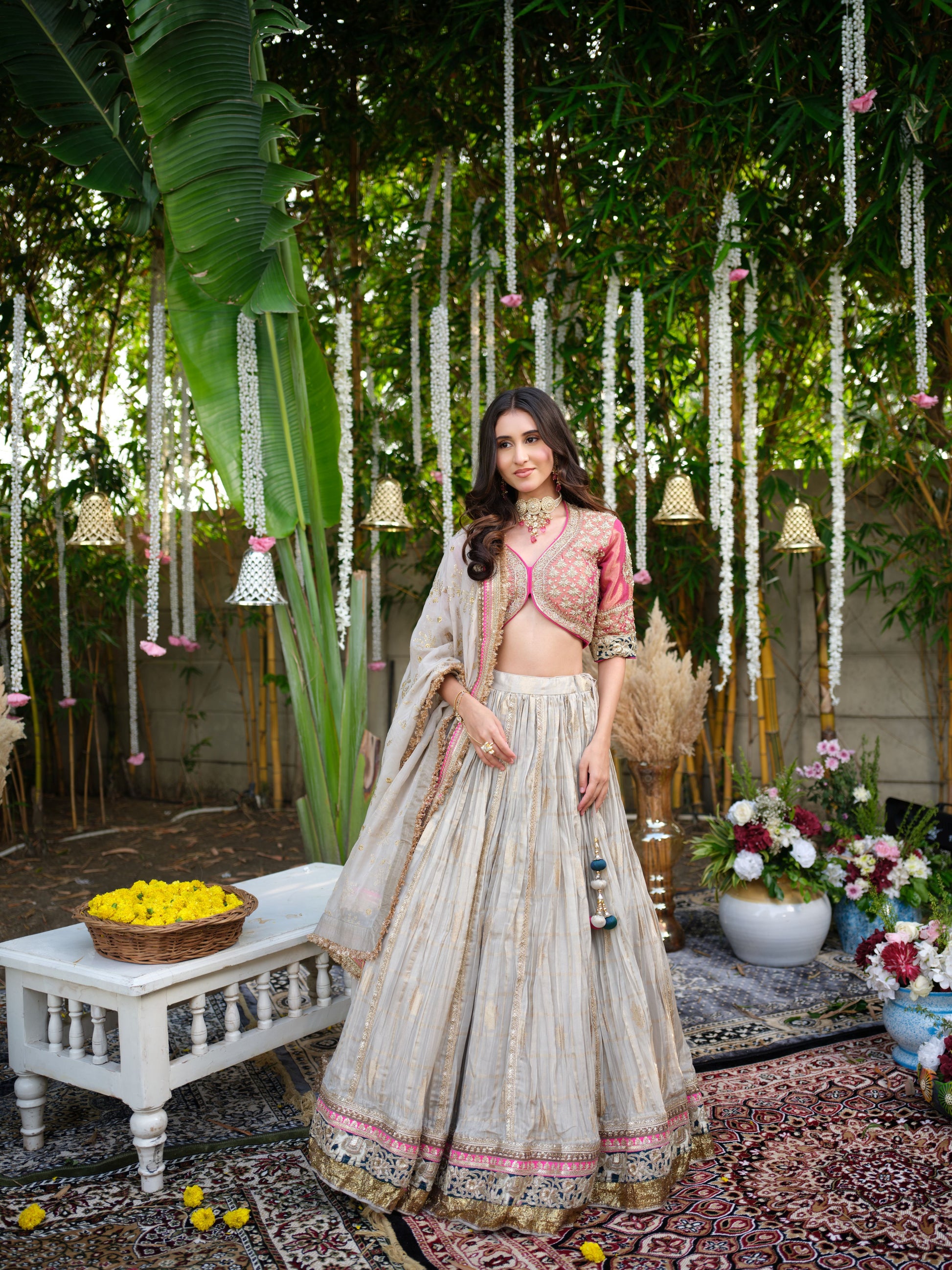 Graceful and contemporary, this lehenga set pairs a muted ivory skirt with golden undertones and a hint of shimmer, beautifully finished with intricate borders in pink and gold. The contrasting pink embroidered blouse with a modern cut adds vibrance, while the soft dupatta ties the look together with subtle elegance. Perfect for engagements, festive evenings, and wedding celebrations.