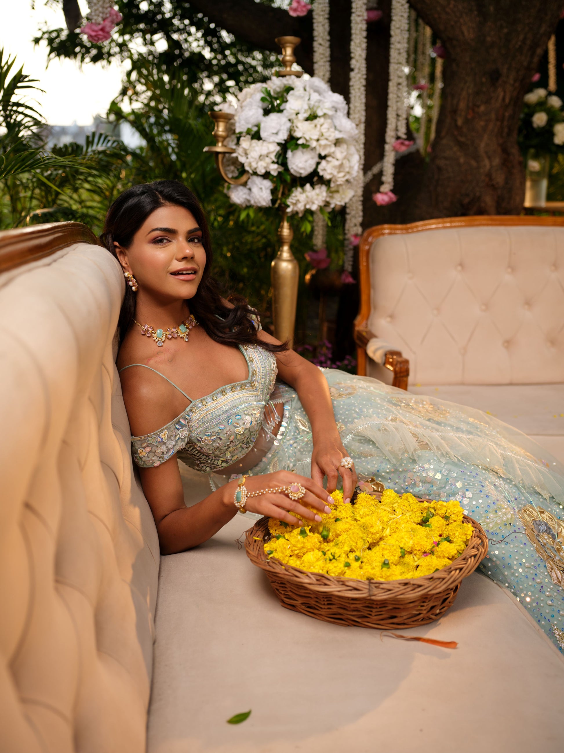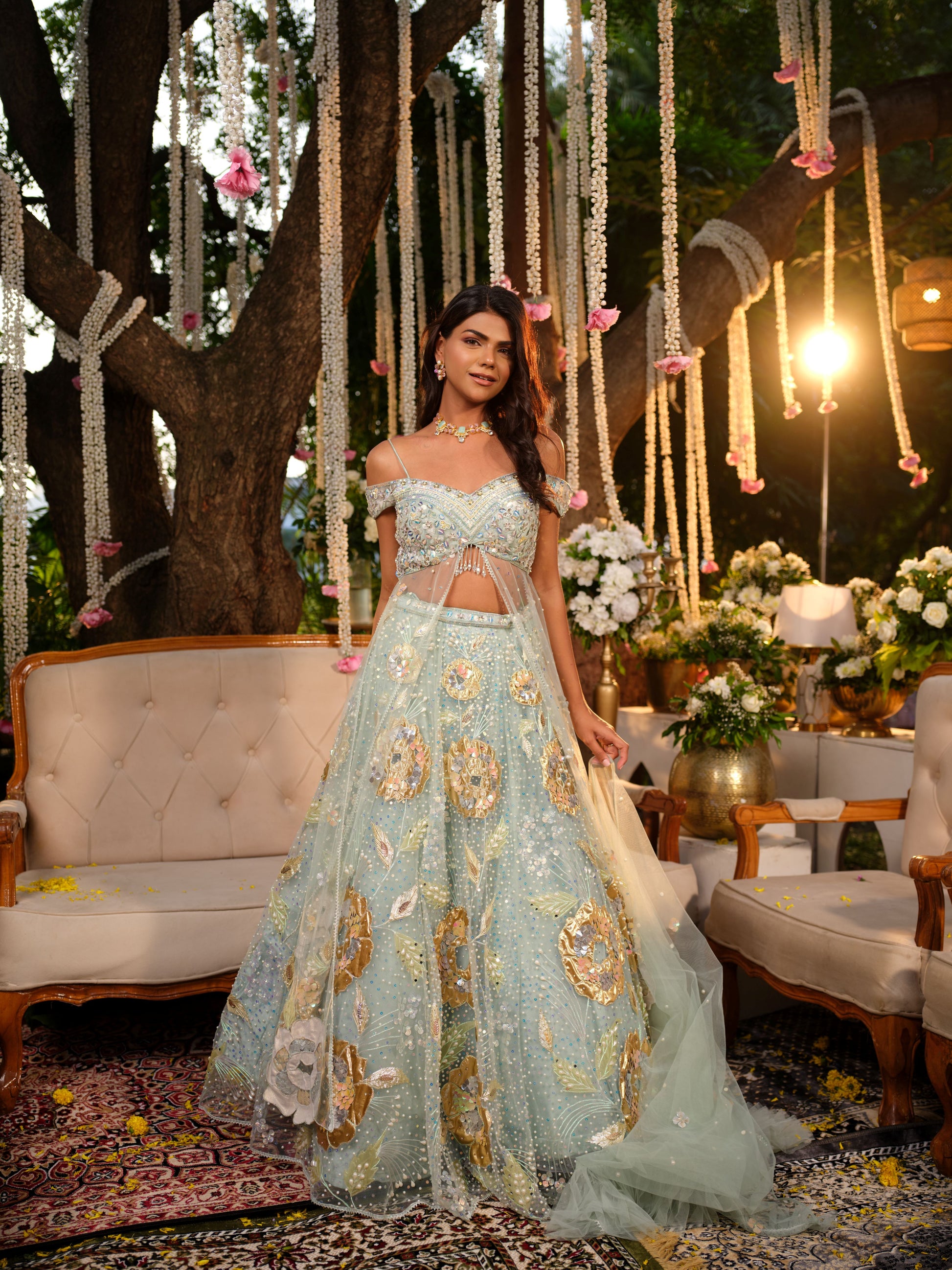 A refreshing mint green lehenga set adorned with delicate sequin embroidery, mirror work, and golden floral motifs that shimmer with every movement. The modern blouse features cold-shoulder detailing and cut-outs, paired with a flowy lehenga skirt that exudes ethereal charm. A soft net dupatta adds a graceful finishing touch to this dreamy ensemble.