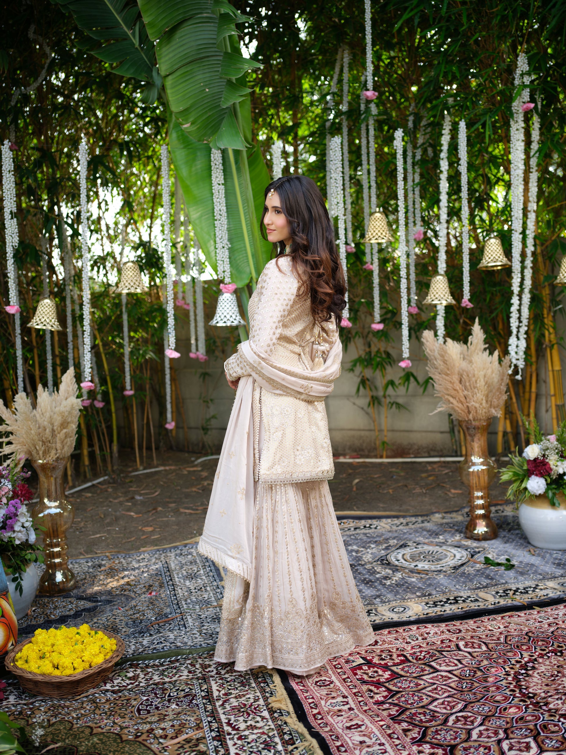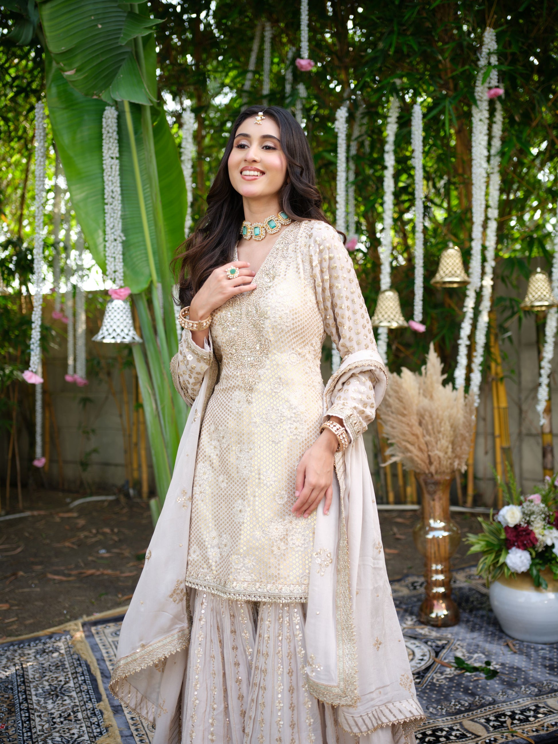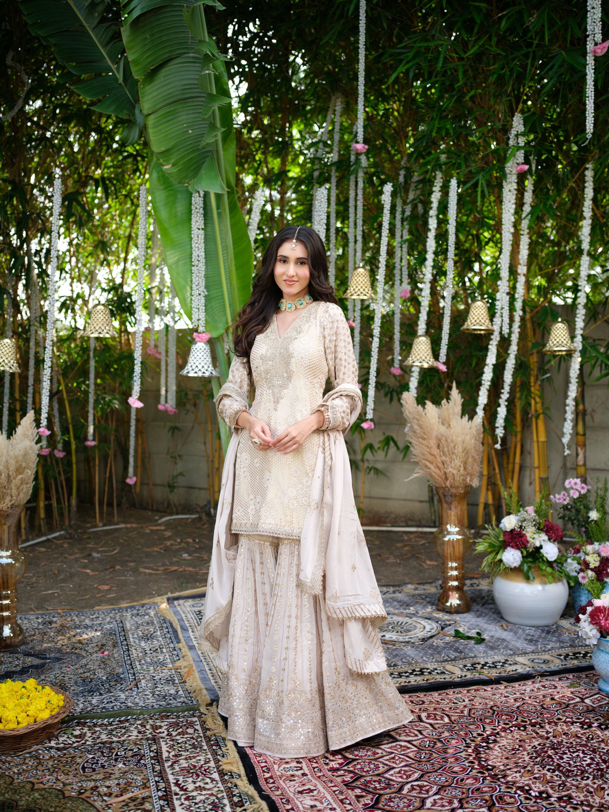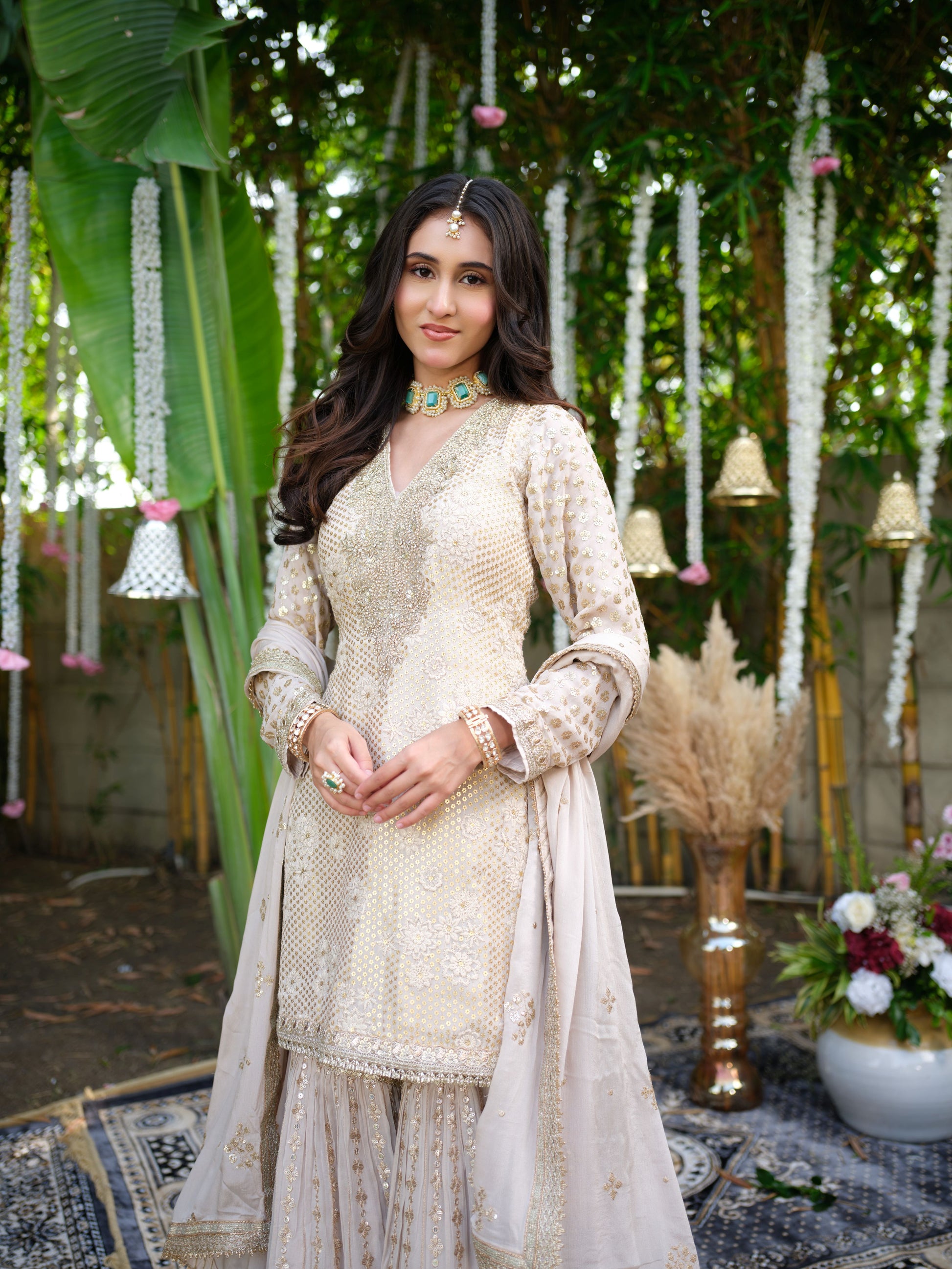 Timeless and graceful, this ivory sharara set is delicately crafted with fine embroidery and subtle sequin detailing. The long kurta, paired with a flowy sharara and a matching dupatta edged in zari, creates an ethereal look that radiates understated luxury. An ideal choice for weddings, engagement ceremonies, and festive soirées.
