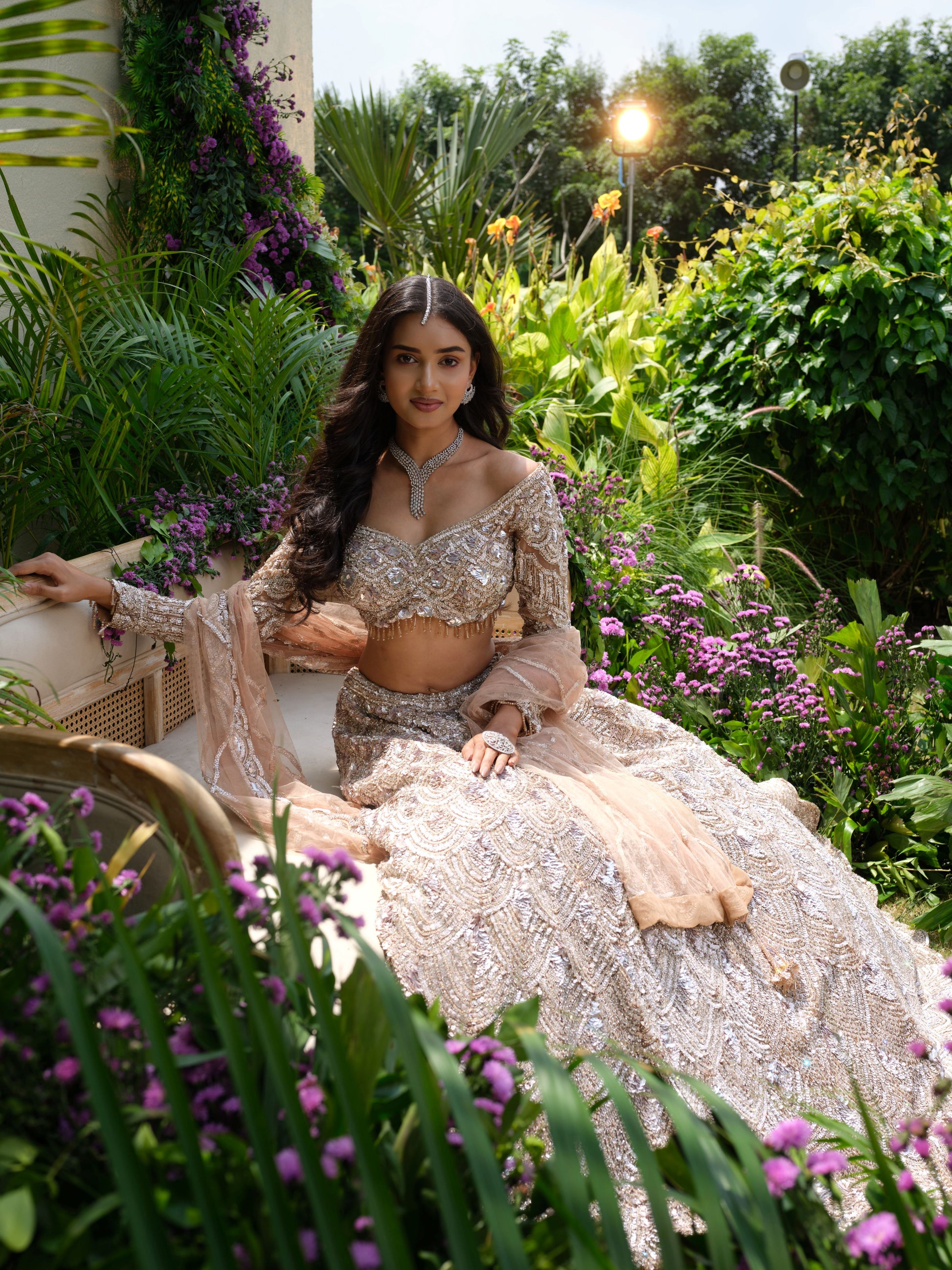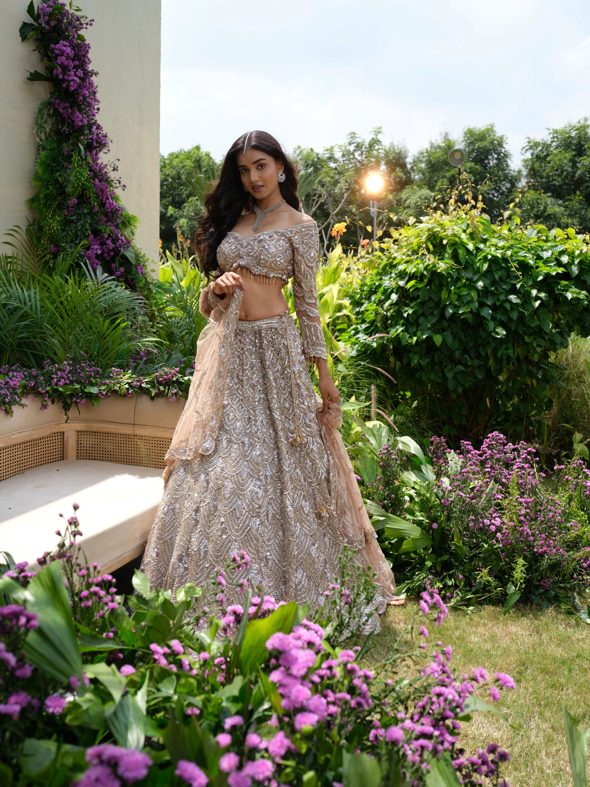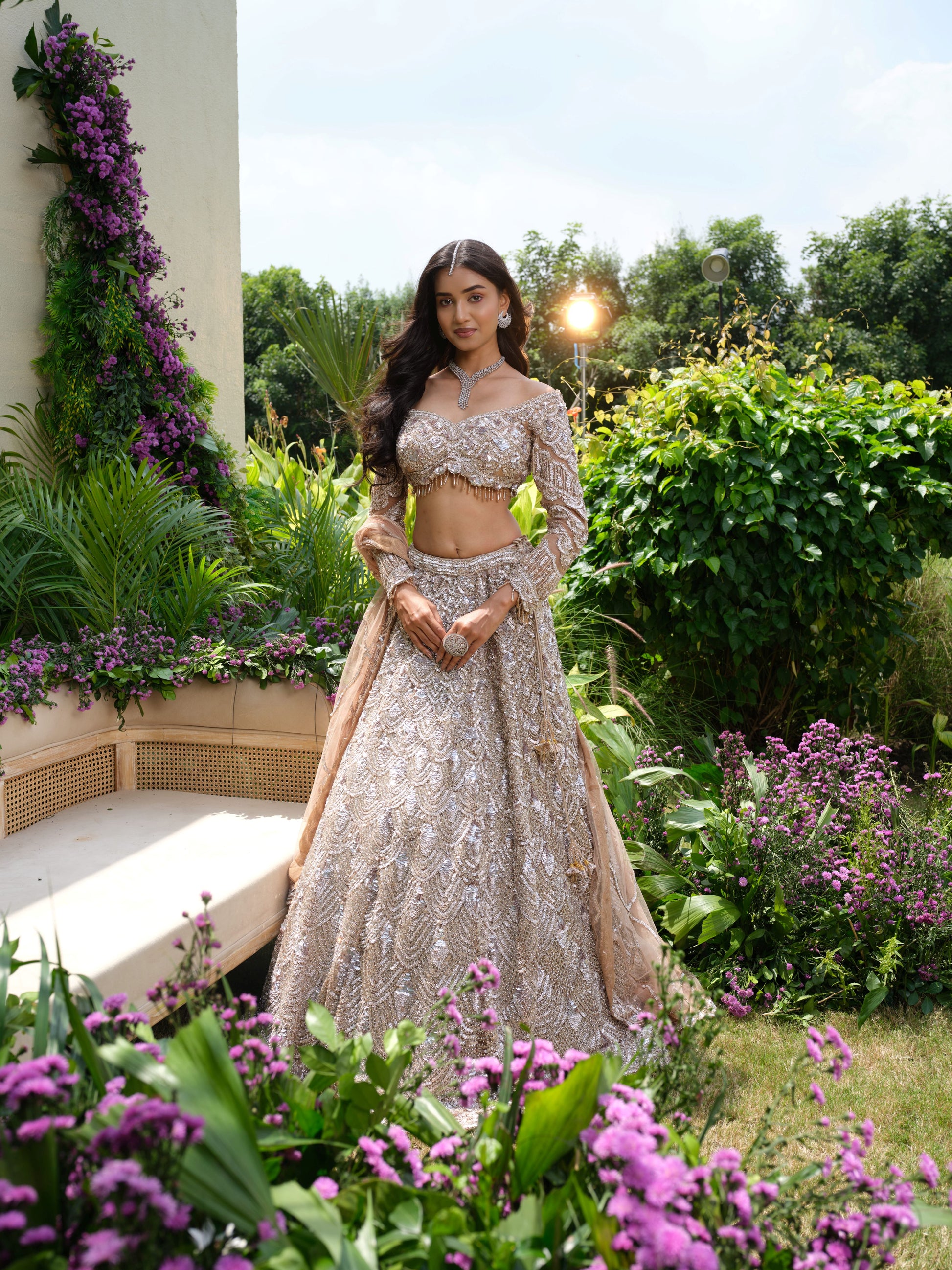 A luxurious golden beige lehenga set designed with intricate sequin work in delicate wave-like patterns, creating a shimmering, fluid effect. The off-shoulder blouse adds a contemporary and romantic touch, perfectly complementing the voluminous skirt with its rich embellishments. Paired with a soft net dupatta, this ensemble exudes glamour, sophistication, and timeless grace.