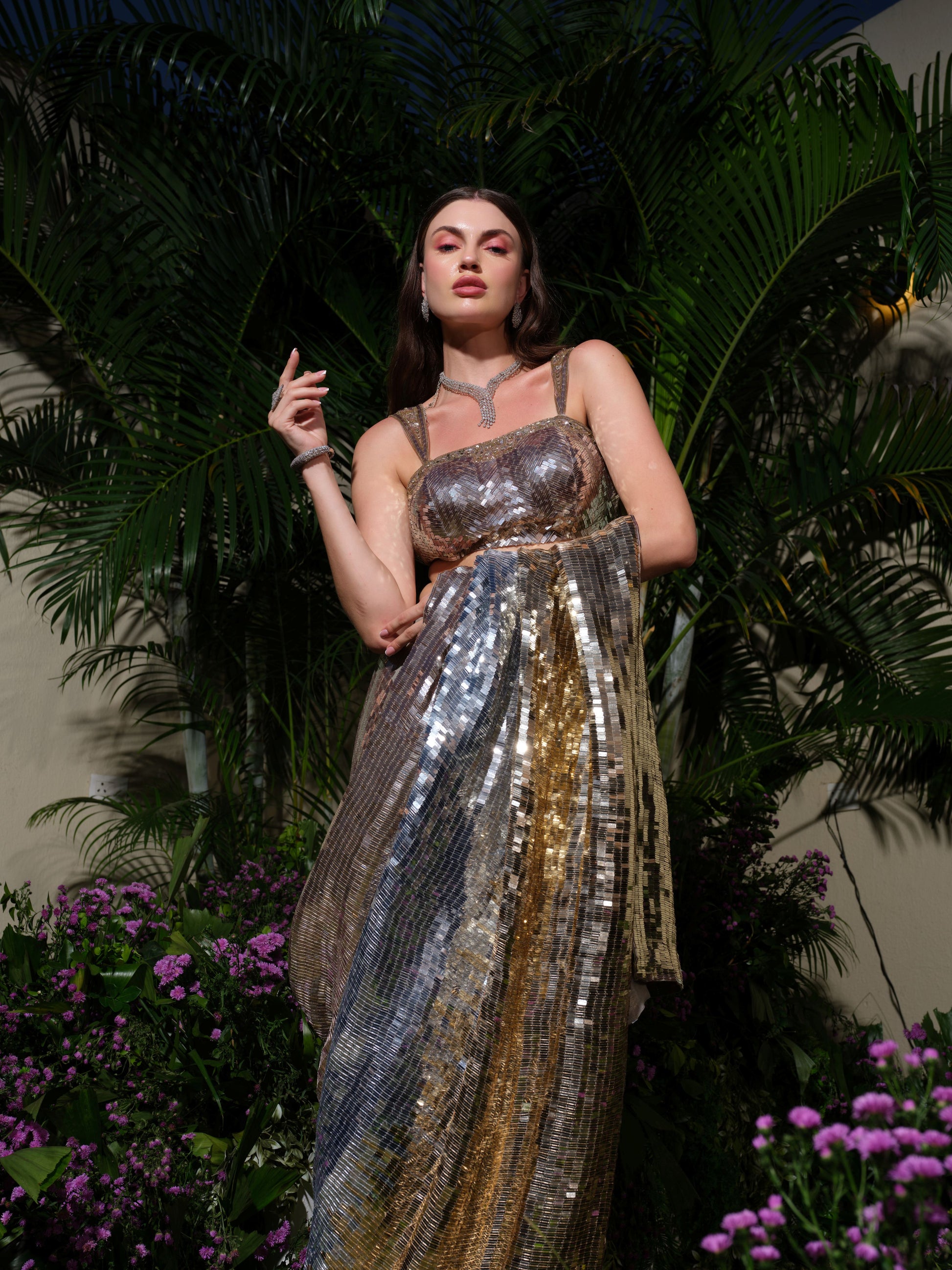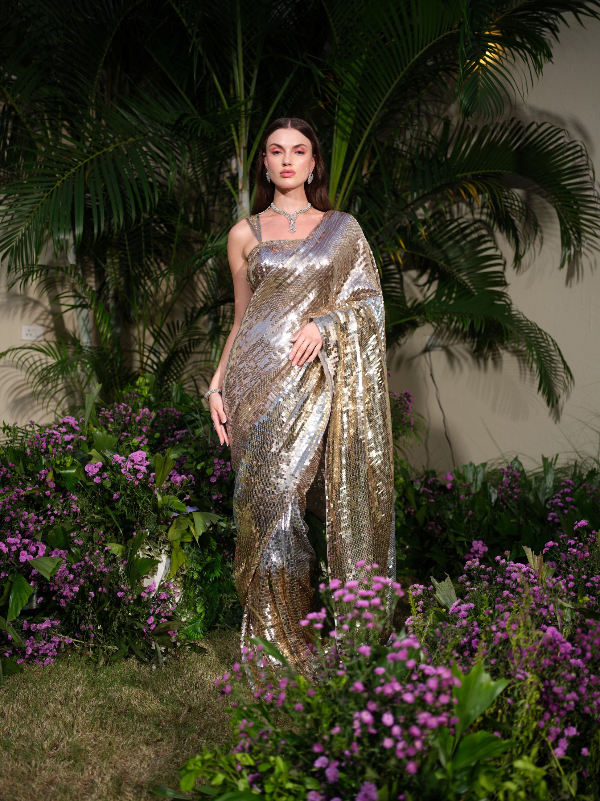 A dazzling metallic sequin saree designed to make a statement. Crafted with shimmering sequin work throughout, this saree reflects light beautifully, creating a glamorous, high-fashion look. Paired with a matching strappy blouse, it exudes modern elegance while retaining timeless saree charm.