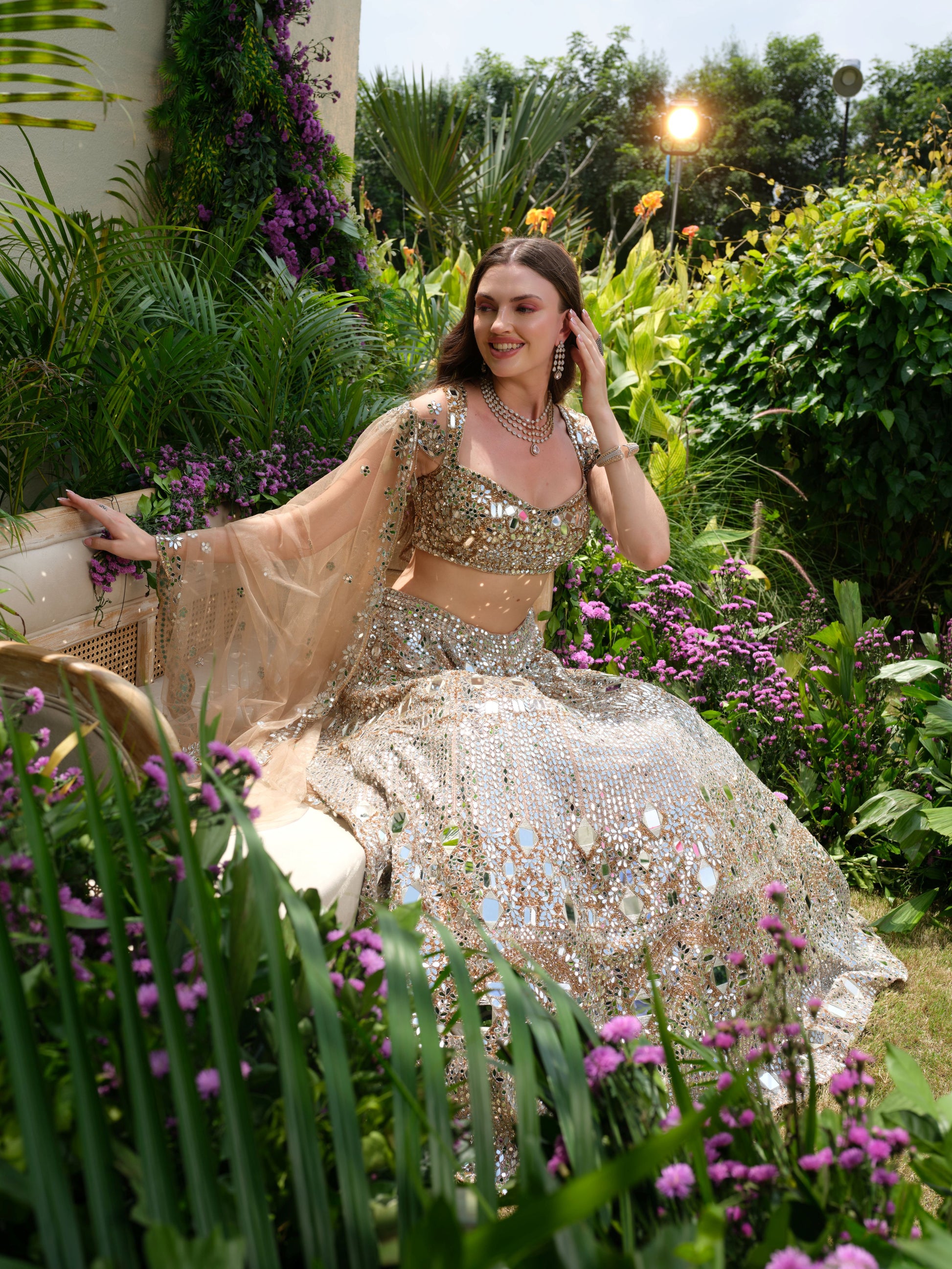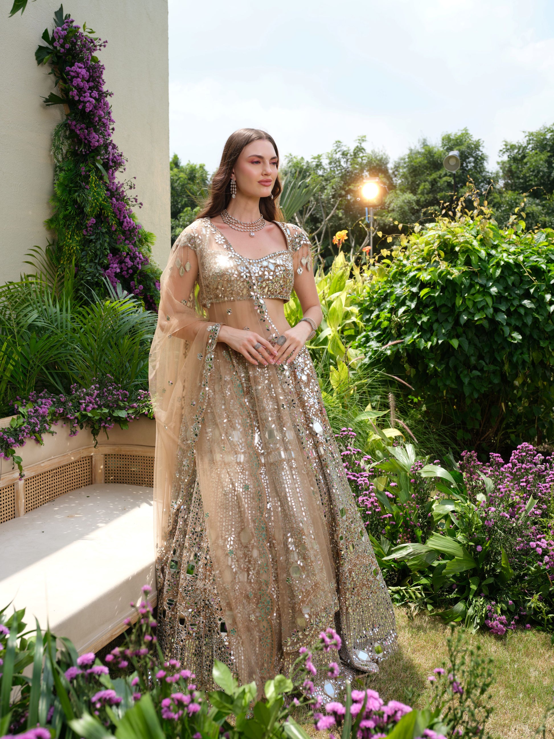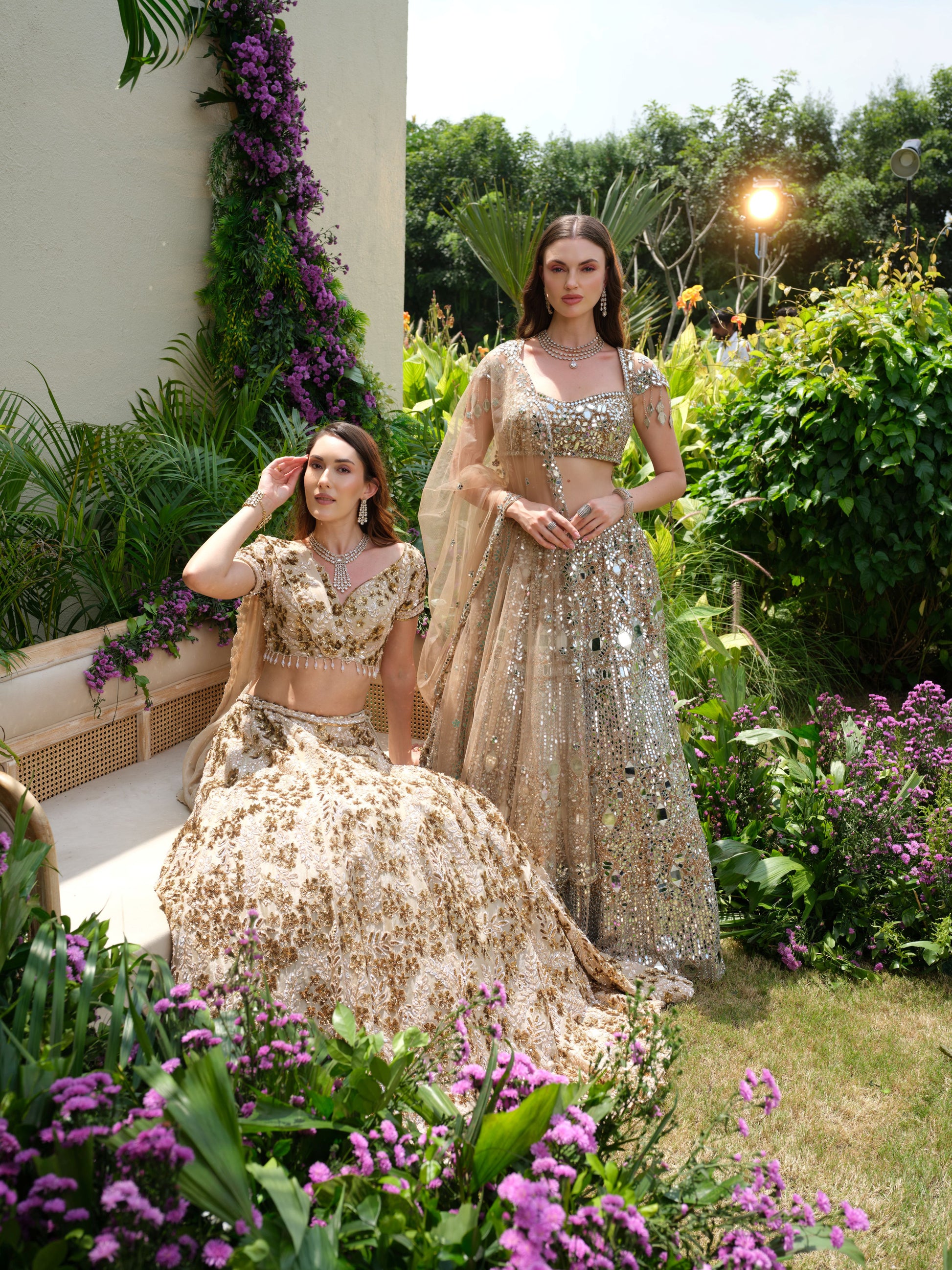 A glamorous champagne gold lehenga set crafted with shimmering sequins, delicate mirror accents, and intricate embroidery. The blouse features a modern cut with statement detailing, paired with a voluminous skirt that glimmers with every move. Styled with a sheer embellished dupatta, this ensemble radiates regal elegance and festive charm.