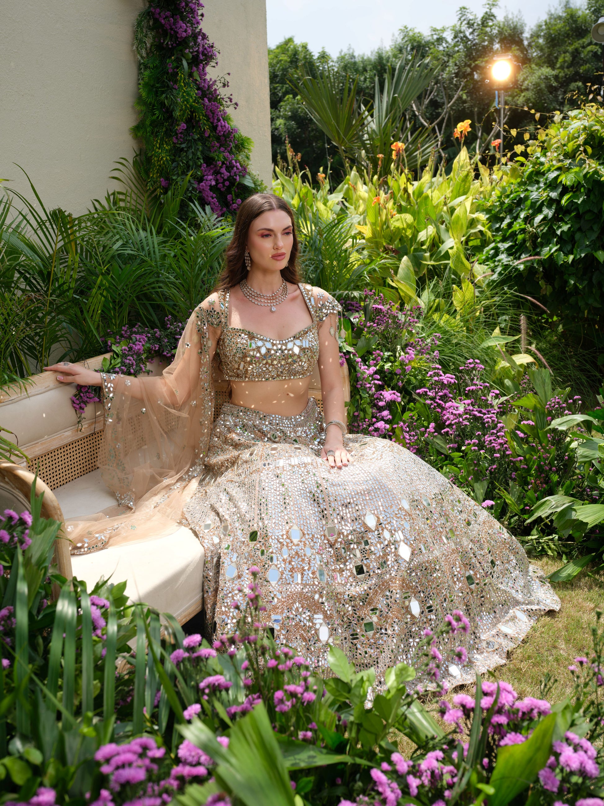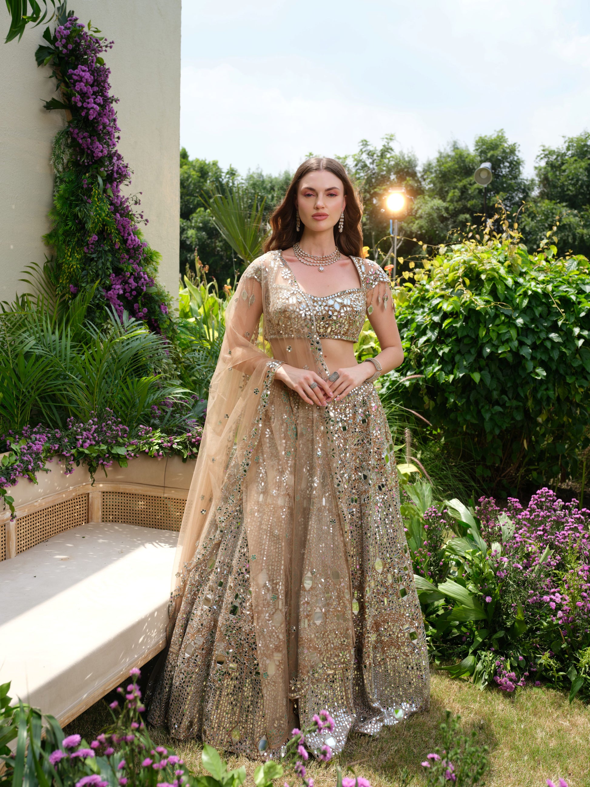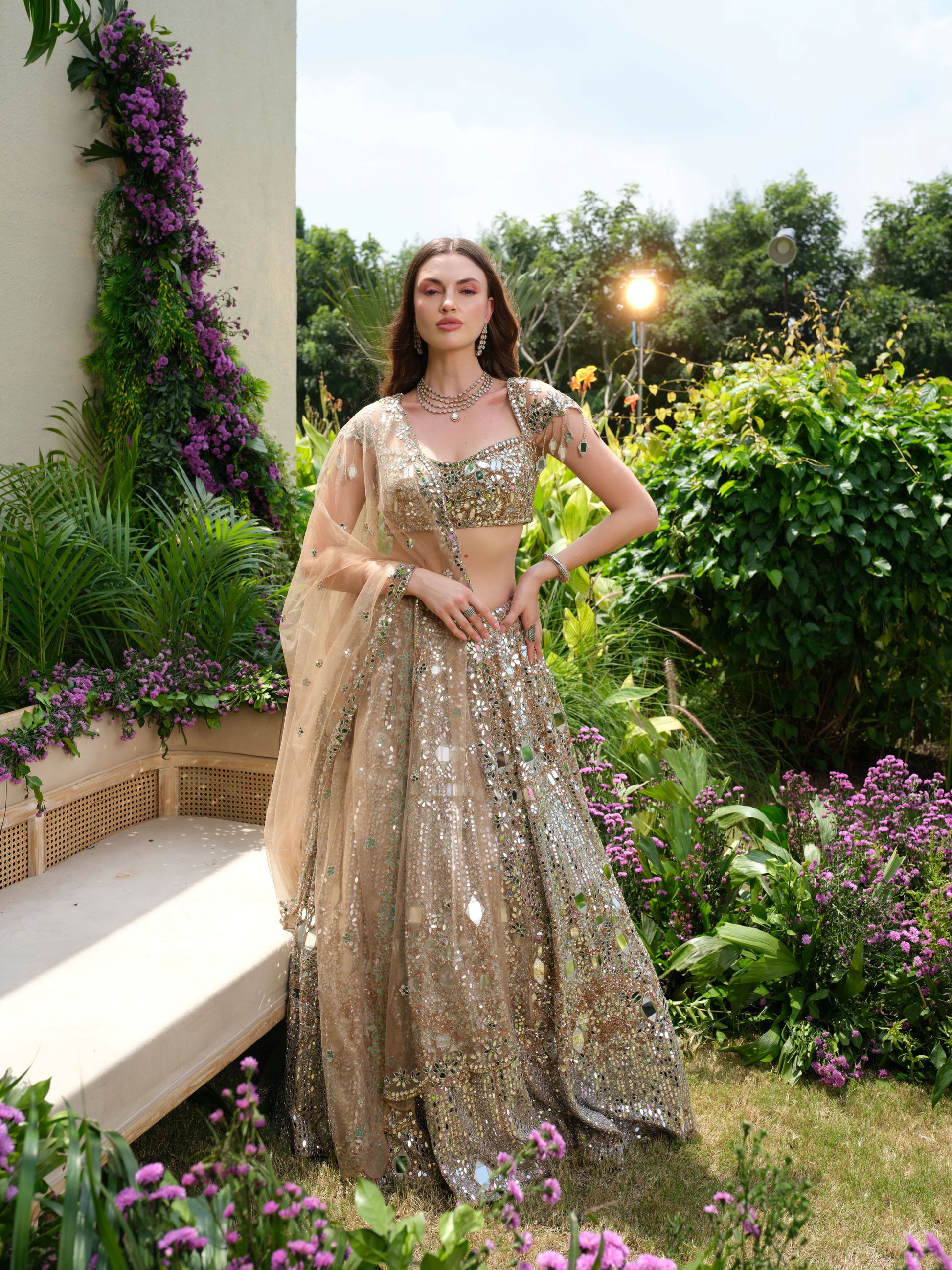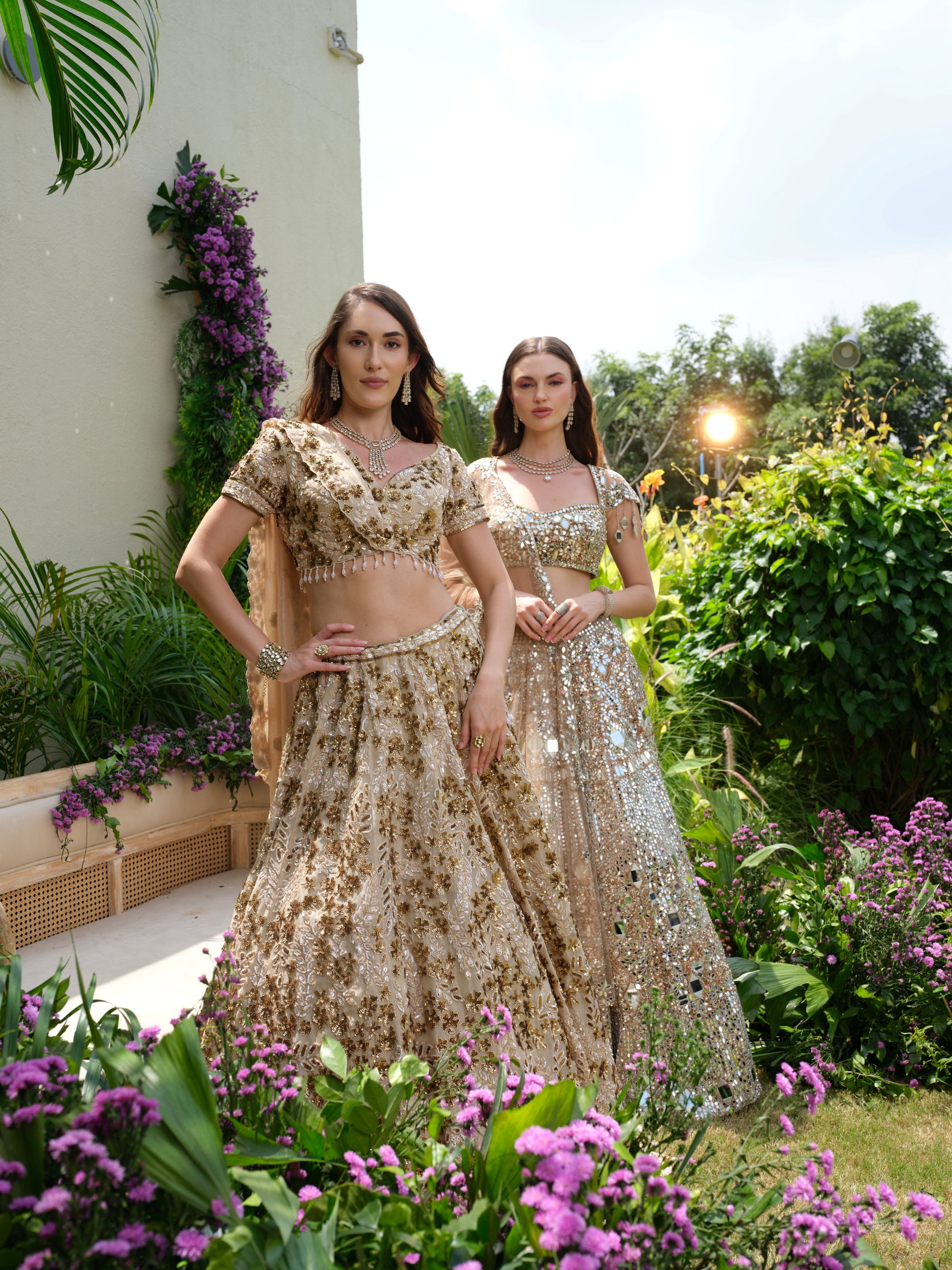 A glamorous champagne gold lehenga set crafted with shimmering sequins, delicate mirror accents, and intricate embroidery. The blouse features a modern cut with statement detailing, paired with a voluminous skirt that glimmers with every move. Styled with a sheer embellished dupatta, this ensemble radiates regal elegance and festive charm.