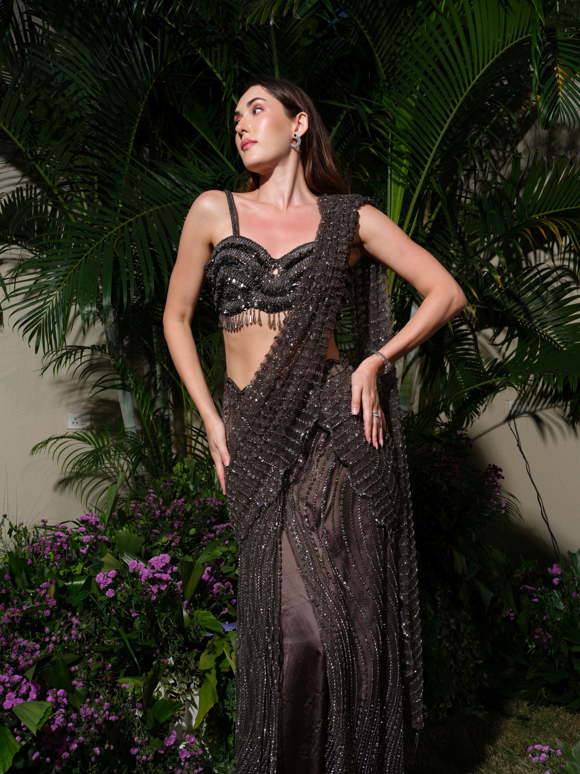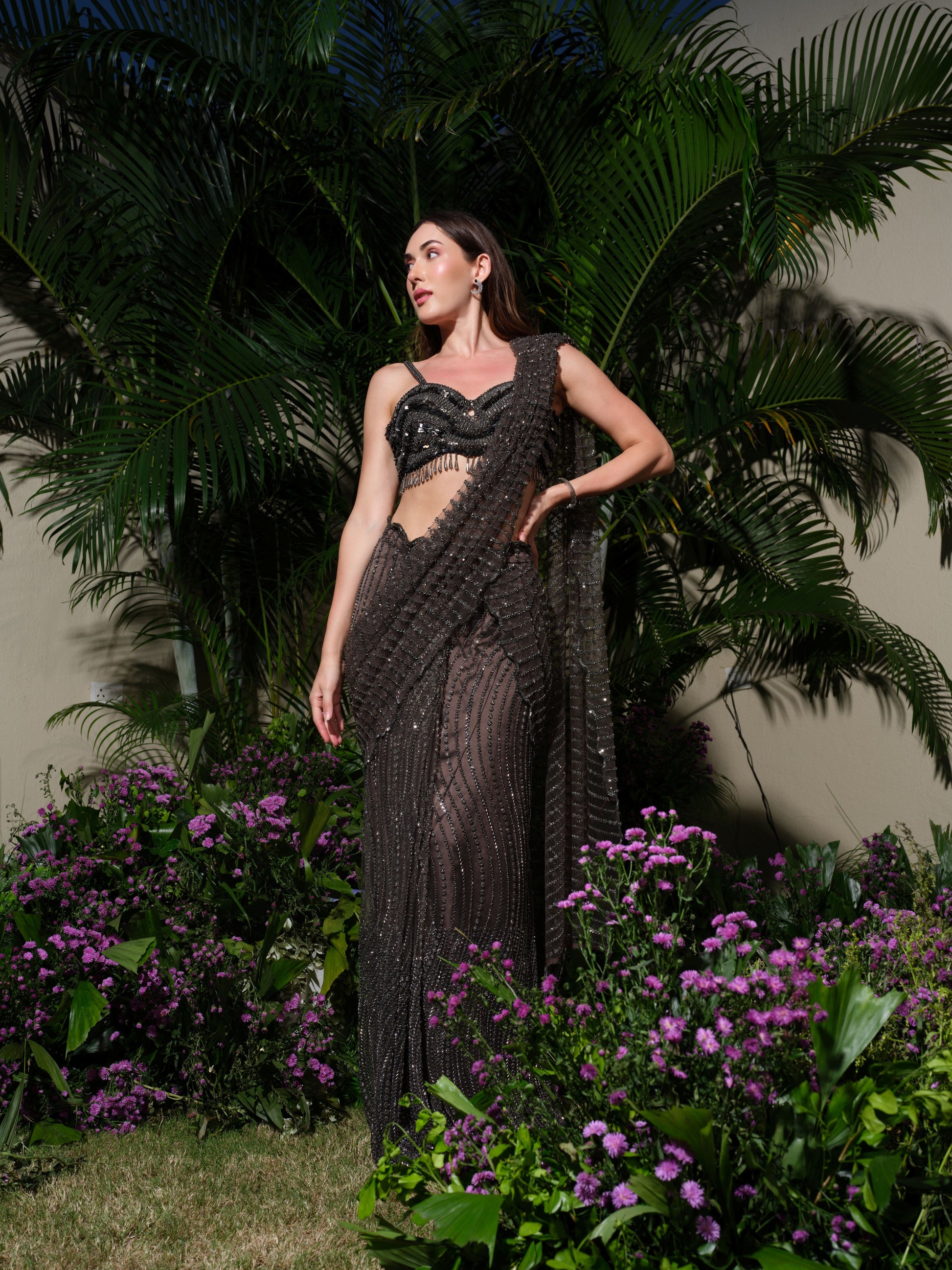 A sultry, modern take on the saree, this ensemble features a sheer drape intricately adorned with sequins and beadwork that shimmer with every movement. Paired with a structured bralette-style blouse highlighted with fringe details, the look is both bold and glamorous. The sheer yet sophisticated design makes this outfit a true head-turner, embodying contemporary elegance.