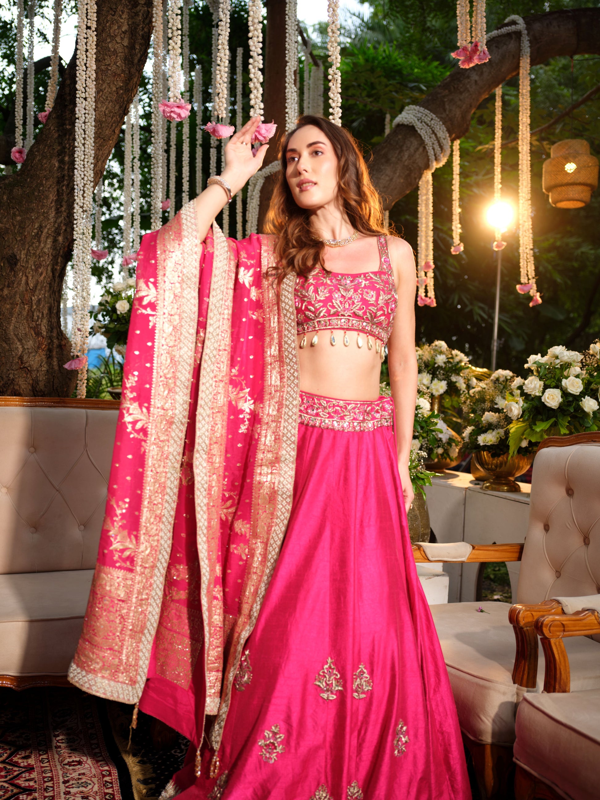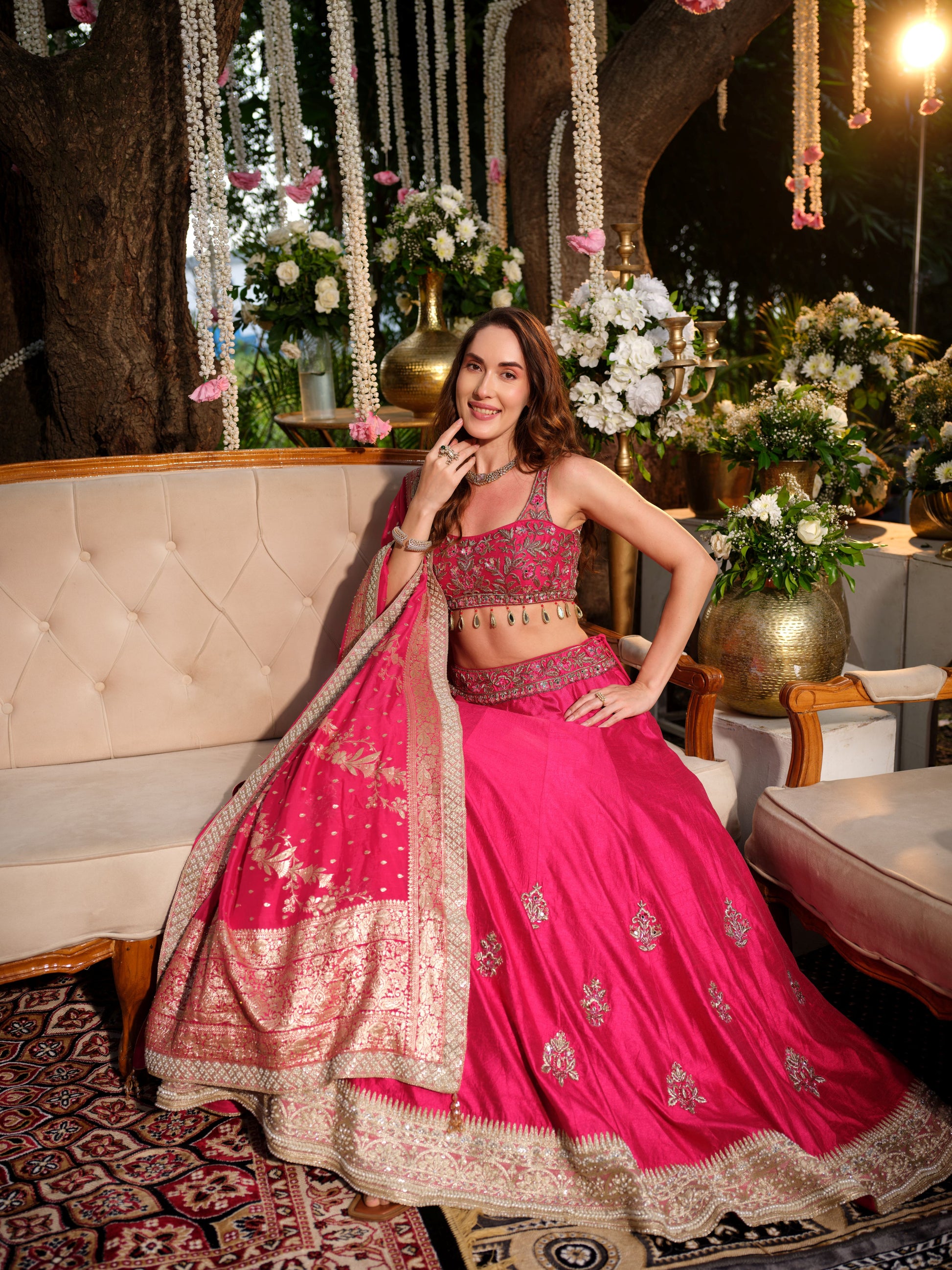 Exuding grace and tradition, this rani pink lehenga set is a timeless classic for festive and wedding occasions. The lehenga features delicate golden motifs, accentuated with an intricately woven border that lends richness to the ensemble. Paired with a matching blouse embellished with fine detailing and a complementing dupatta adorned with traditional patterns, this outfit blends vibrancy with elegance.