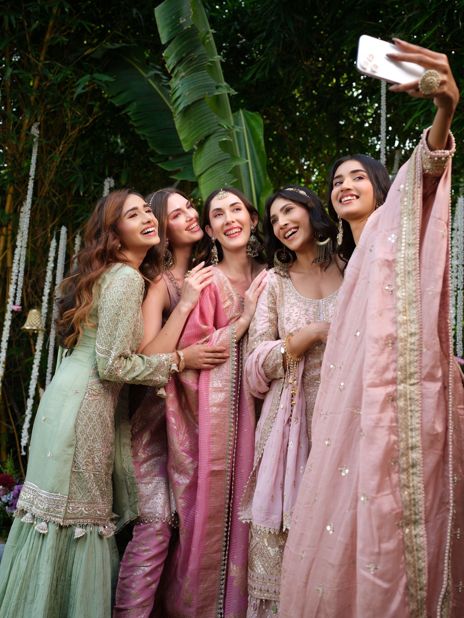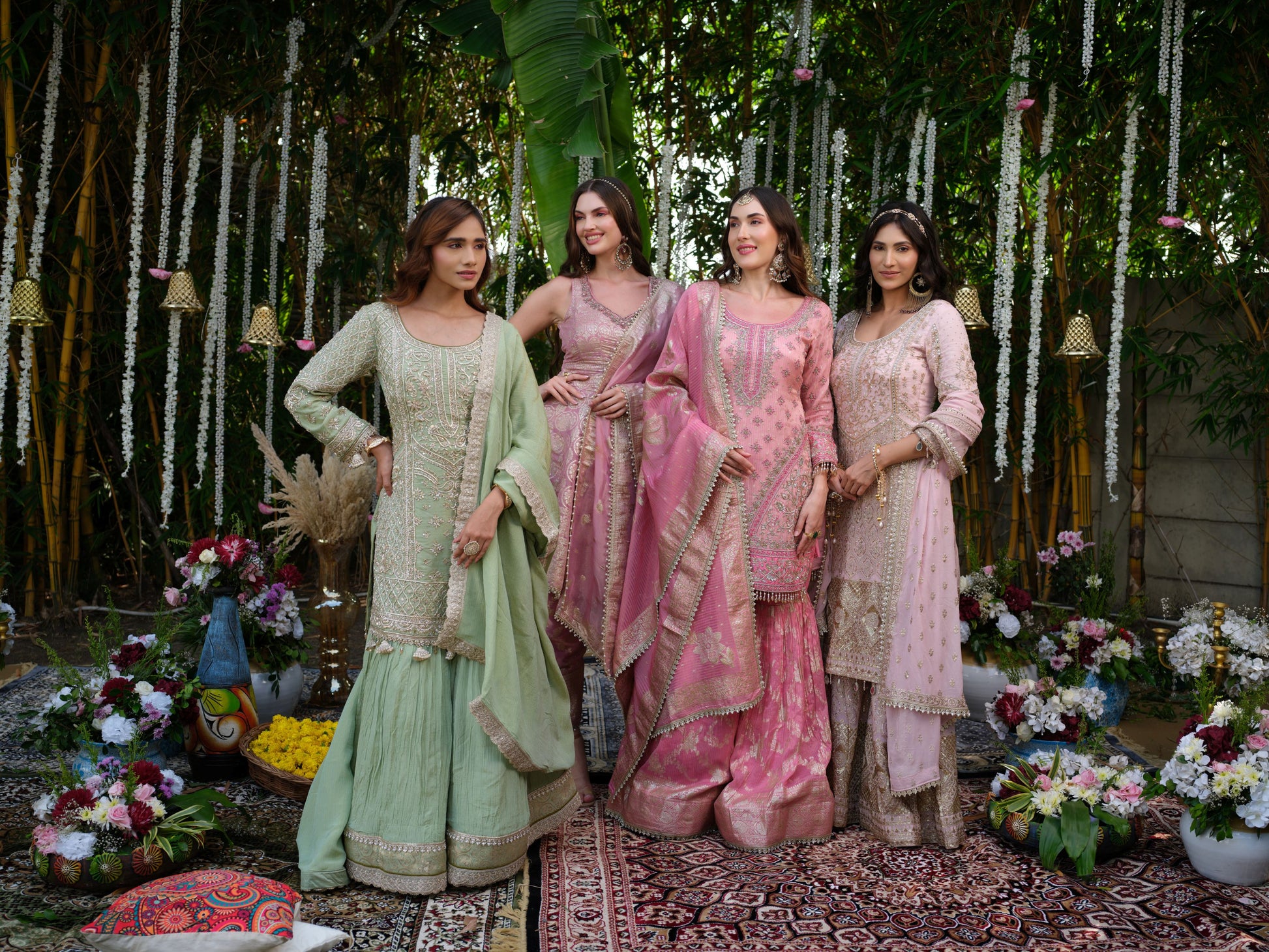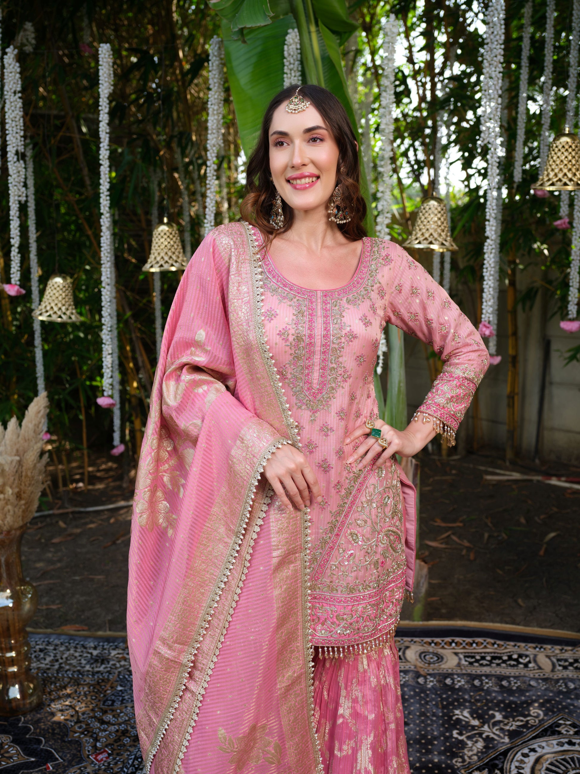 Elegant and timeless, this soft blush pink sharara set features a delicately embroidered kurta with intricate zari and sequin work. Paired with flowy printed sharara bottoms and a rich dupatta with golden zari borders, the ensemble radiates refined charm. A perfect choice for festive gatherings, wedding rituals, or traditional celebrations.