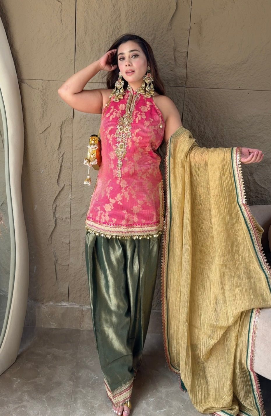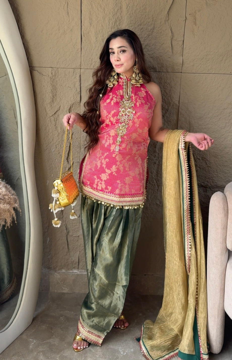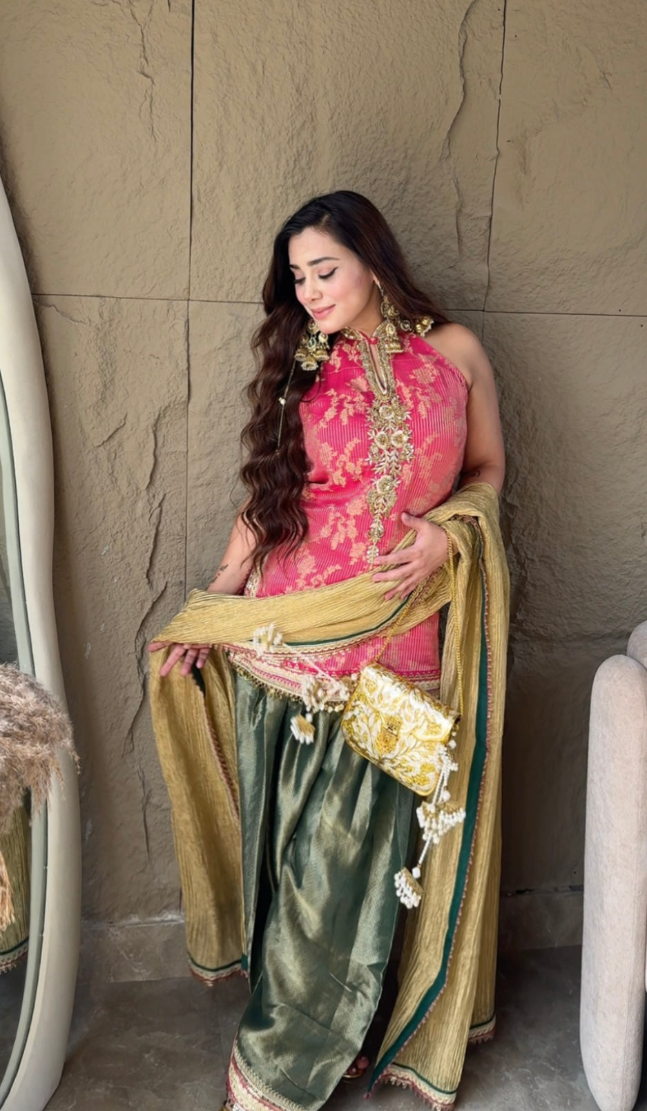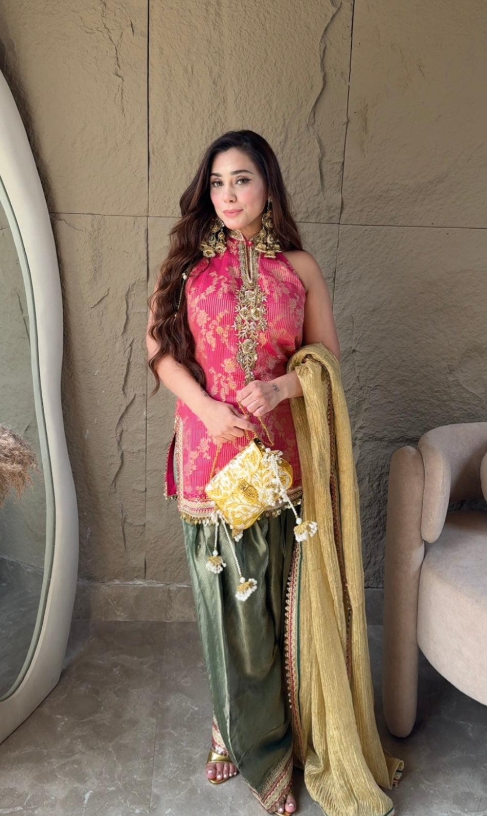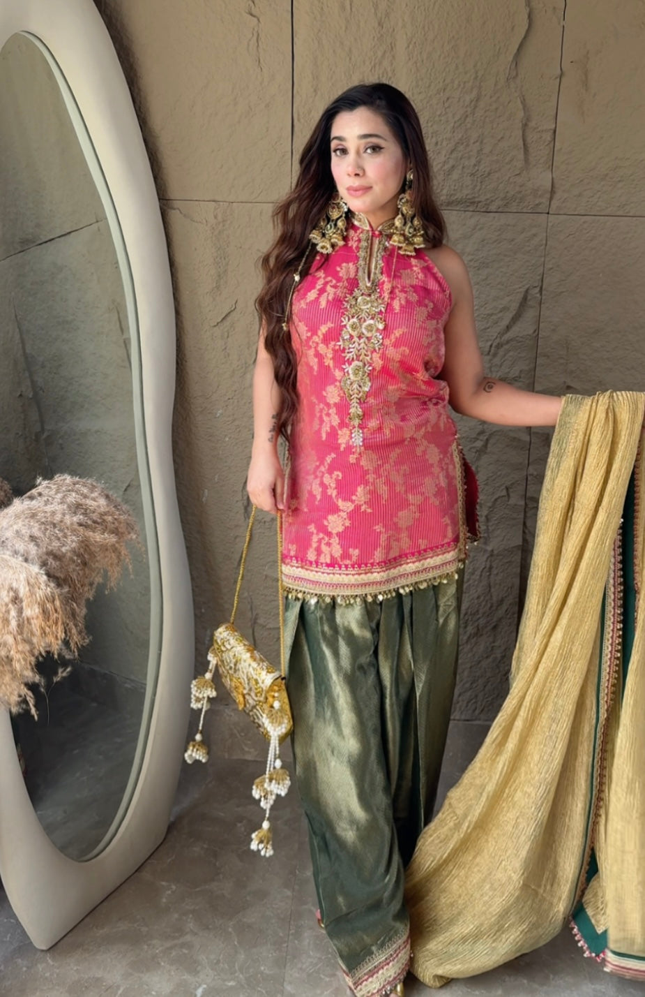A sleeveless rose-pink top crafted in rich brocade silk with embroidery (zardozi and