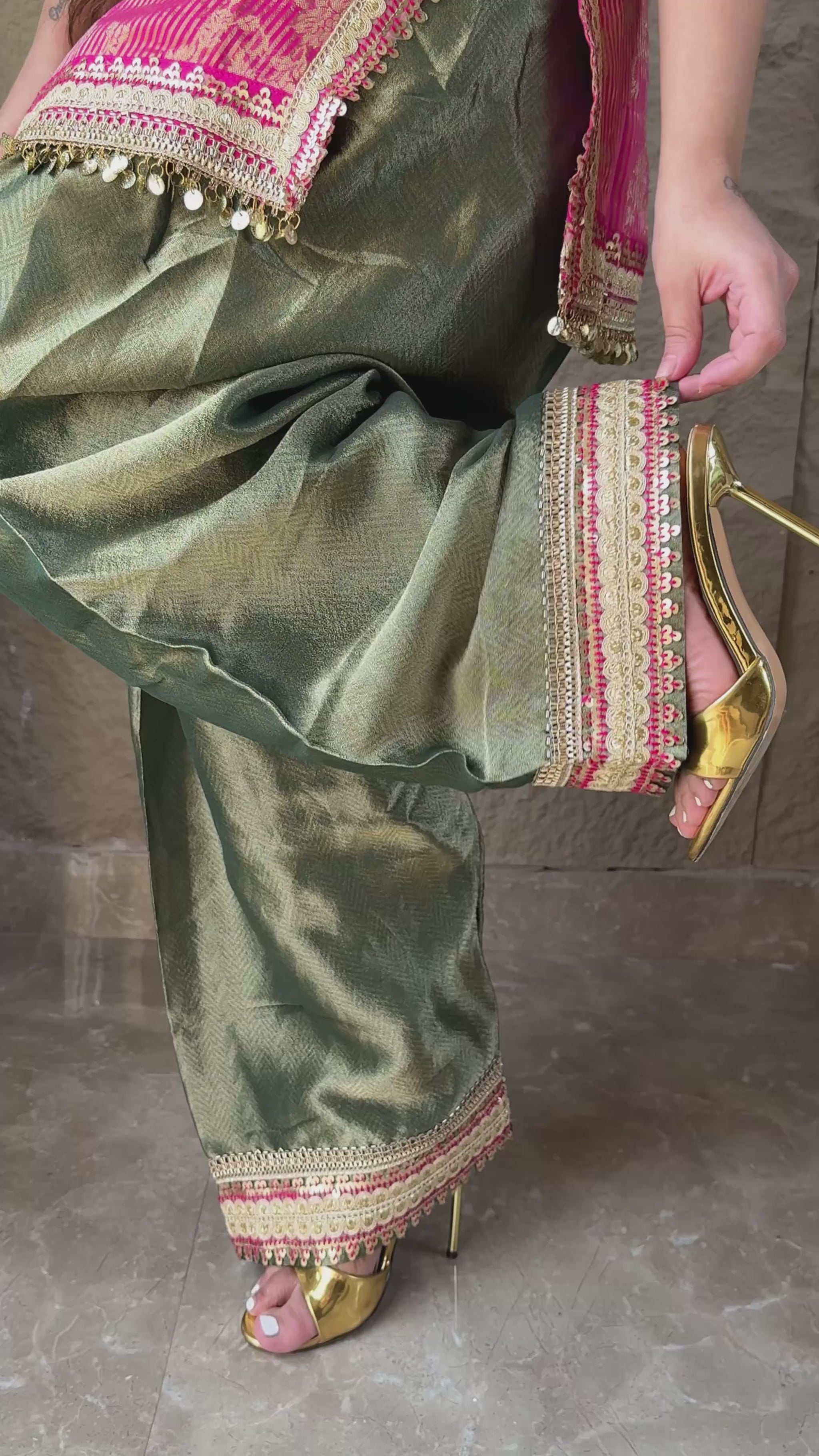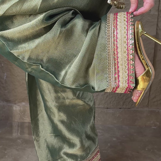 Olive-green wide-legged sharara pants in silk-blend fabric, finished with metallic sheen