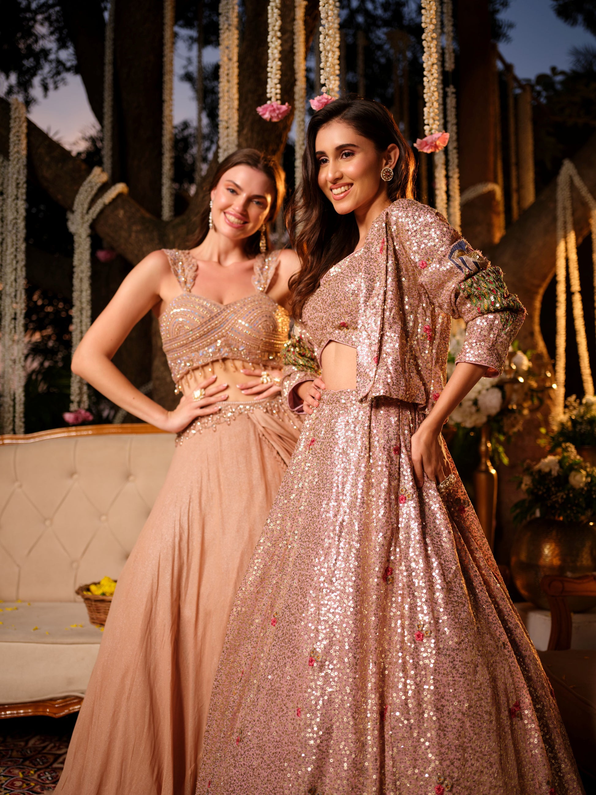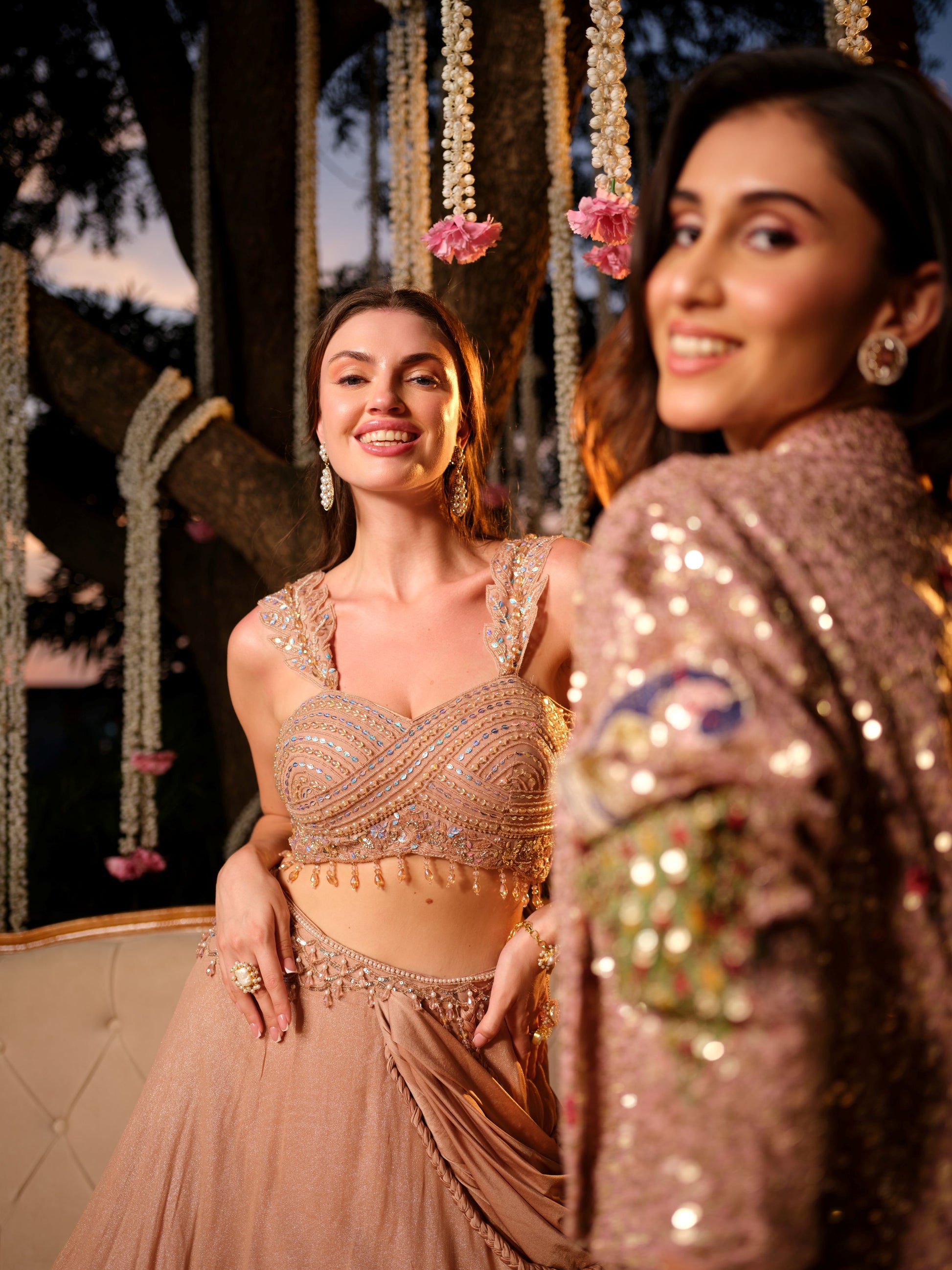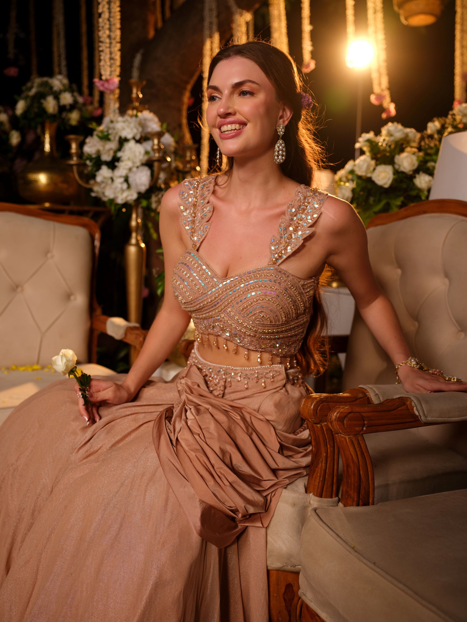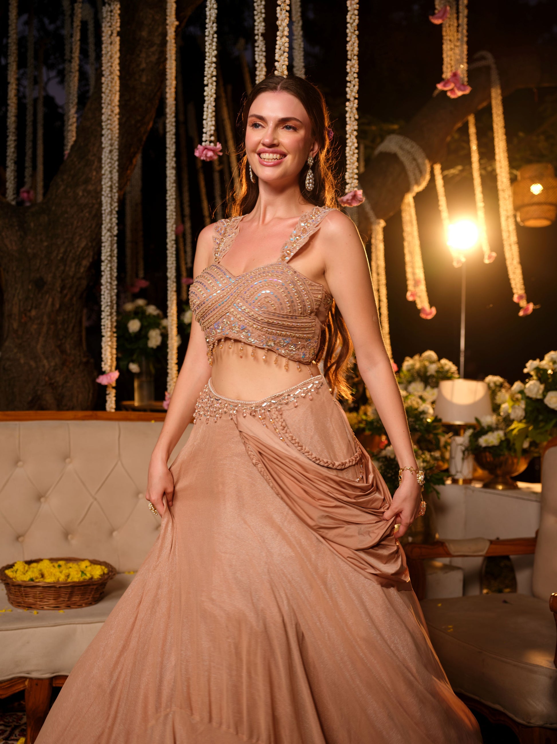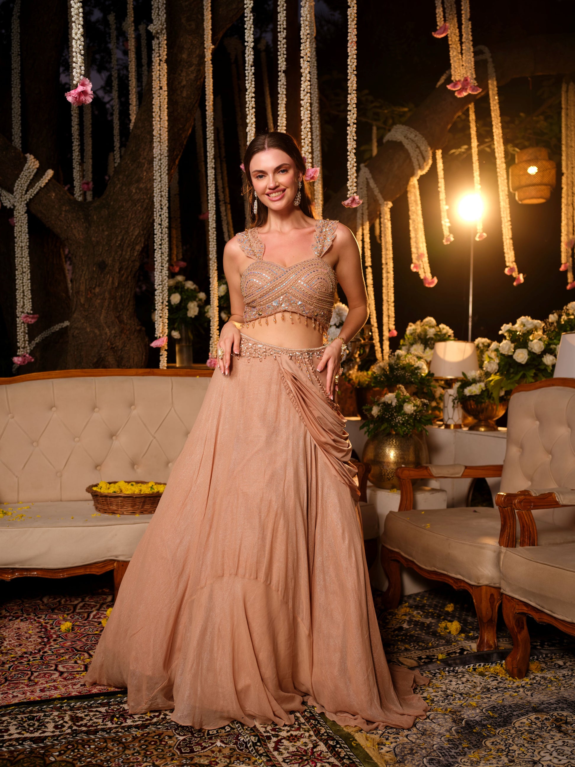 An ethereal nude peach lehenga set that embodies understated sophistication. The intricately embroidered blouse, highlighted with sequins, beads, and tassel edging, pairs beautifully with the fluid draped skirt that falls gracefully to create a soft, romantic silhouette. Lightly embellished with a modern touch, this ensemble is perfect for those who prefer refined glamour.