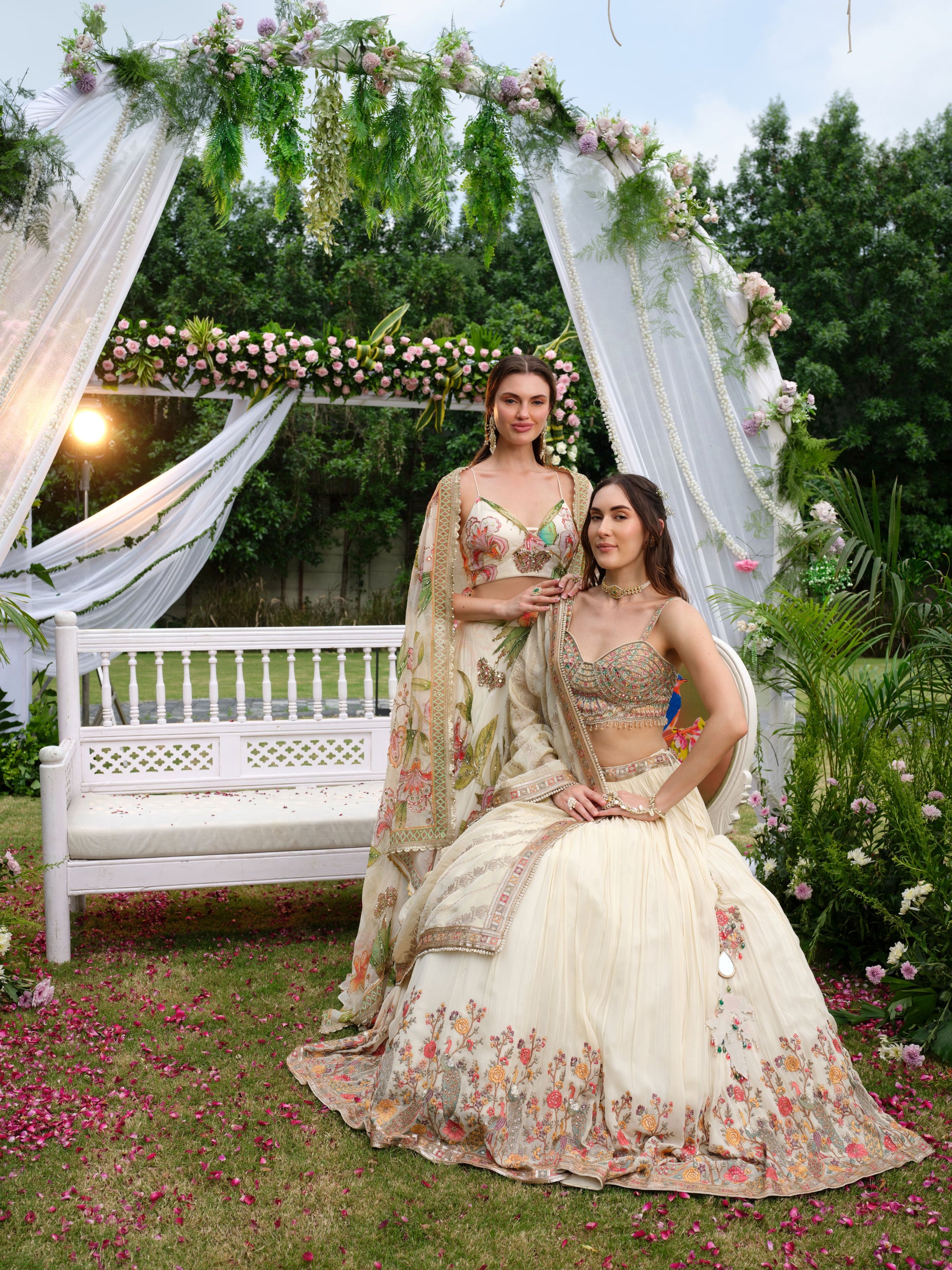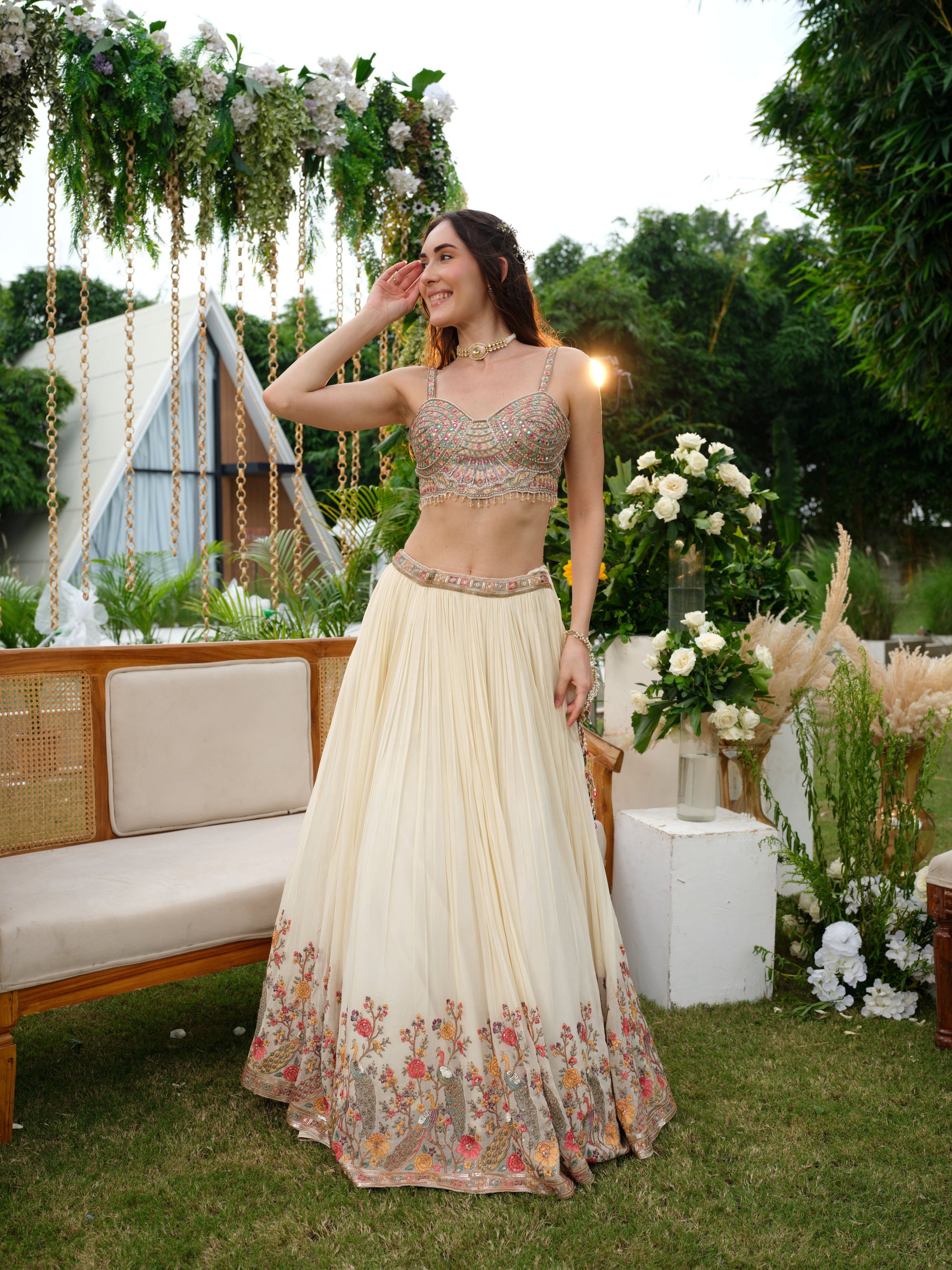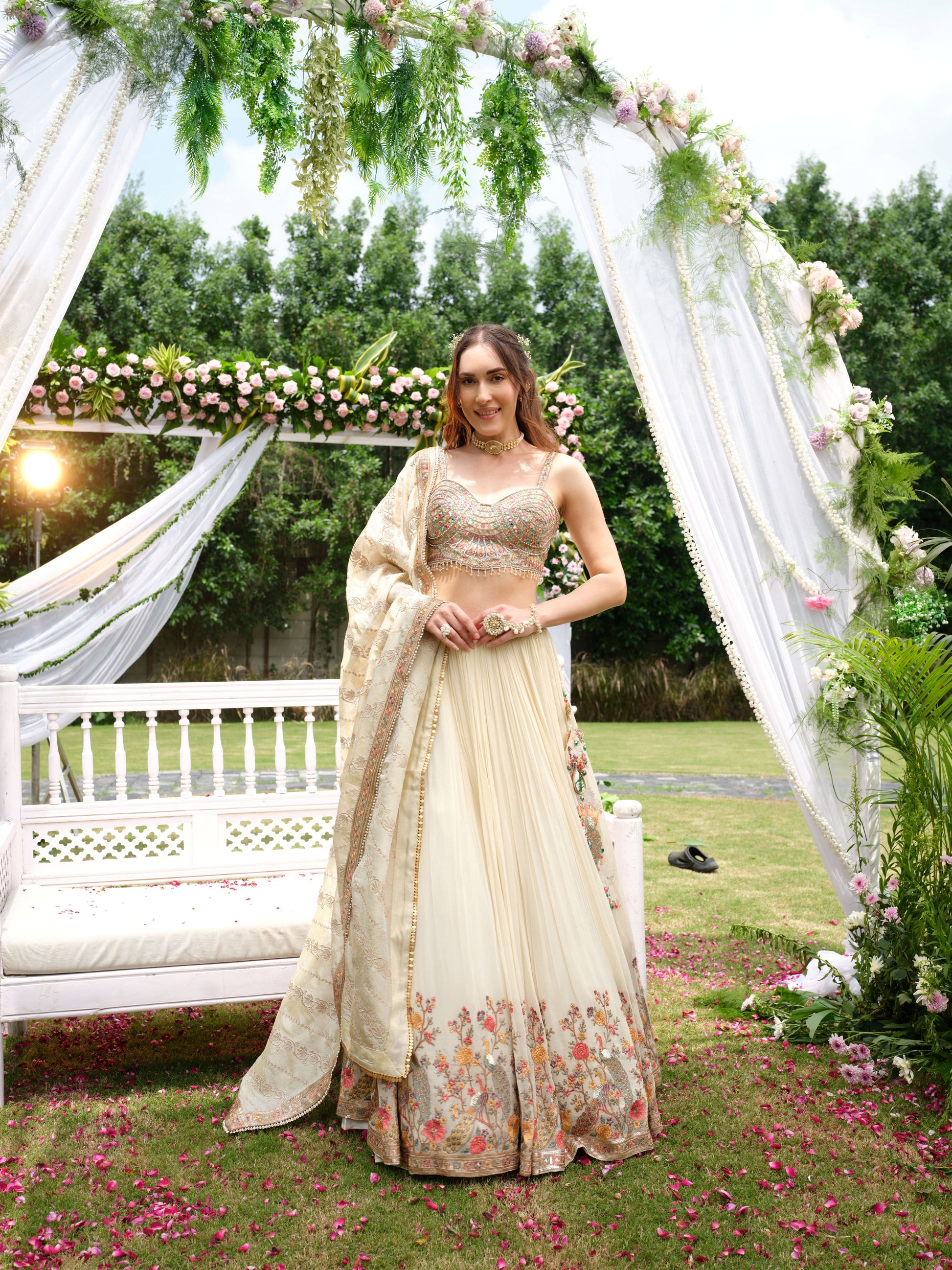 An elegant ivory lehenga adorned with intricate floral embroidery along the hemline, paired with a heavily embellished pastel-hued blouse featuring delicate bead and sequin work. The look is completed with a lightweight dupatta in ivory, detailed with subtle motifs and a shimmering embroidered border, adding a regal charm.