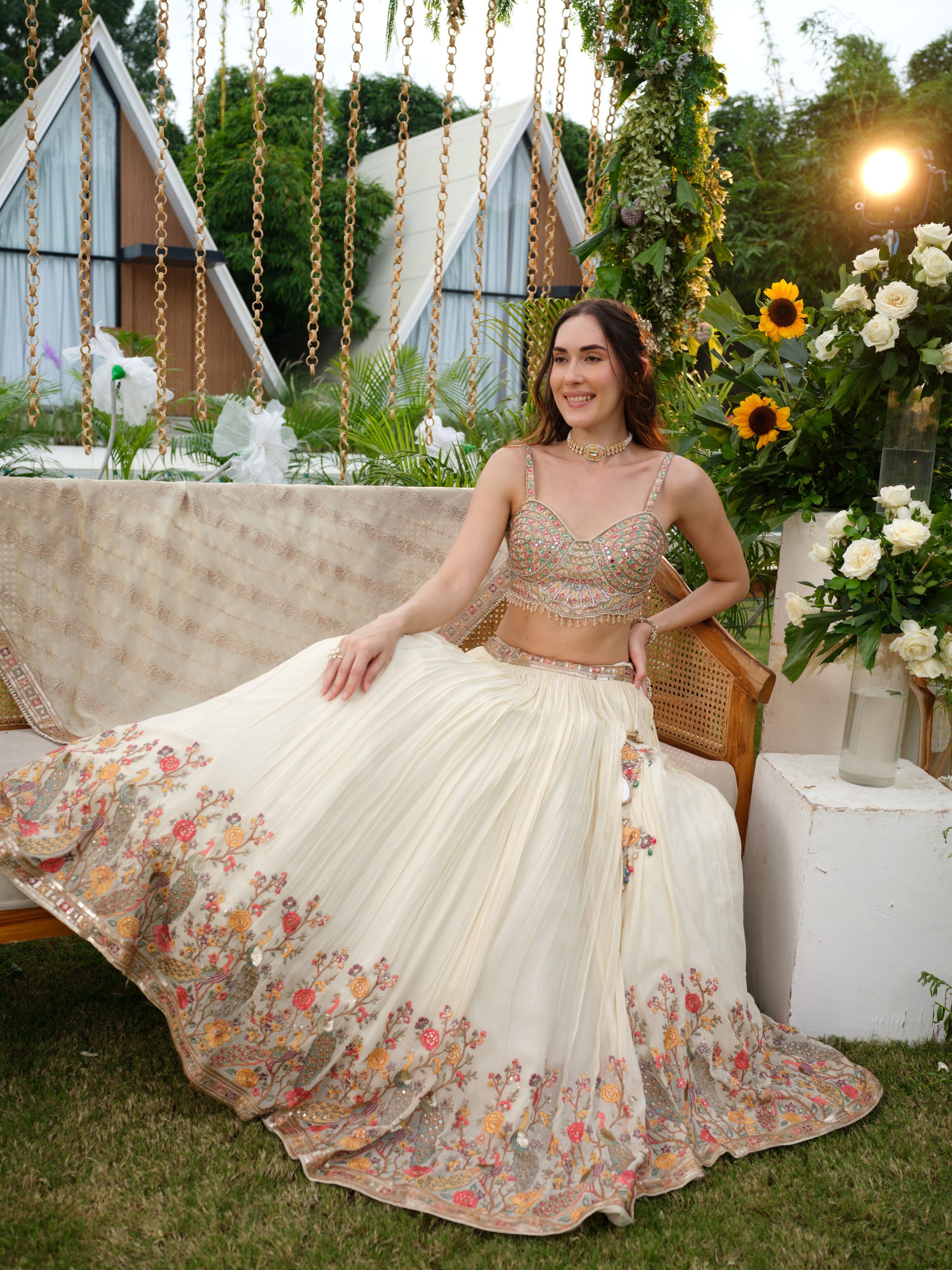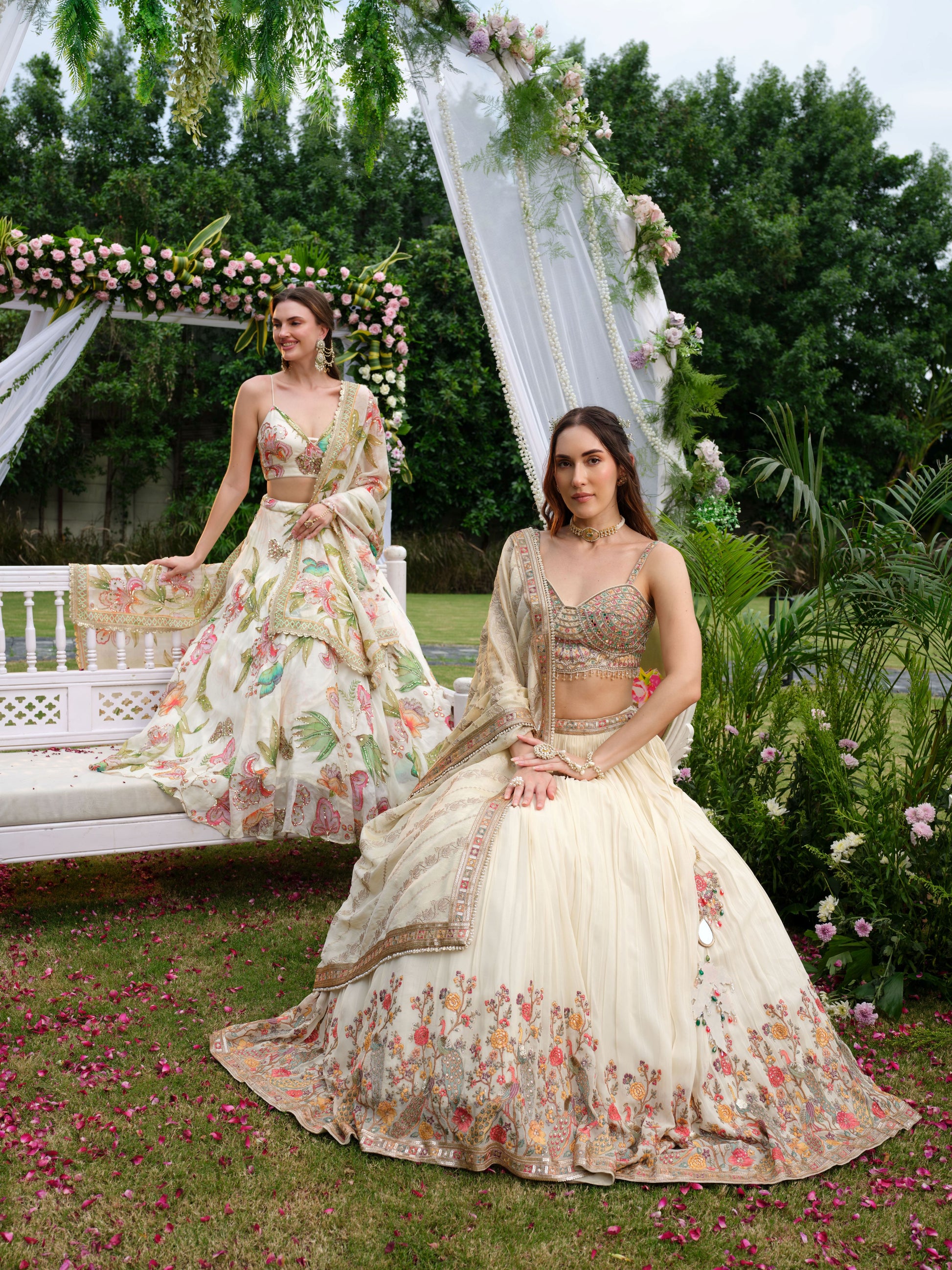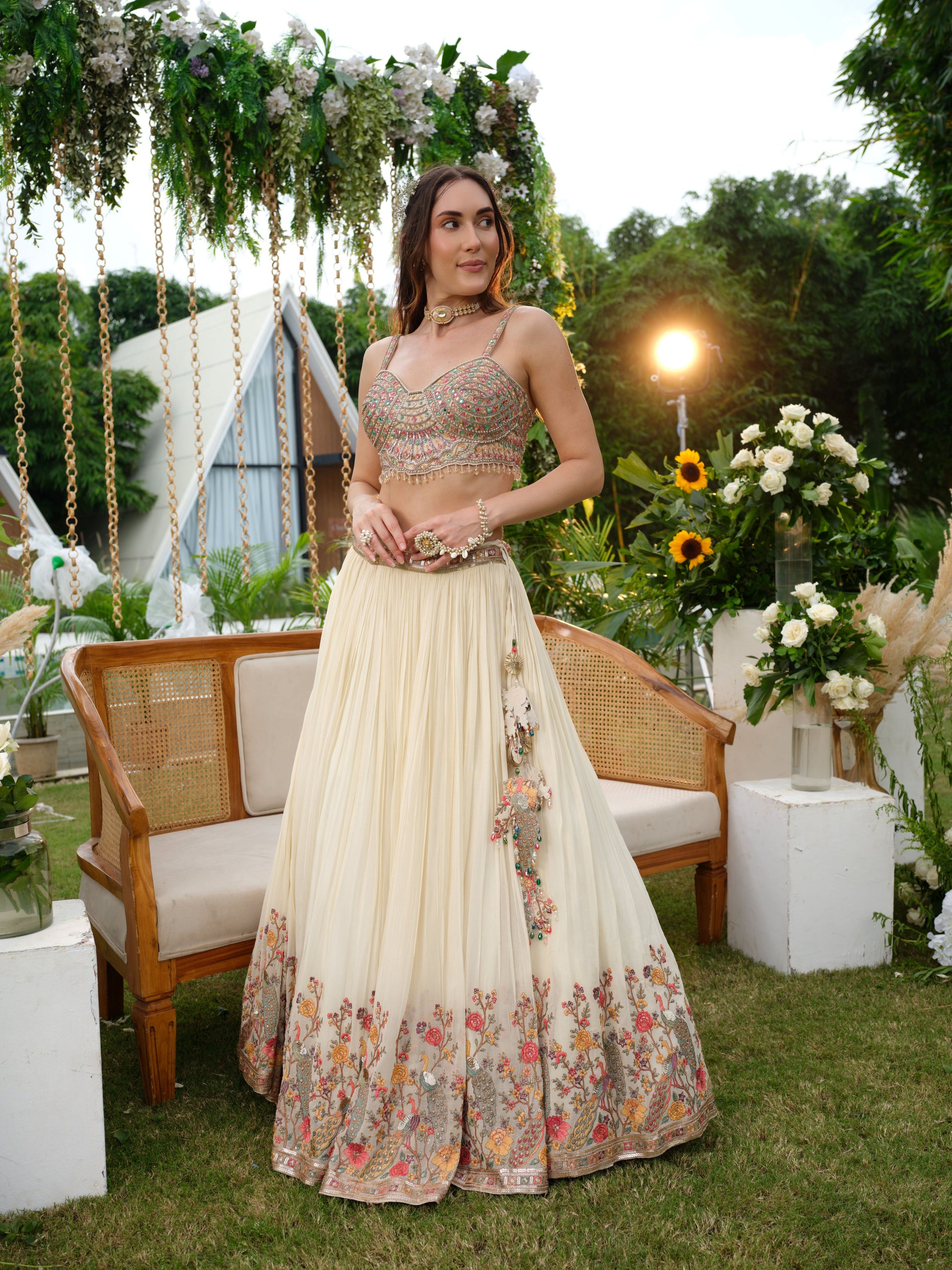 An elegant ivory lehenga adorned with intricate floral embroidery along the hemline, paired with a heavily embellished pastel-hued blouse featuring delicate bead and sequin work. The look is completed with a lightweight dupatta in ivory, detailed with subtle motifs and a shimmering embroidered border, adding a regal charm.