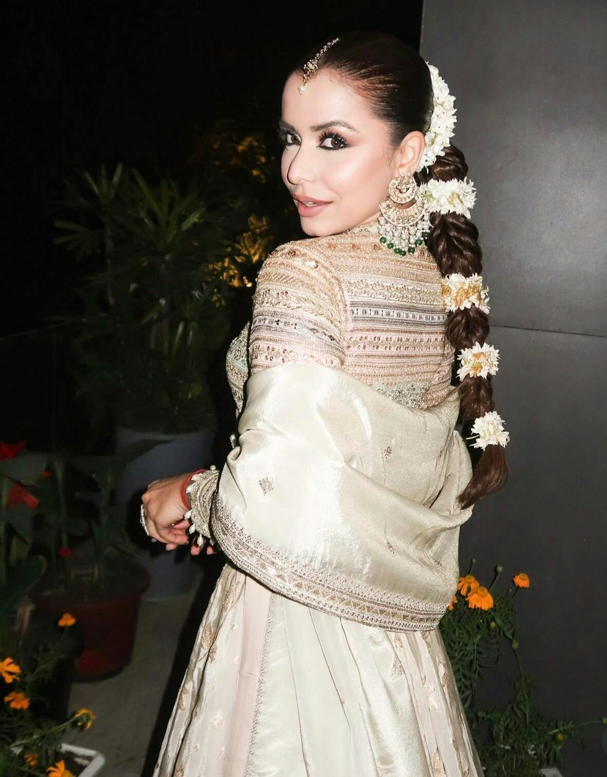 Off-white Banarasi lehenga paired with an elegant jacket, blending traditional craftsmanship with a contemporary touch for a regal, refined look.