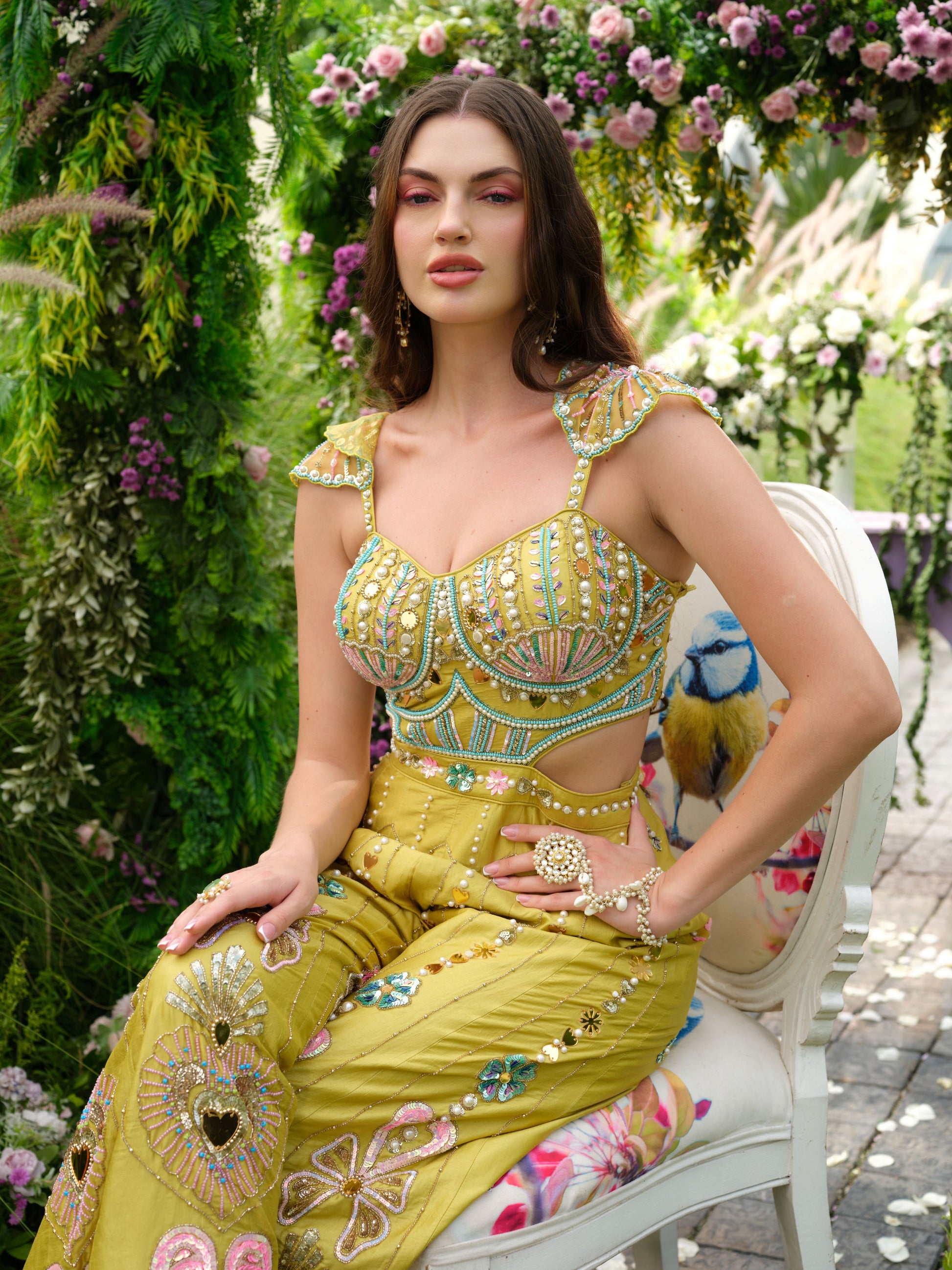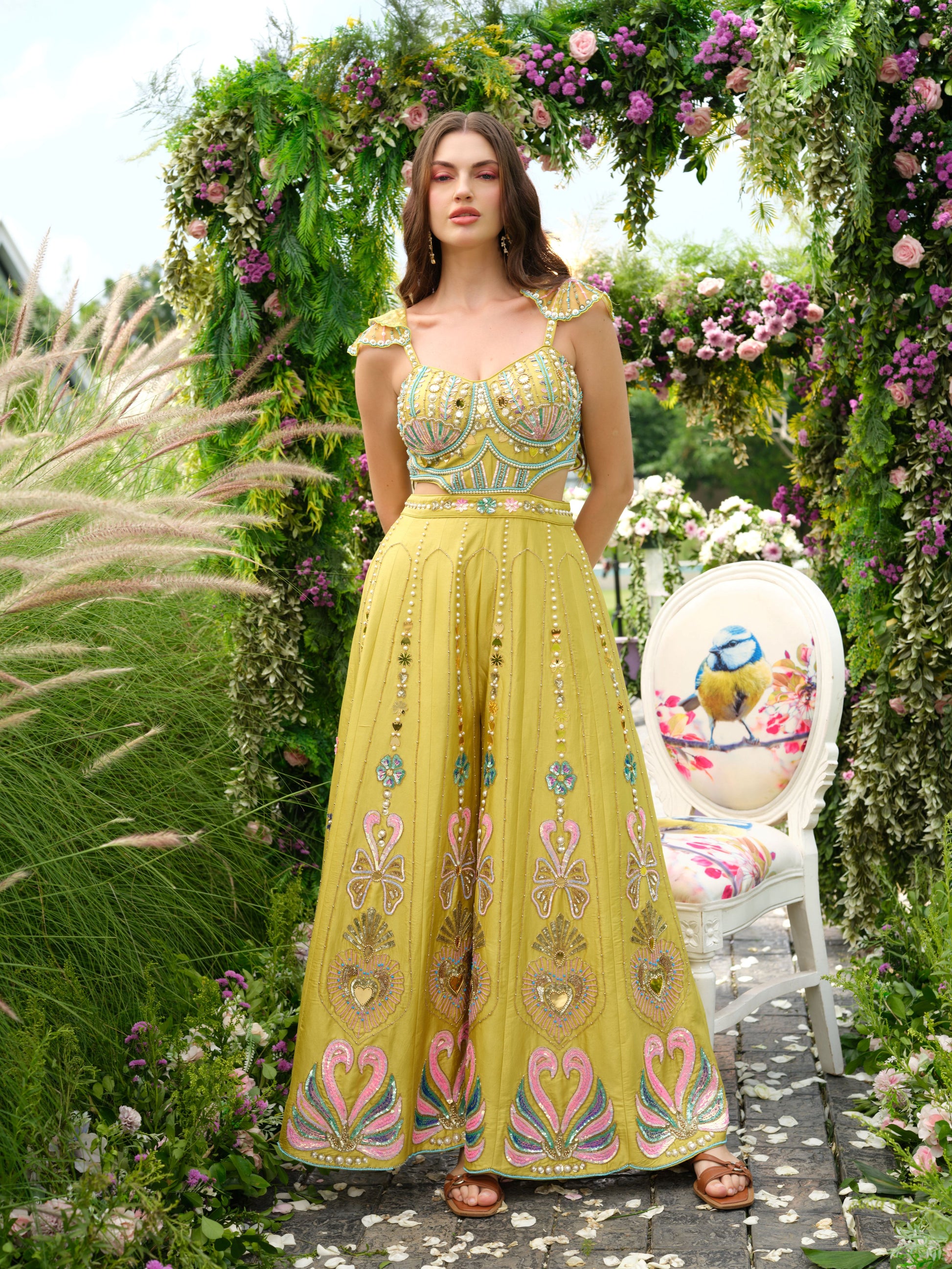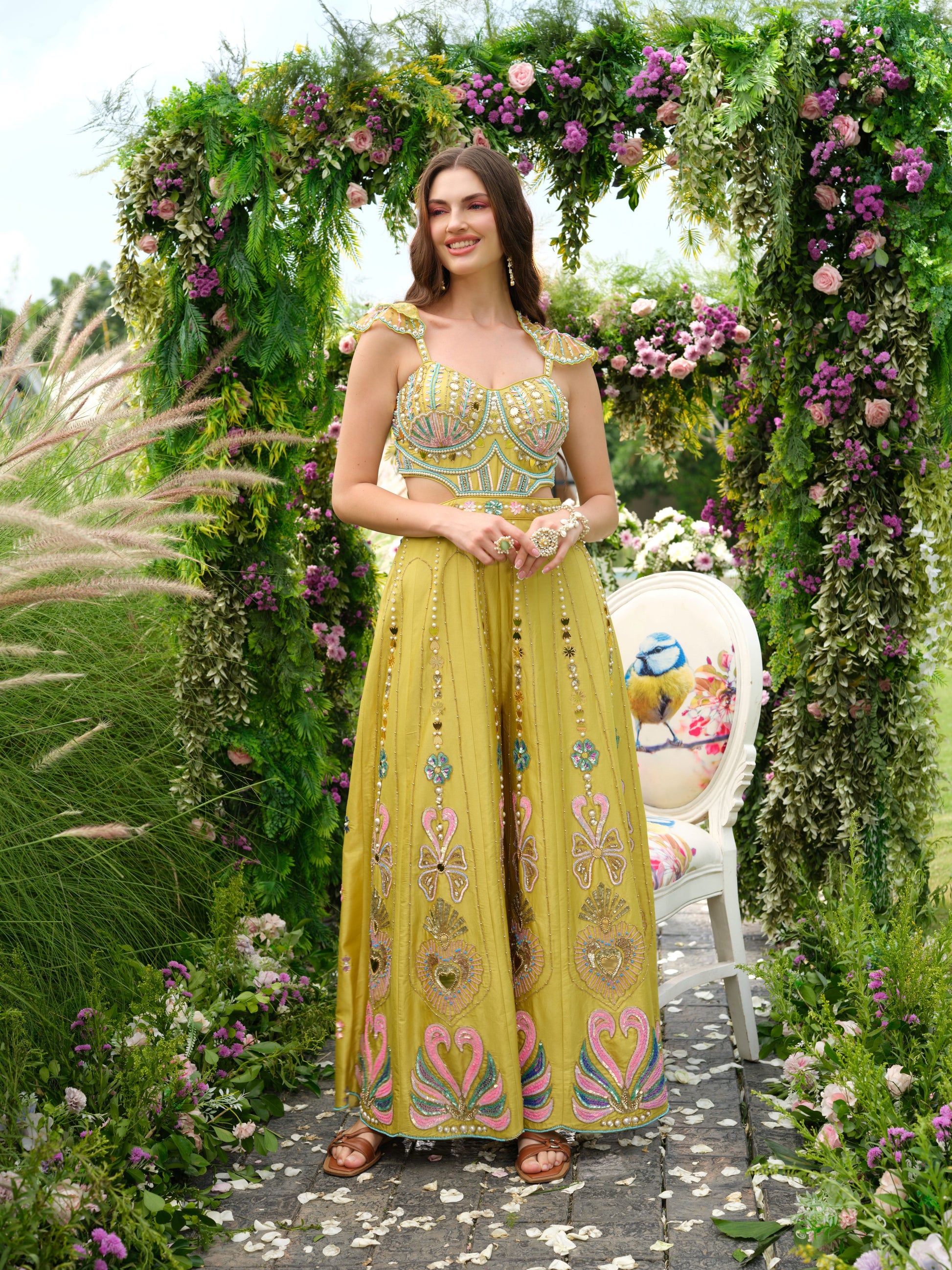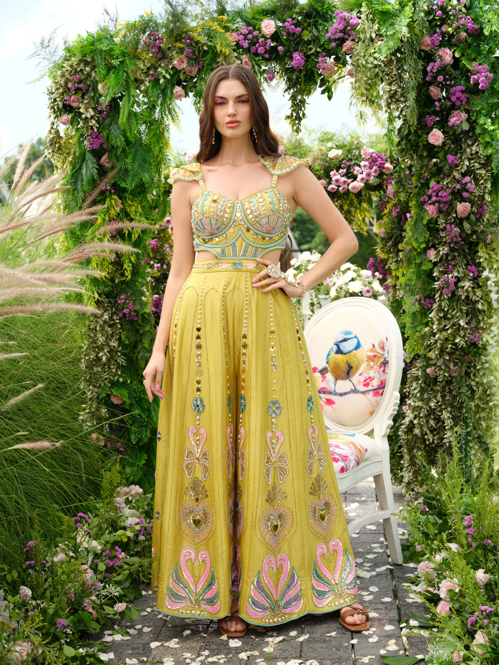 Playful yet regal, this mustard yellow co-ord set features a structured embellished blouse with mirror and bead detailing, paired with wide-legged bottoms adorned with colourful embroidered motifs. The fusion of bold hues and intricate craftsmanship makes it a standout choice for mehendi, haldi, or festive celebrations filled with joy and vibrance.