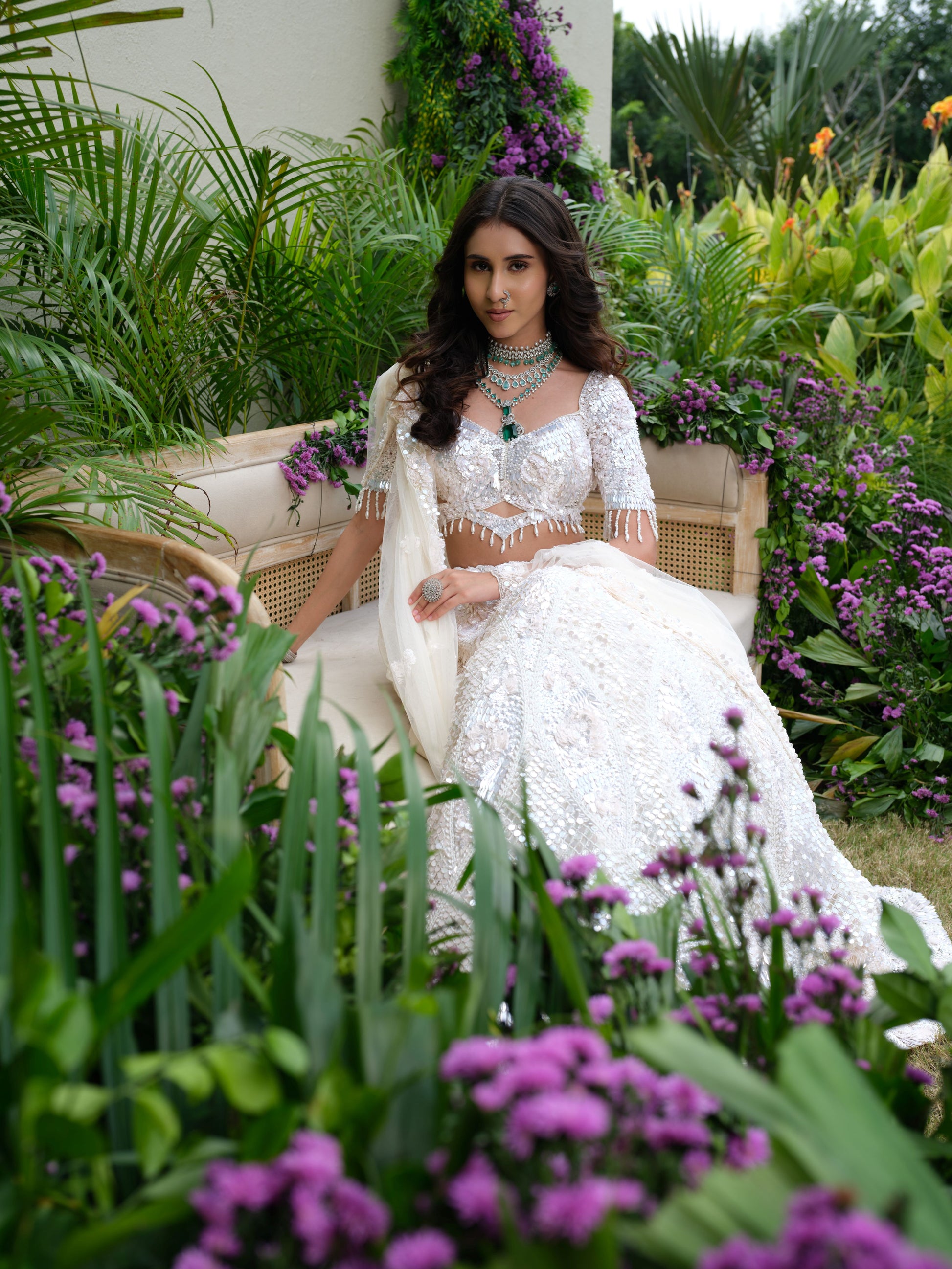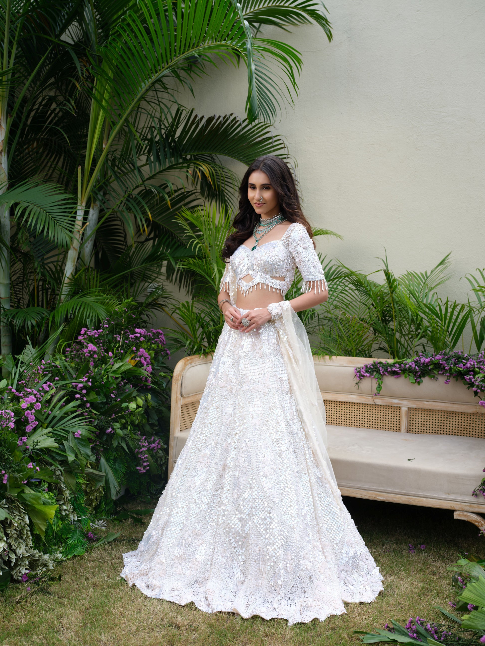 An ethereal ivory lehenga set, richly adorned with reflective mirror work and intricate sequin embroidery. The blouse features a modern design with delicate tassel details on the sleeves, while the flared skirt shimmers with a dazzling play of light. Paired with a sheer dupatta, this look blends traditional craftsmanship with contemporary elegance.