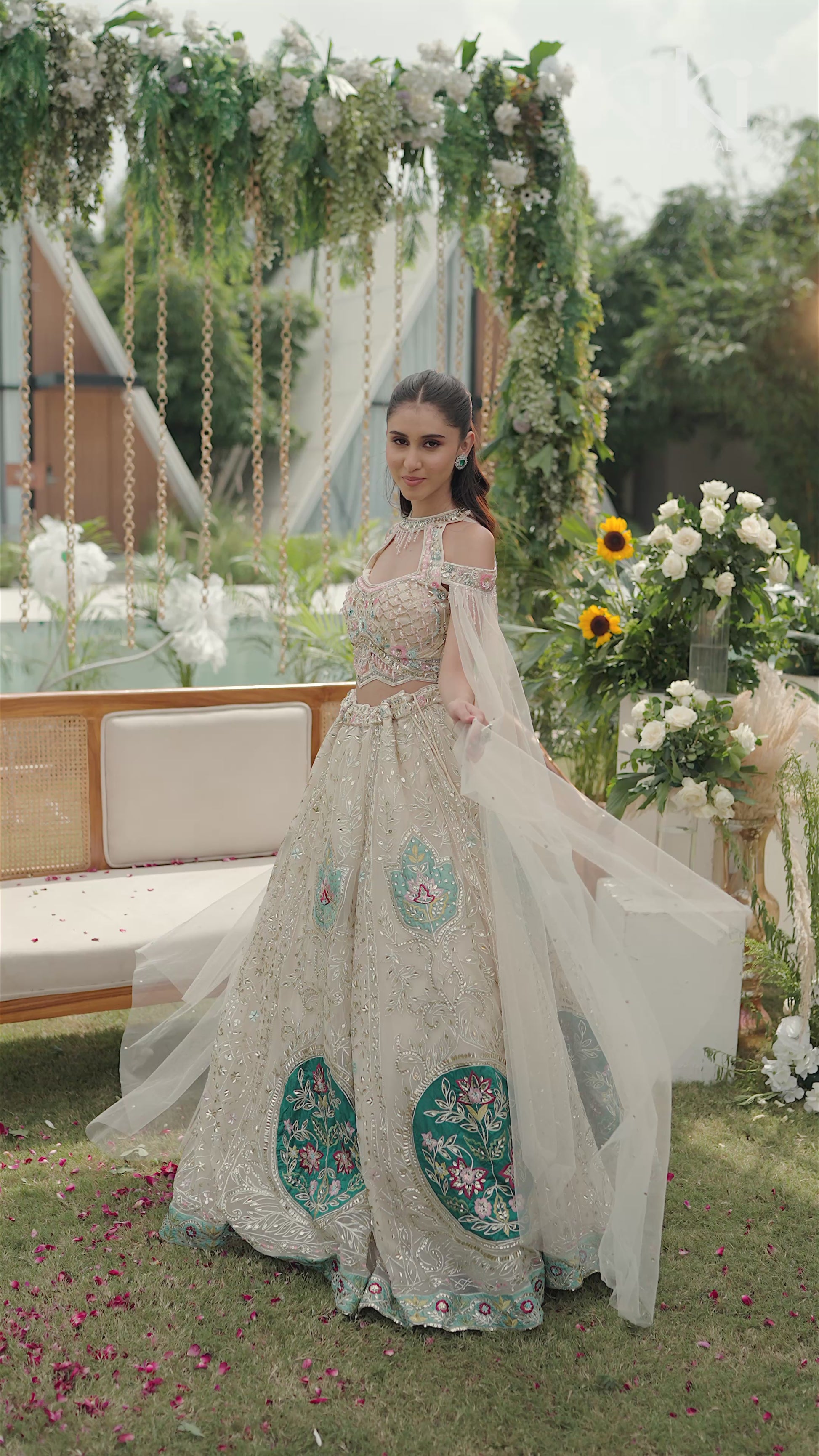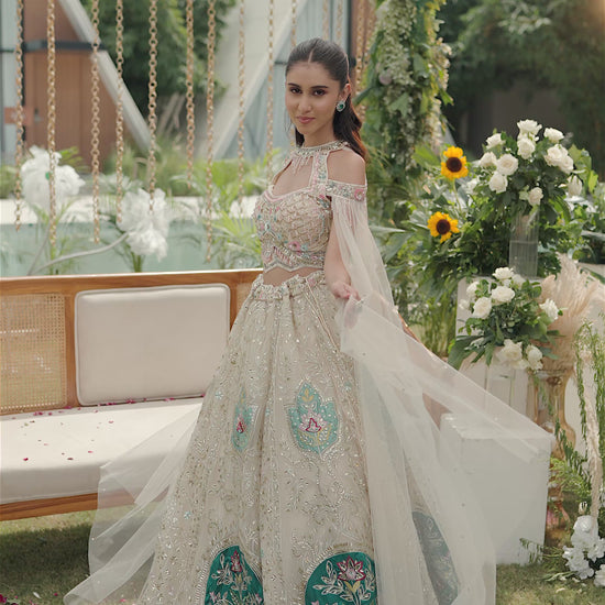 Elegance takes center stage with this ivory lehenga set accented with teal embroidery. The lehenga features intricate sequin and zari work, beautifully highlighted with bold teal floral panels that bring a striking contrast. The delicately embroidered blouse and sheer dupatta with subtle detailing add finesse, making this ensemble a true blend of tradition and modern artistry.